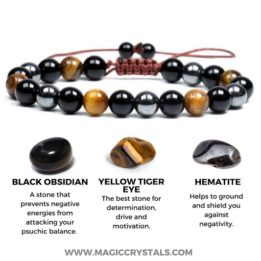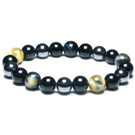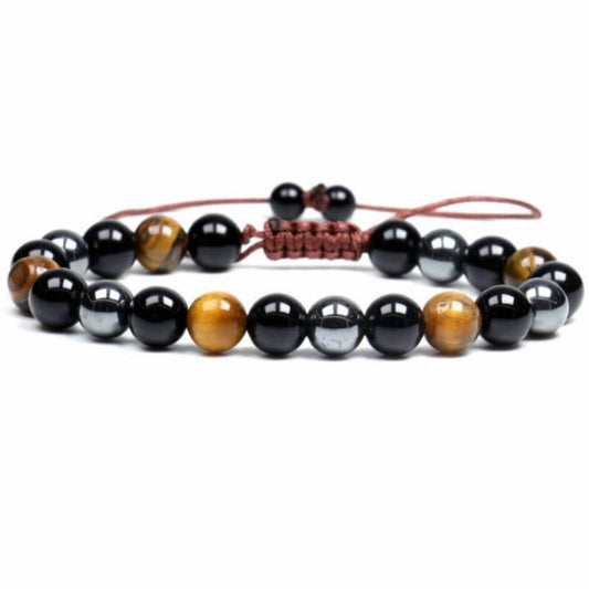 Triple Protection Bracelet - Adjustable Natural Dreamy Tiger Eye, Black Obsidian and Hematite Beads
