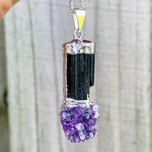 Black Tourmaline and Amethyst Dangle Pendant Necklace