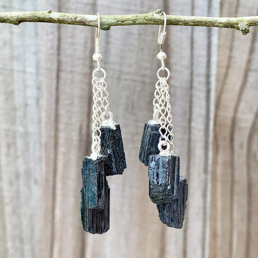 Raw Black Tourmaline Triple Stone Dangle Earrings