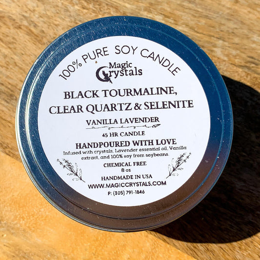 PROTECTION - Vanilla Lavender and Clear Quartz, Selenite and Black Tourmaline Candle, 8 oz