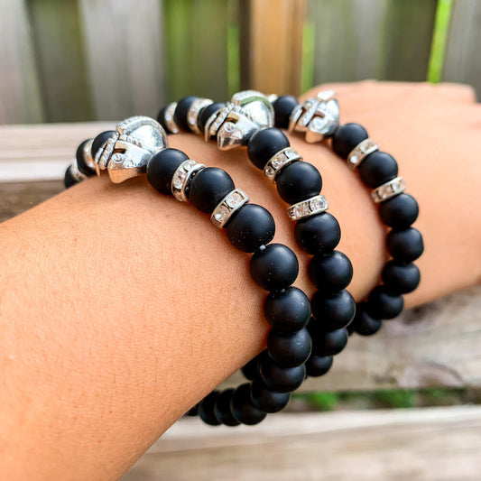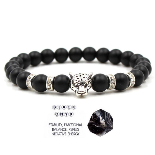 Black Onyx Matte Stone Silver Leopard Bracelet