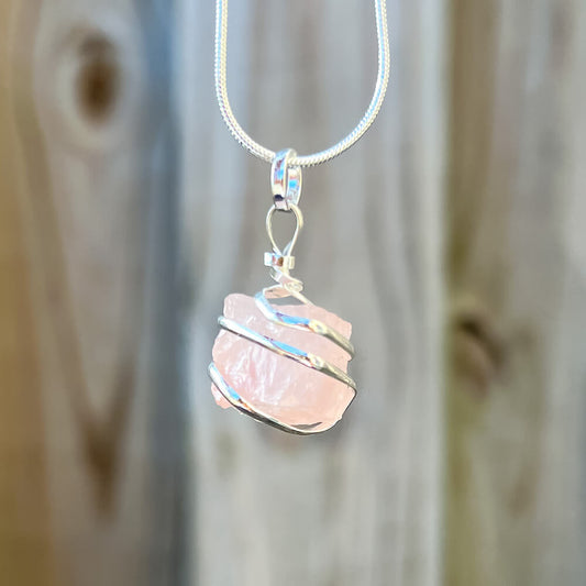 Rose Quartz Cube Spiral Wrapped Pendant Necklace