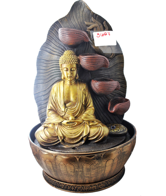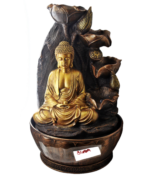 Buda de oro manos en las rodillas cascada agua pétalos de flores