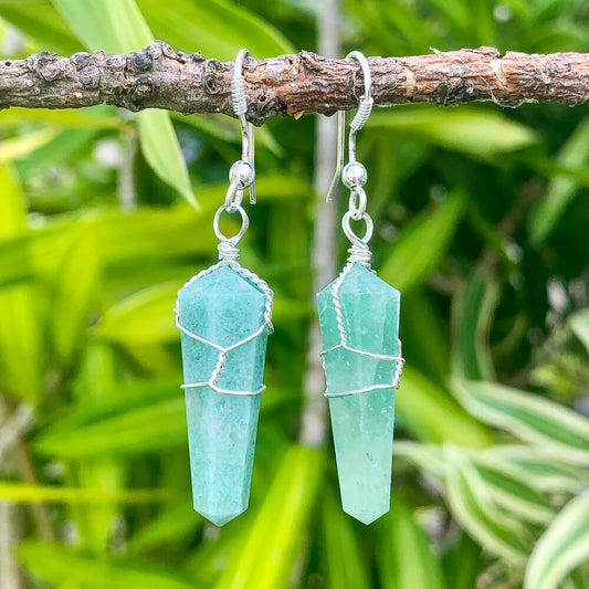 Aretes de doble punta envueltos con alambre de piedra de aventurina verde