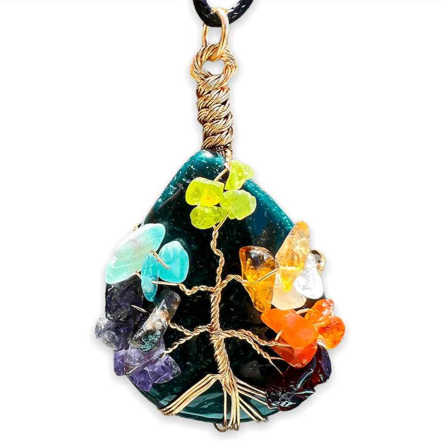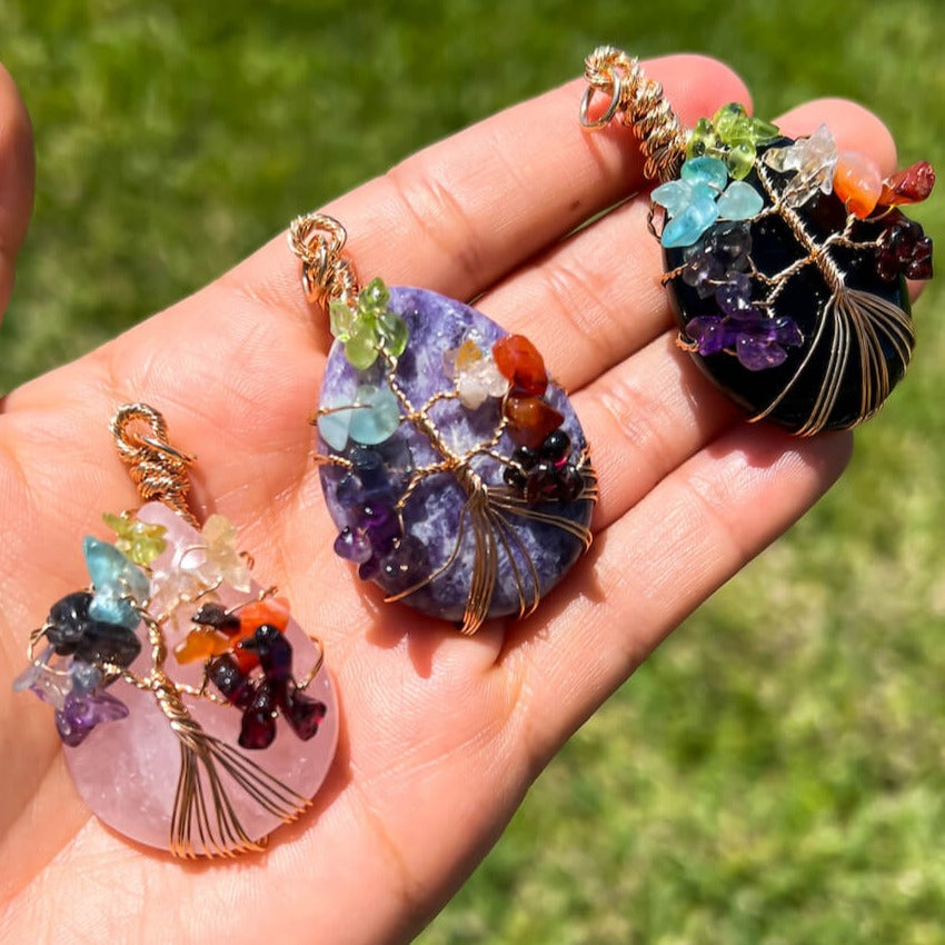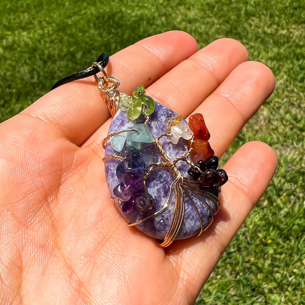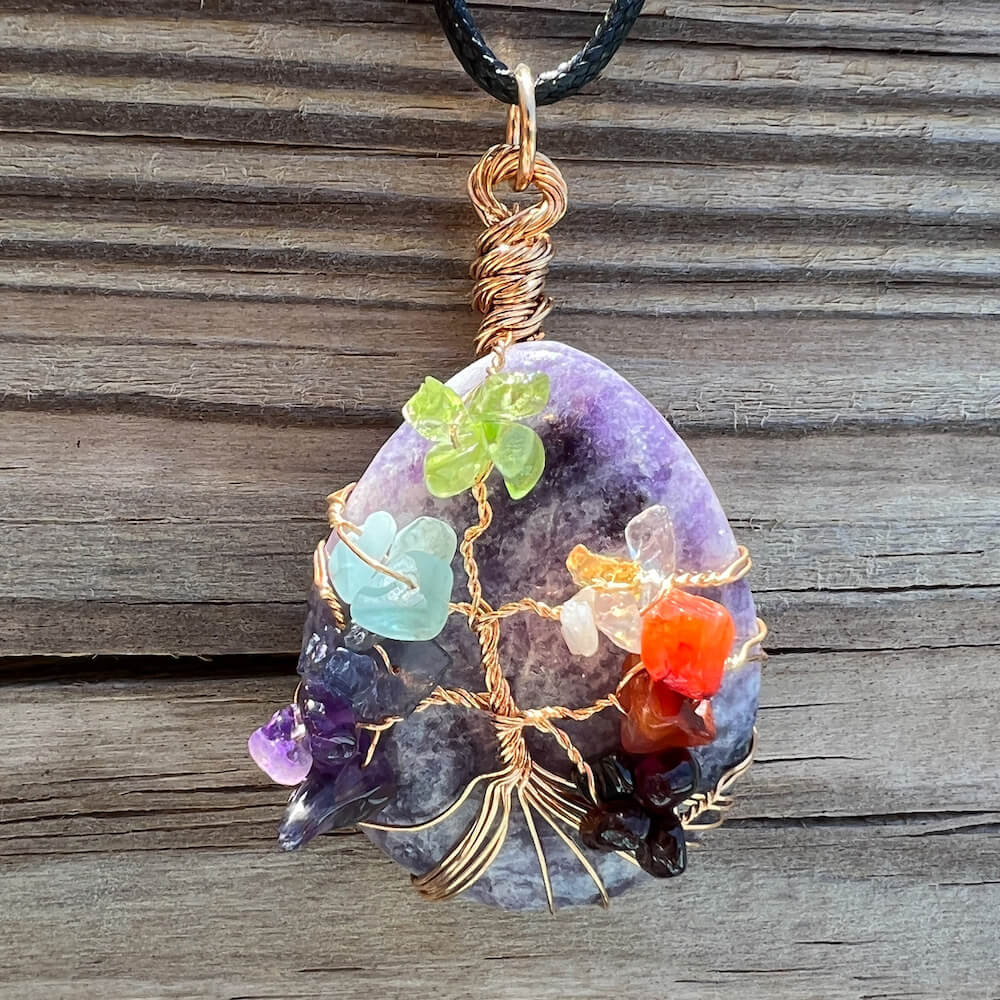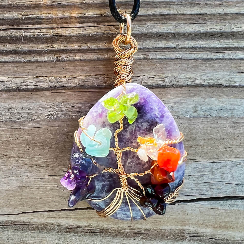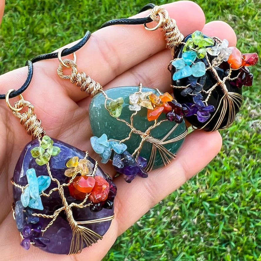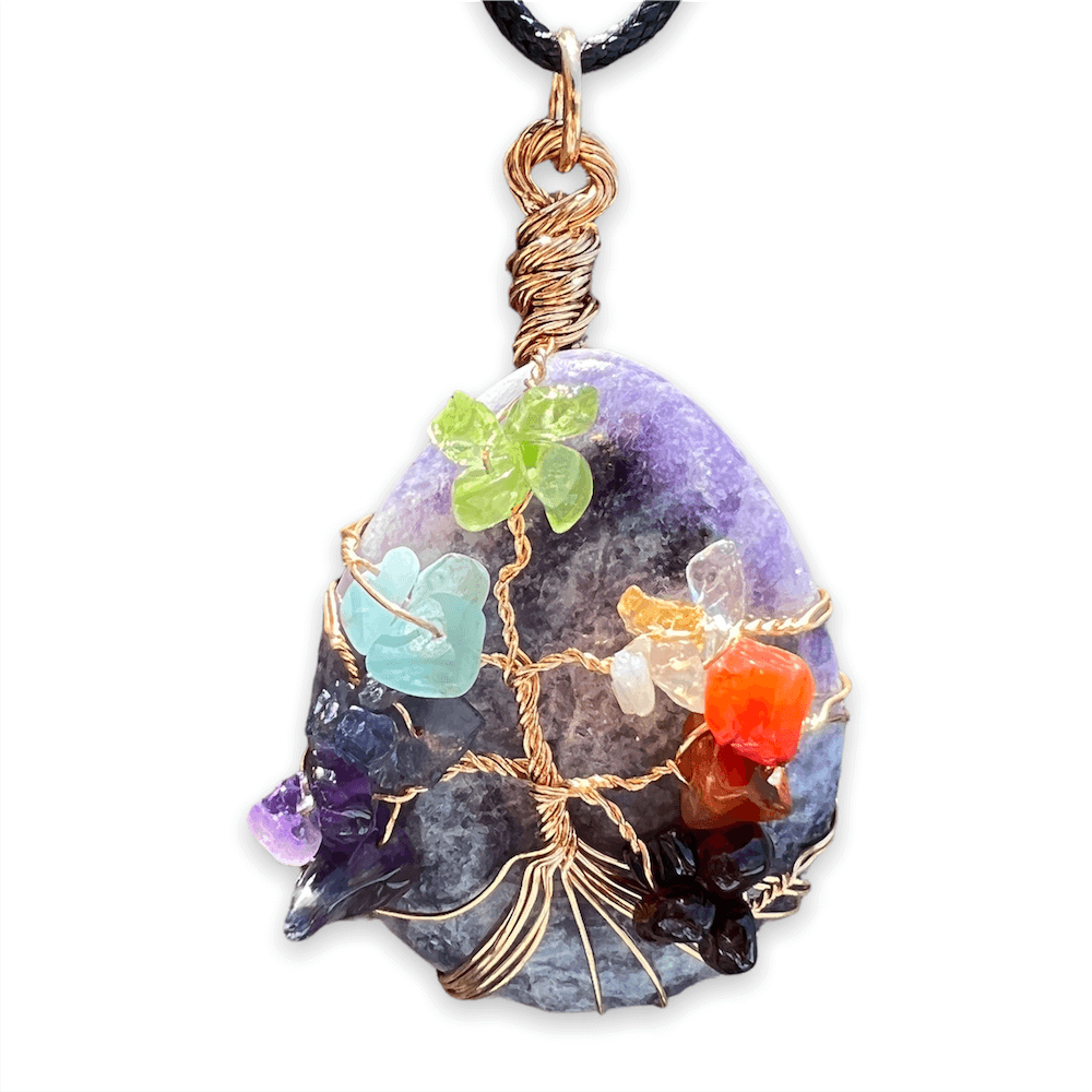 Collar con gota de árbol de la vida de 7 chakras y amatista