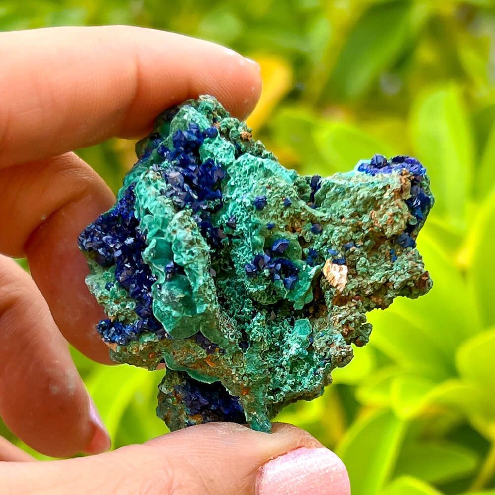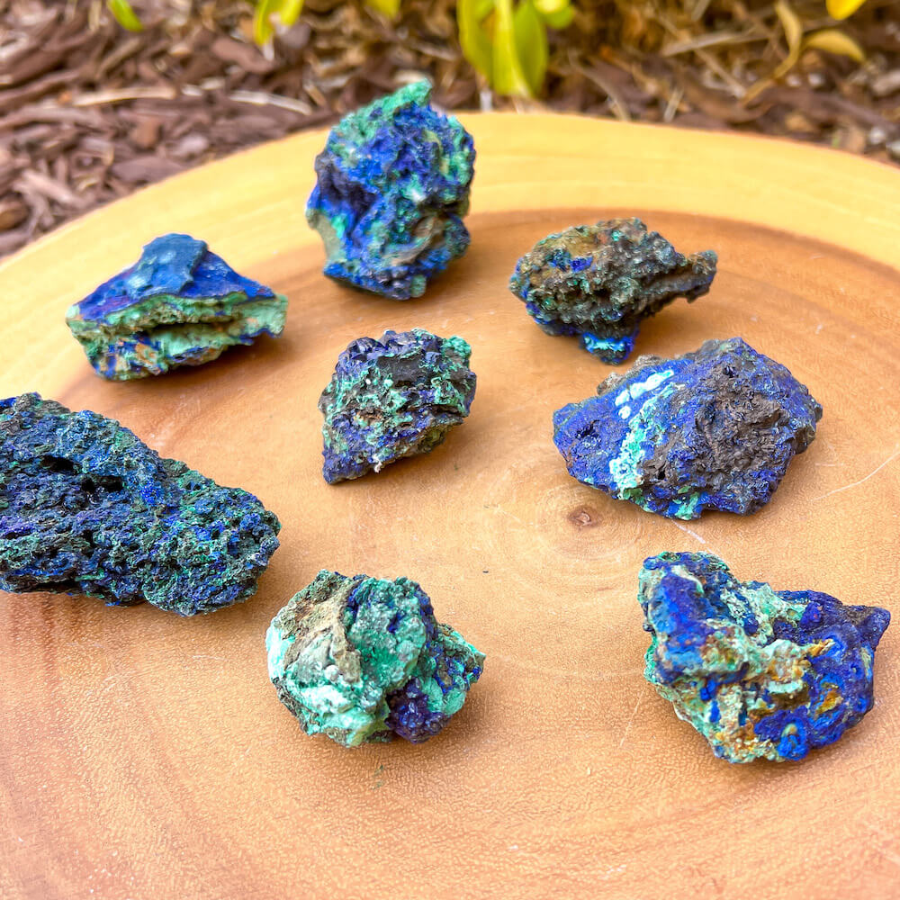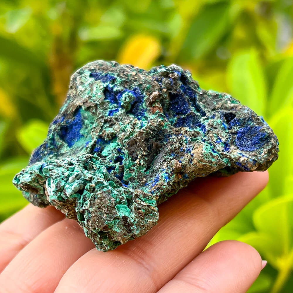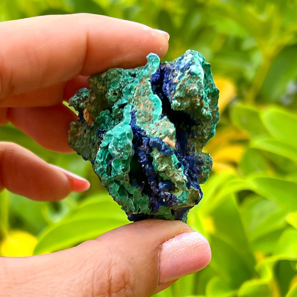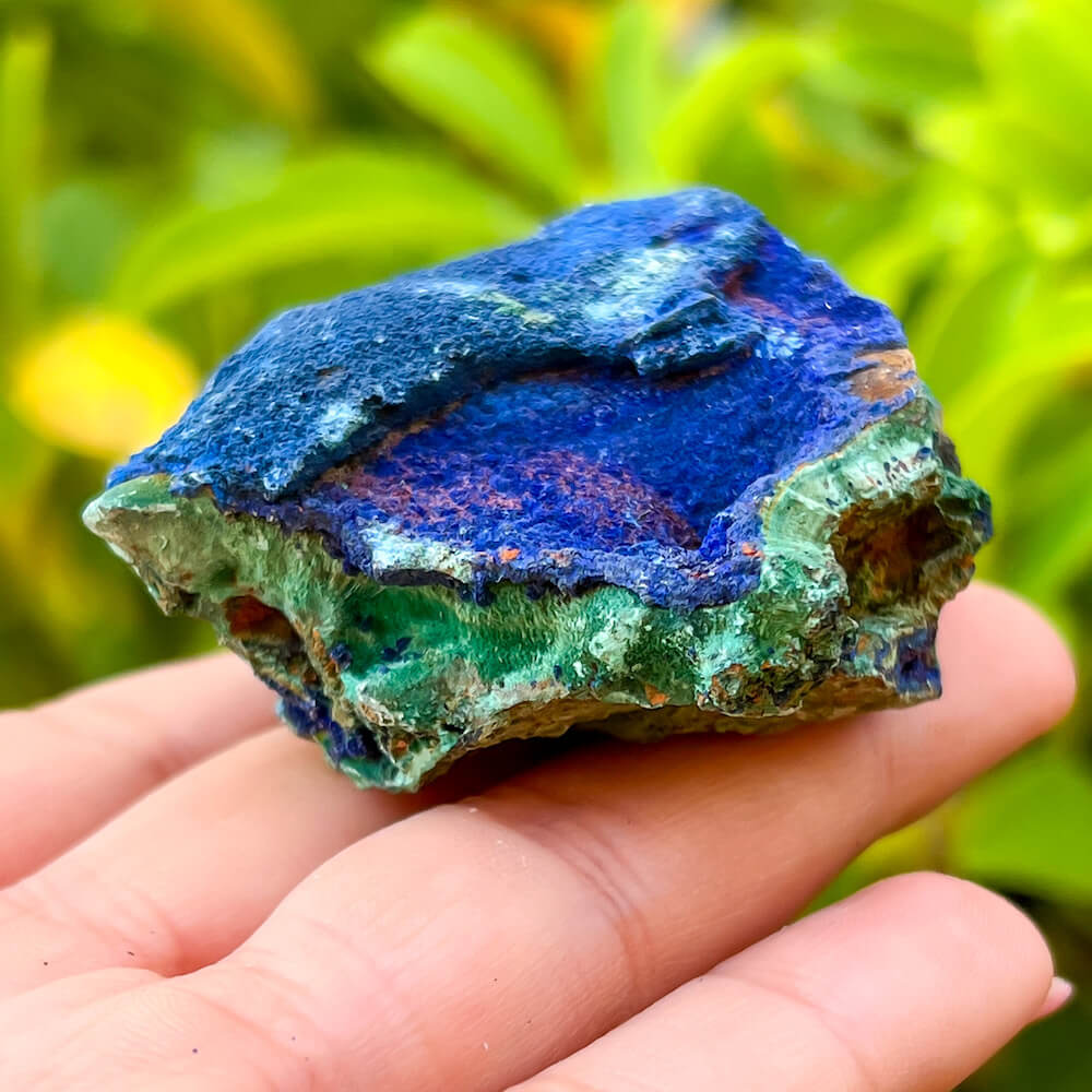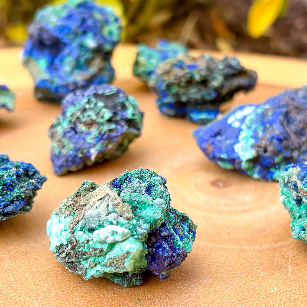 Unidos como azurita-malaquita, se cree que este mineral combina diferentes rasgos, refresca la visión de la vida del usuario y disuelve las características egocéntricas; disipando la presunción, la arrogancia y la vanidad y mejorando la flexibilidad en el movimiento y el pensamiento. Expande la conciencia, crea un equilibrio emocional y activa un escudo protector contra las fuerzas negativas u hostiles.
