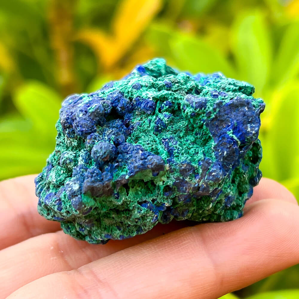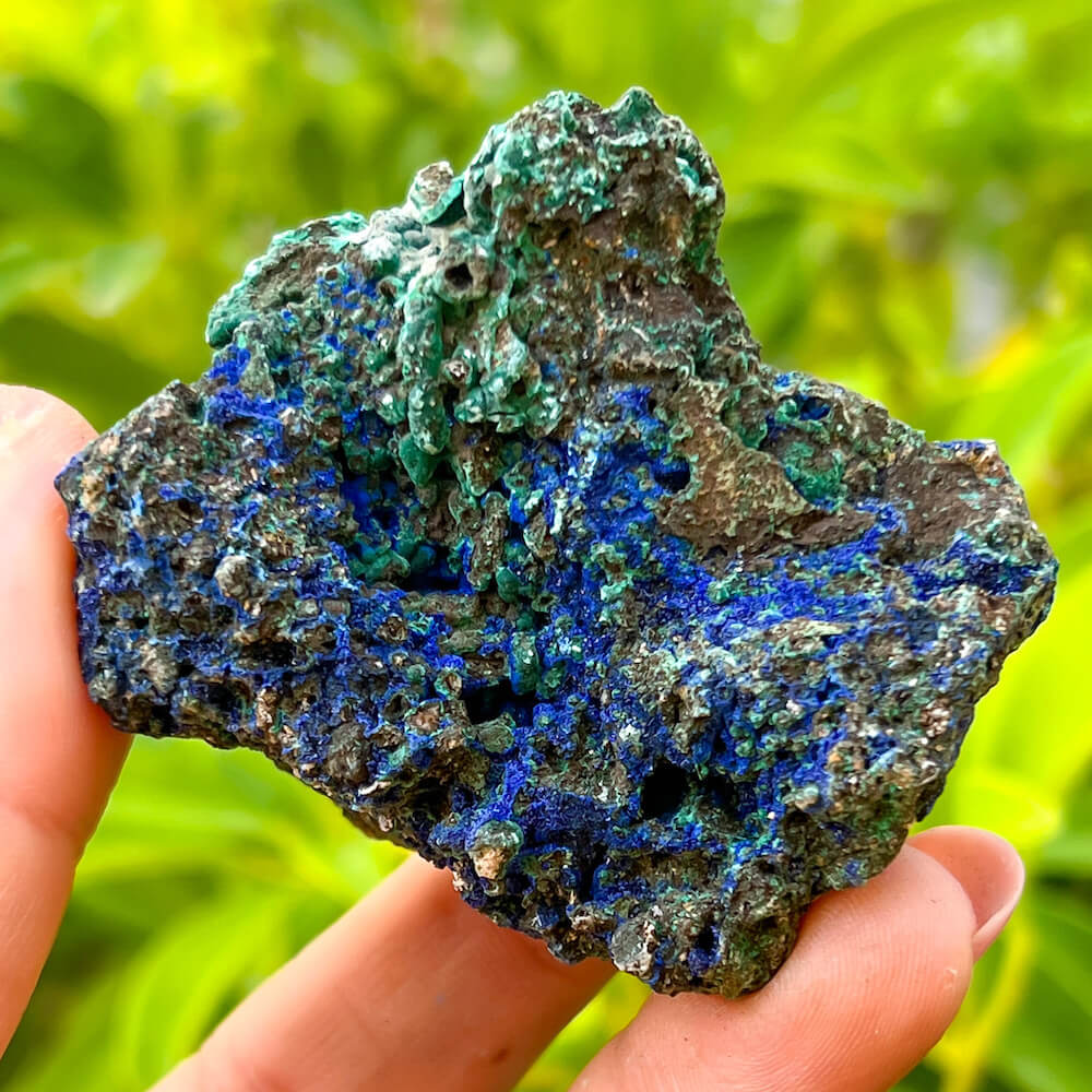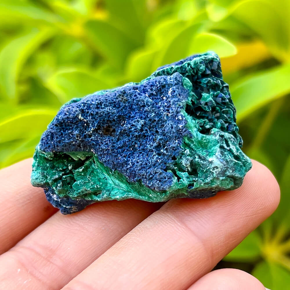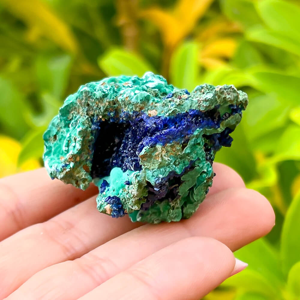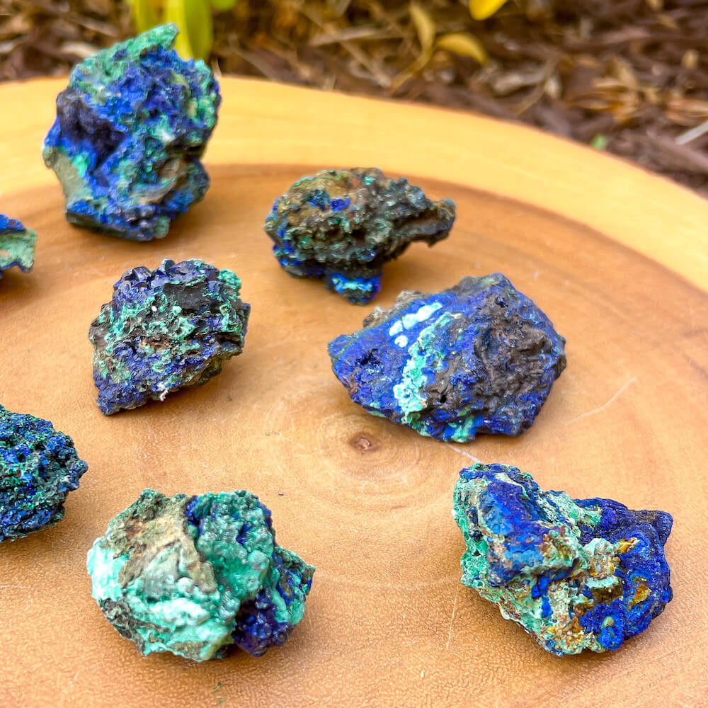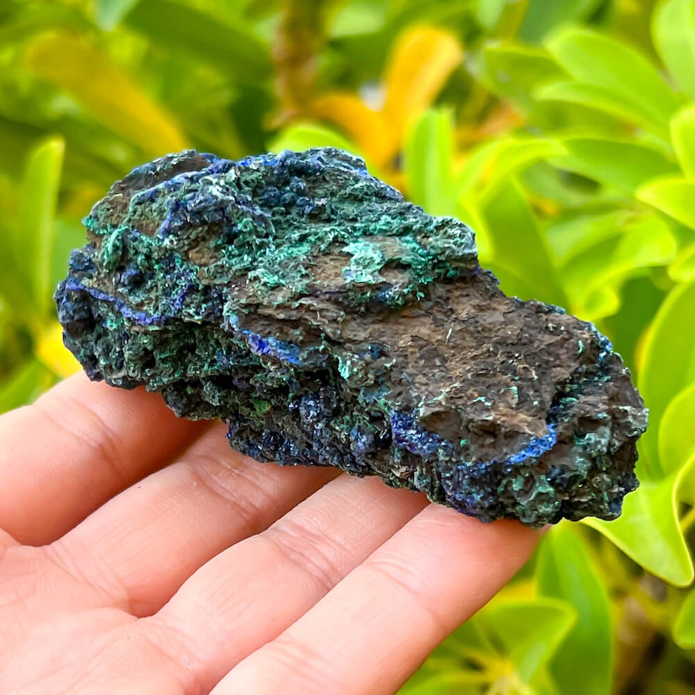 Unidos como azurita-malaquita, se cree que este mineral combina diferentes rasgos, refresca la visión de la vida del usuario y disuelve las características egocéntricas; disipando la presunción, la arrogancia y la vanidad y mejorando la flexibilidad en el movimiento y el pensamiento. Expande la conciencia, crea un equilibrio emocional y activa un escudo protector contra las fuerzas negativas u hostiles.