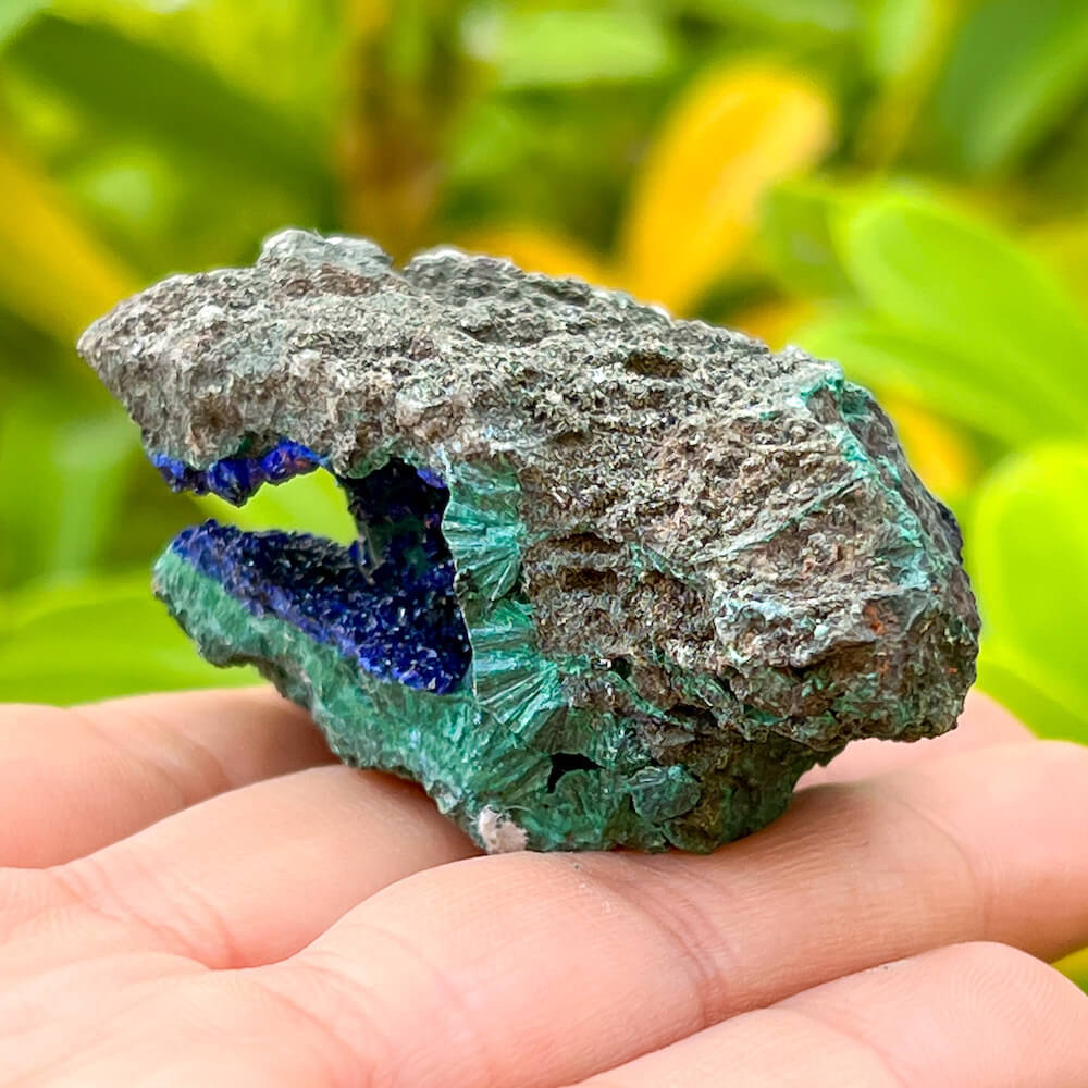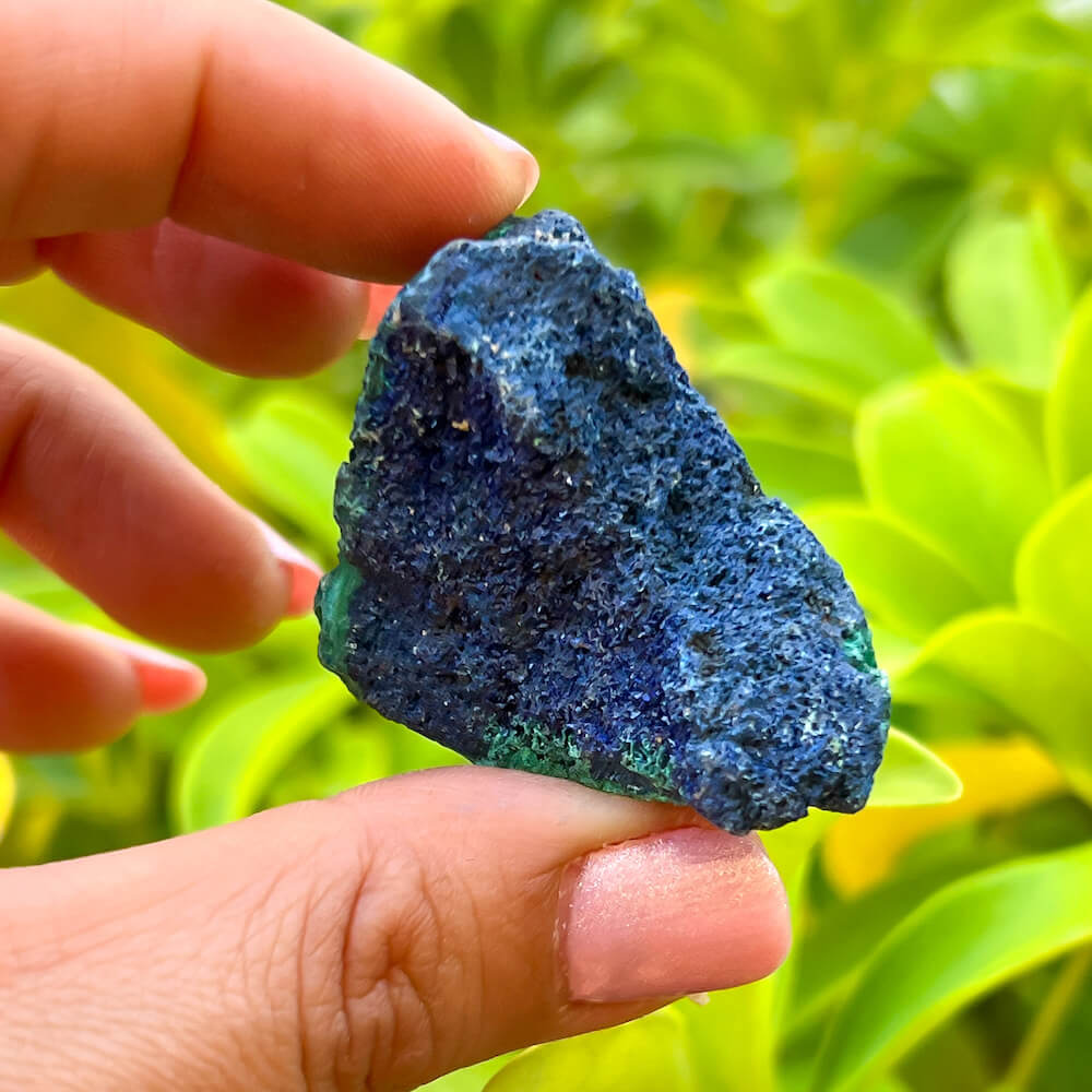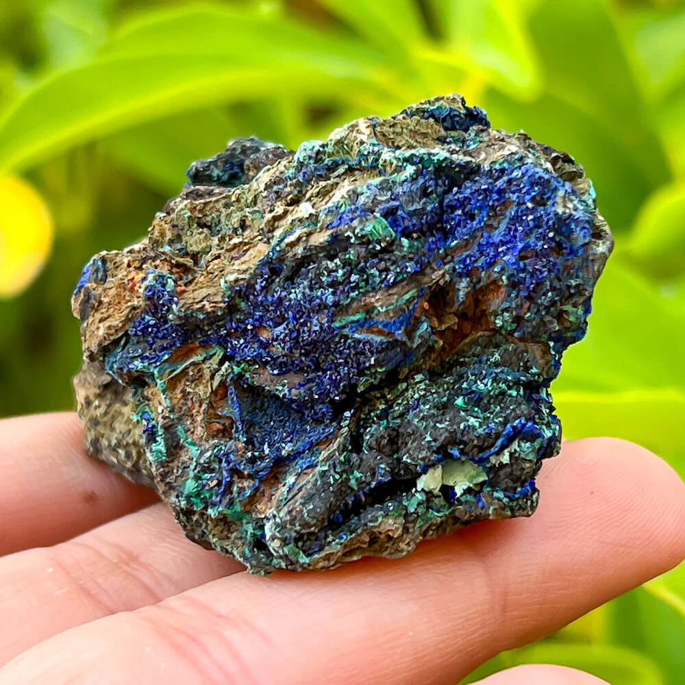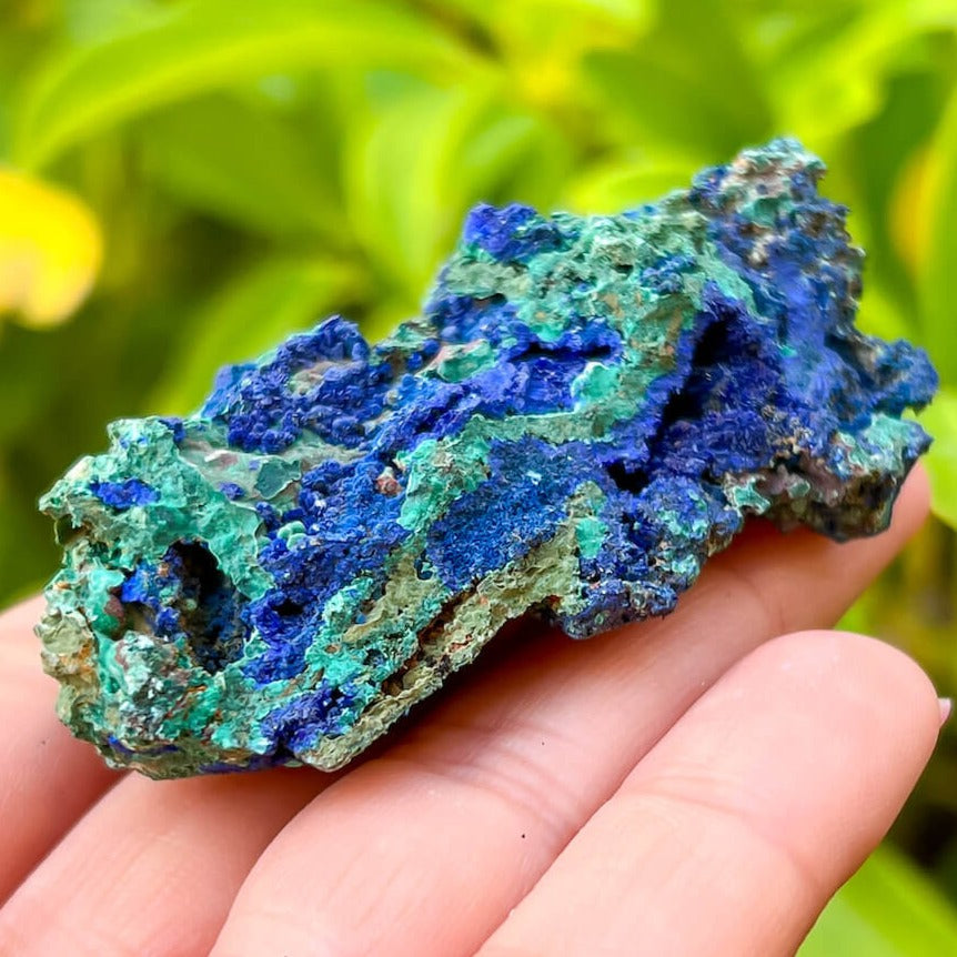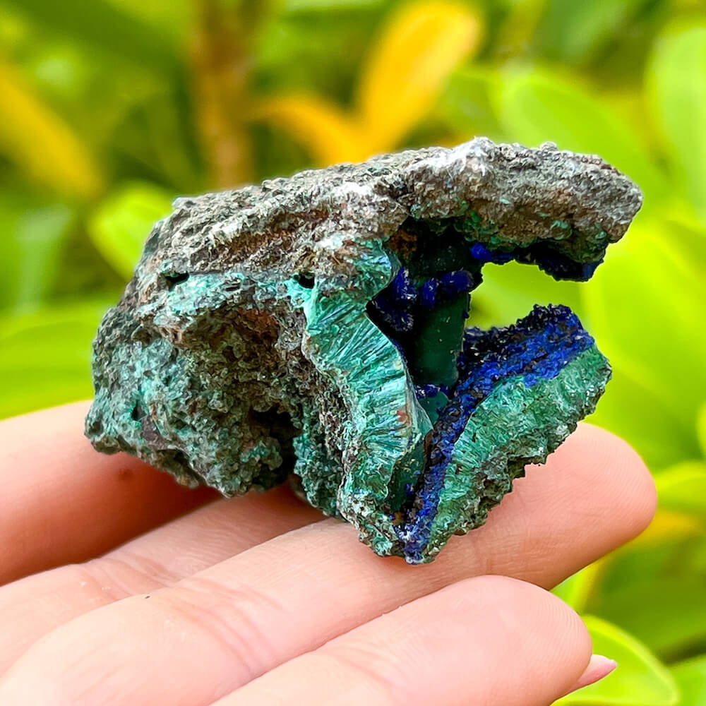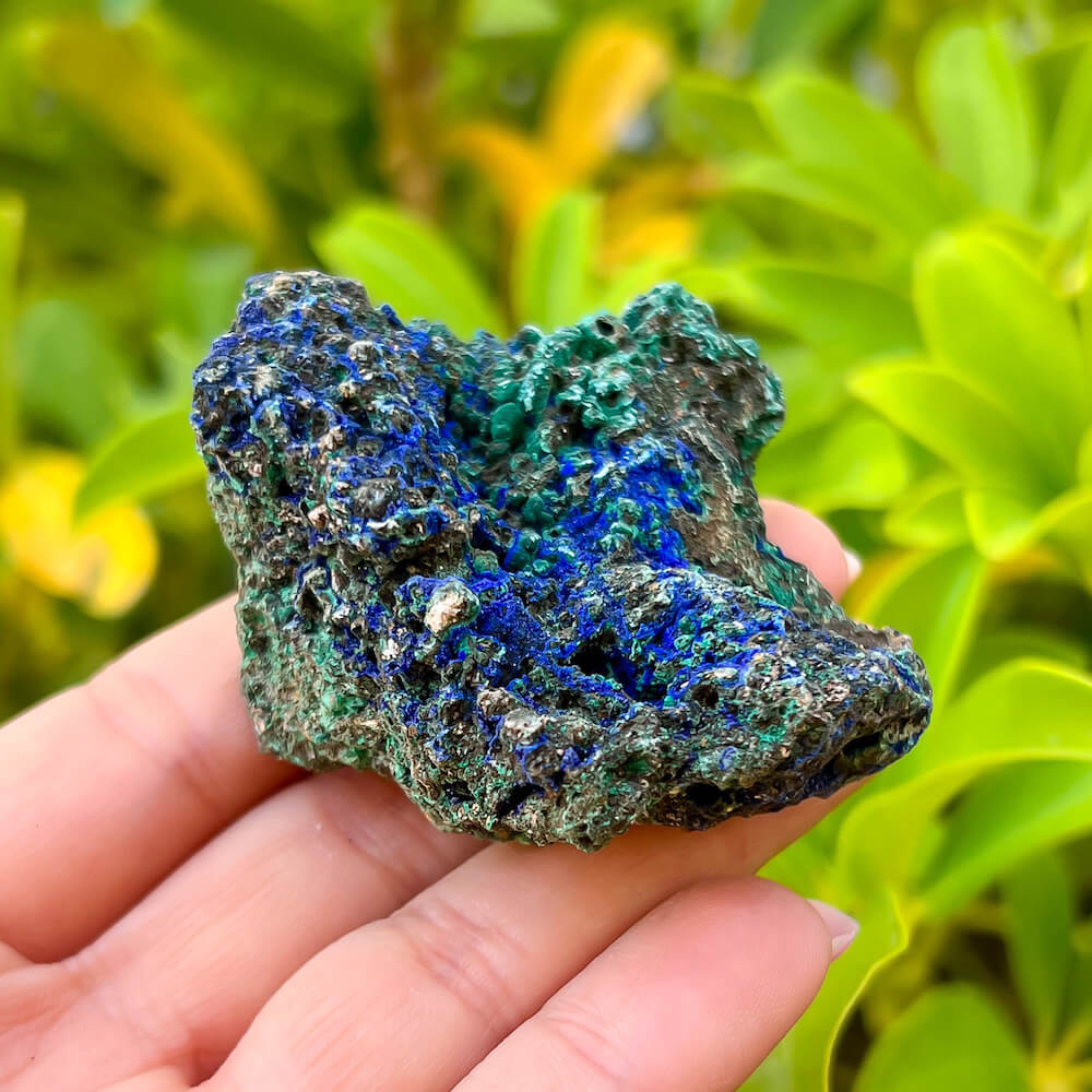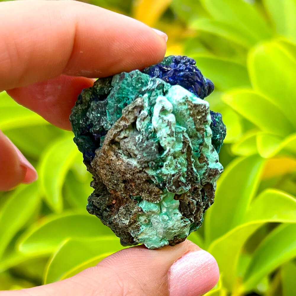 Unidos como azurita-malaquita, se cree que este mineral combina diferentes rasgos, refresca la visión de la vida del usuario y disuelve las características egocéntricas; disipando la presunción, la arrogancia y la vanidad y mejorando la flexibilidad en el movimiento y el pensamiento. Expande la conciencia, crea un equilibrio emocional y activa un escudo protector contra las fuerzas negativas u hostiles.