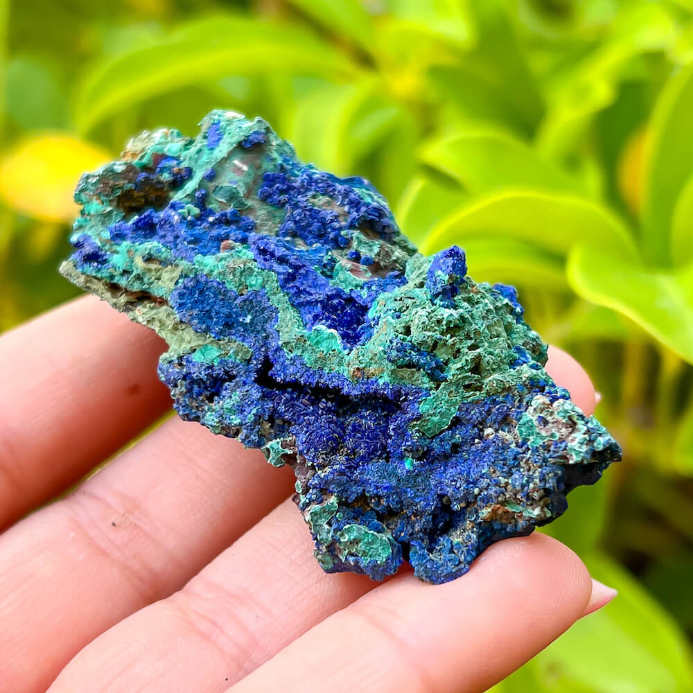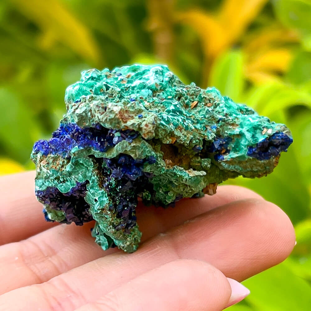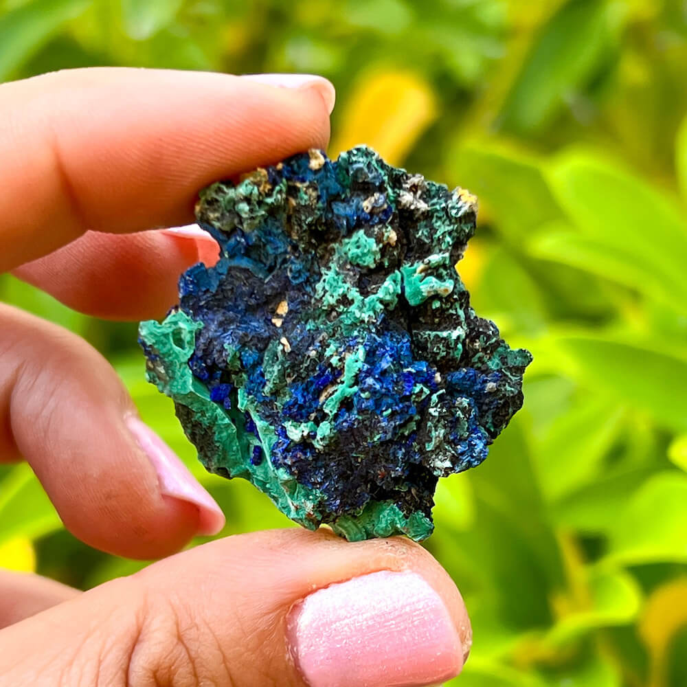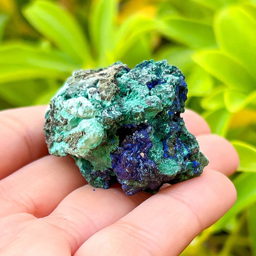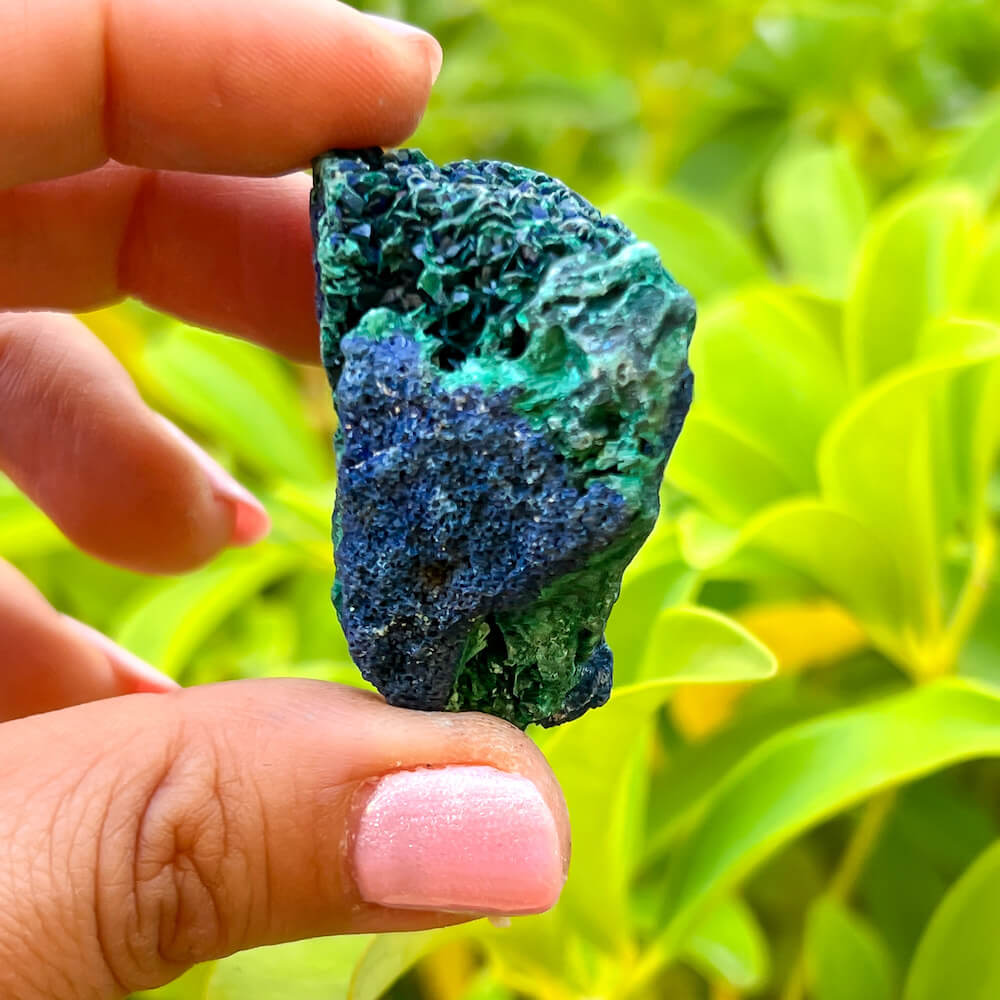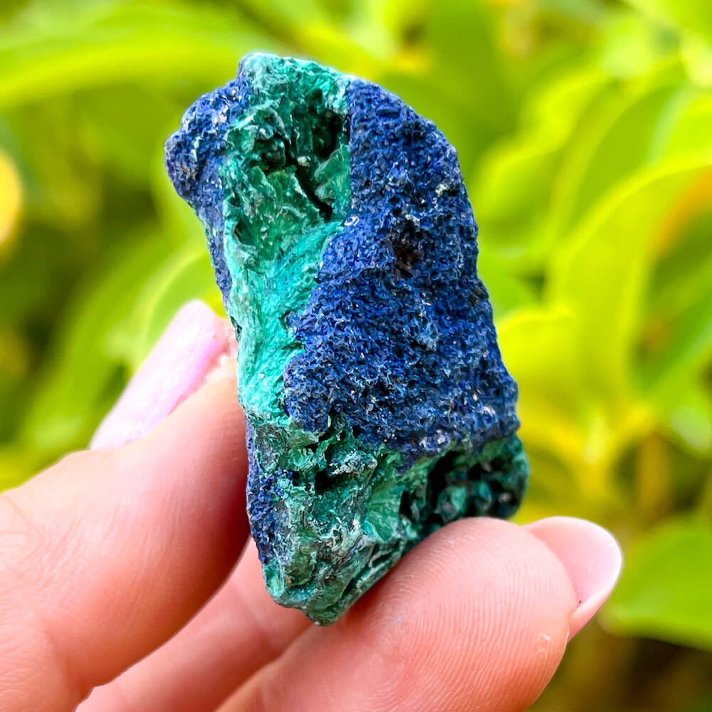 Unidos como azurita-malaquita, se cree que este mineral combina diferentes rasgos, refresca la visión de la vida del usuario y disuelve las características egocéntricas; disipando la presunción, la arrogancia y la vanidad y mejorando la flexibilidad en el movimiento y el pensamiento. Expande la conciencia, crea un equilibrio emocional y activa un escudo protector contra las fuerzas negativas u hostiles.