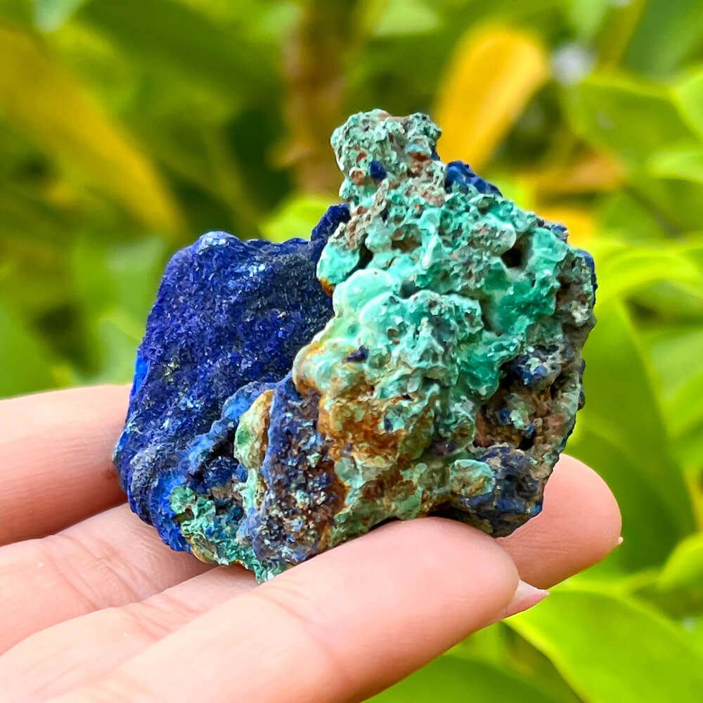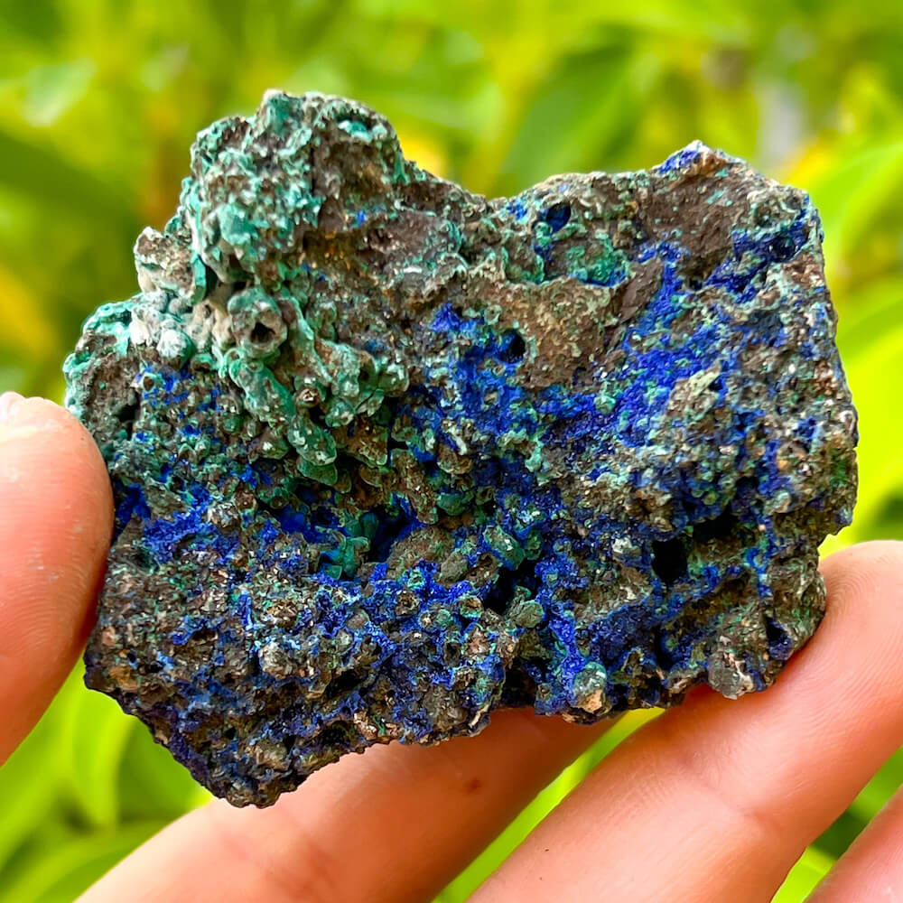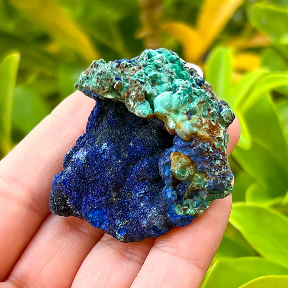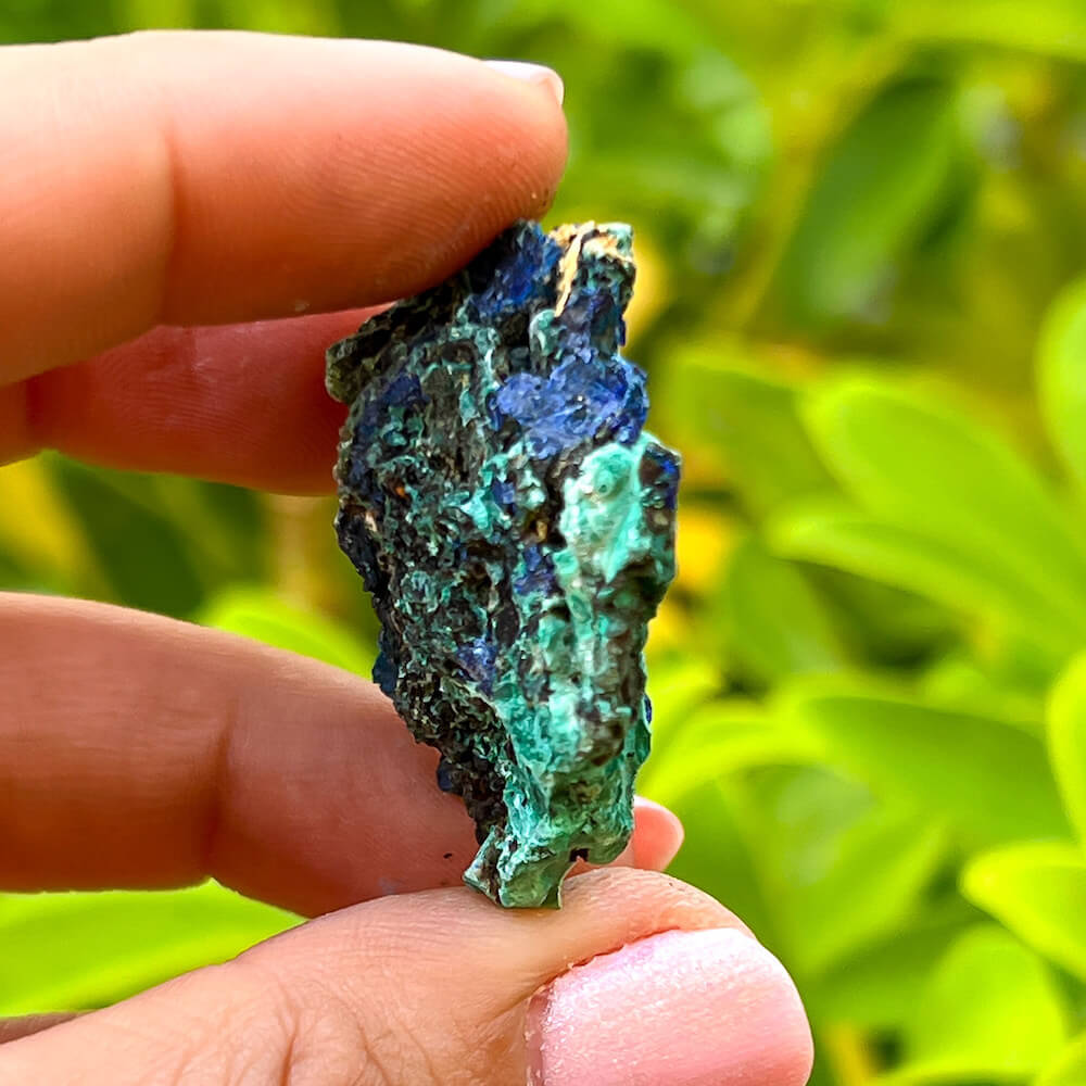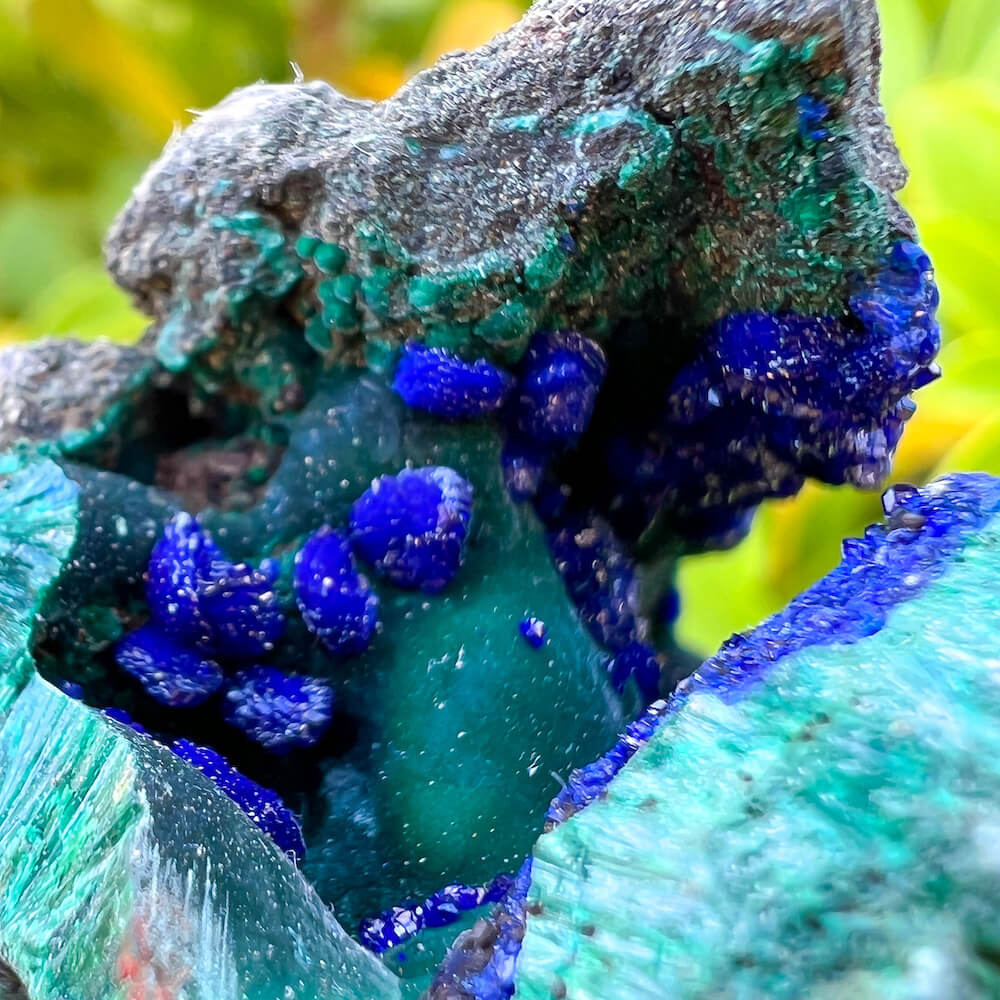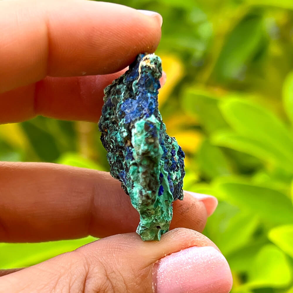 Unidos como azurita-malaquita, se cree que este mineral combina diferentes rasgos, refresca la visión de la vida del usuario y disuelve las características egocéntricas; disipando la presunción, la arrogancia y la vanidad y mejorando la flexibilidad en el movimiento y el pensamiento. Expande la conciencia, crea un equilibrio emocional y activa un escudo protector contra las fuerzas negativas u hostiles.