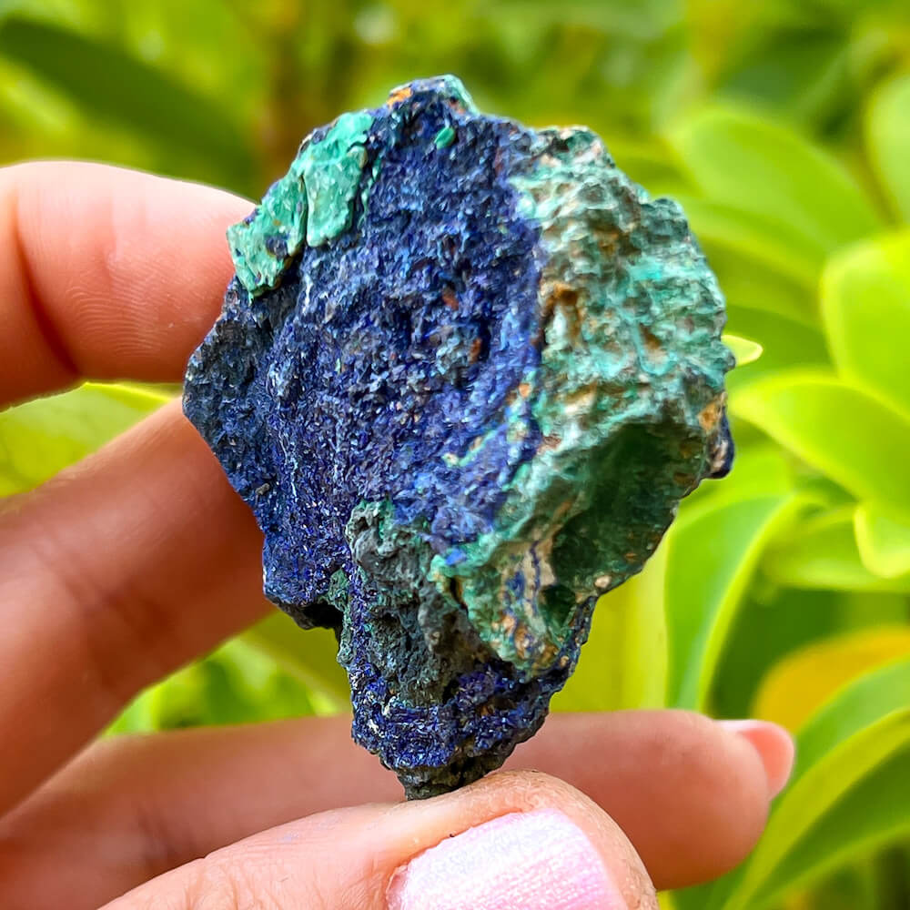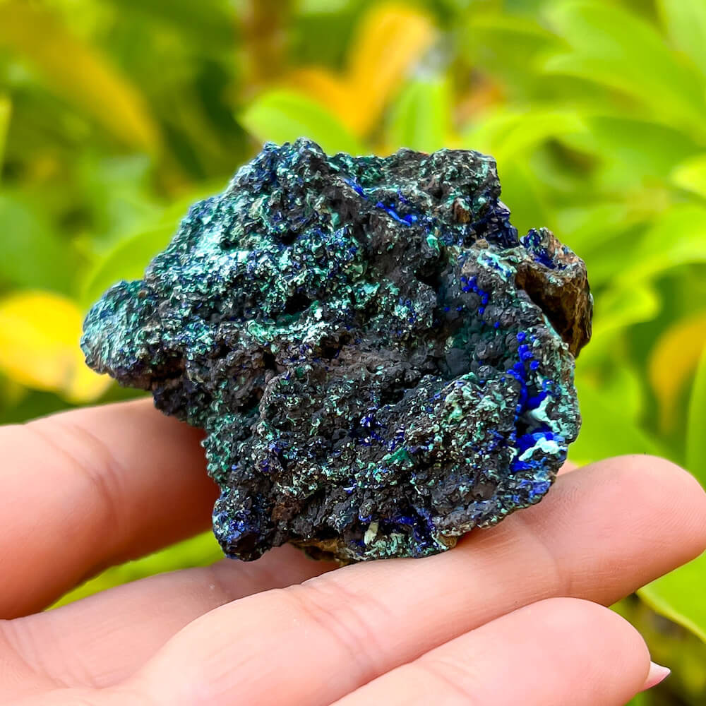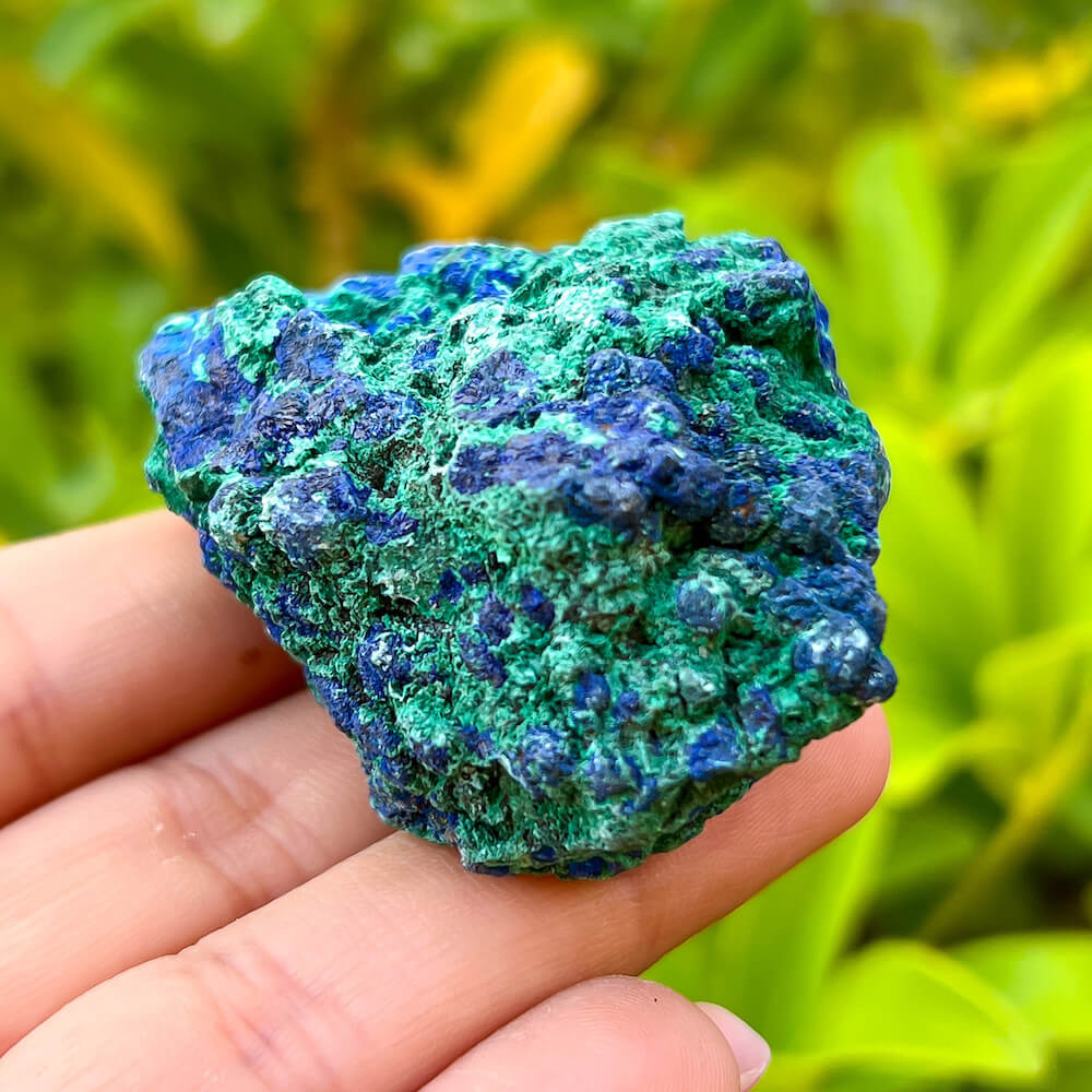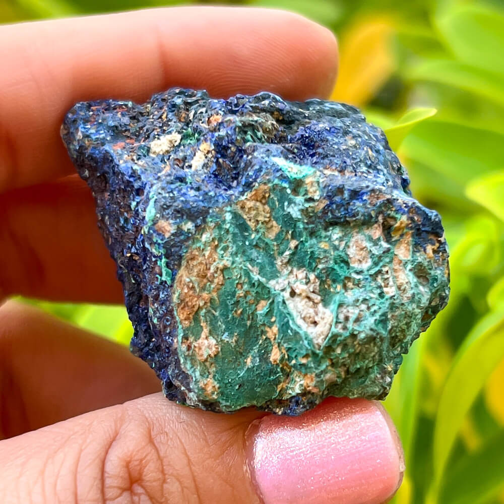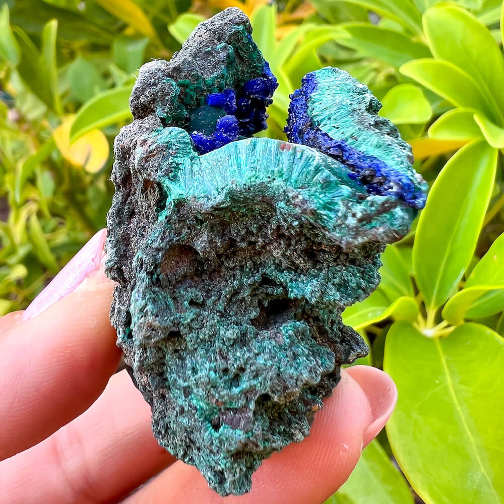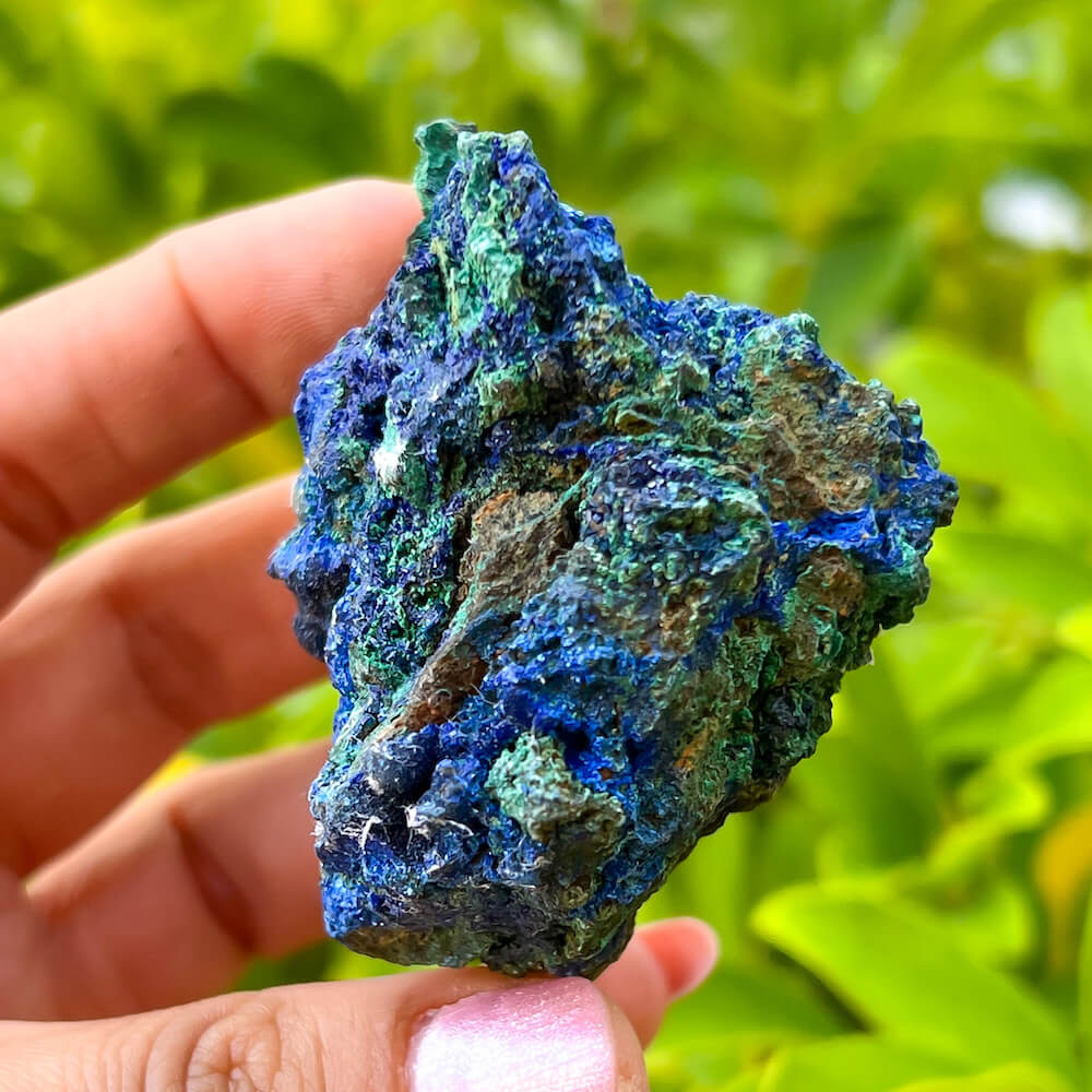 Unidos como azurita-malaquita, se cree que este mineral combina diferentes rasgos, refresca la visión de la vida del usuario y disuelve las características egocéntricas; disipando la presunción, la arrogancia y la vanidad y mejorando la flexibilidad en el movimiento y el pensamiento. Expande la conciencia, crea un equilibrio emocional y activa un escudo protector contra las fuerzas negativas u hostiles.