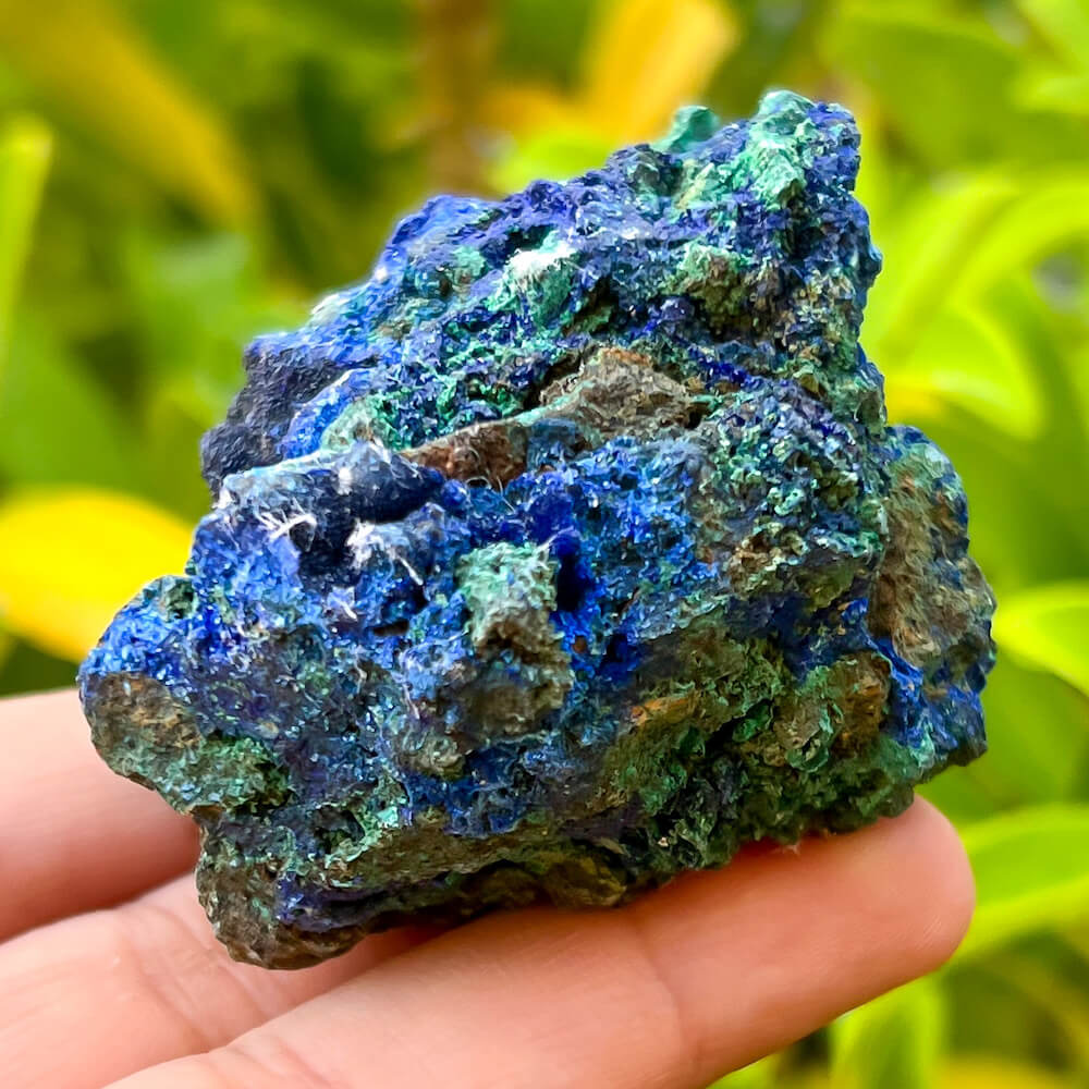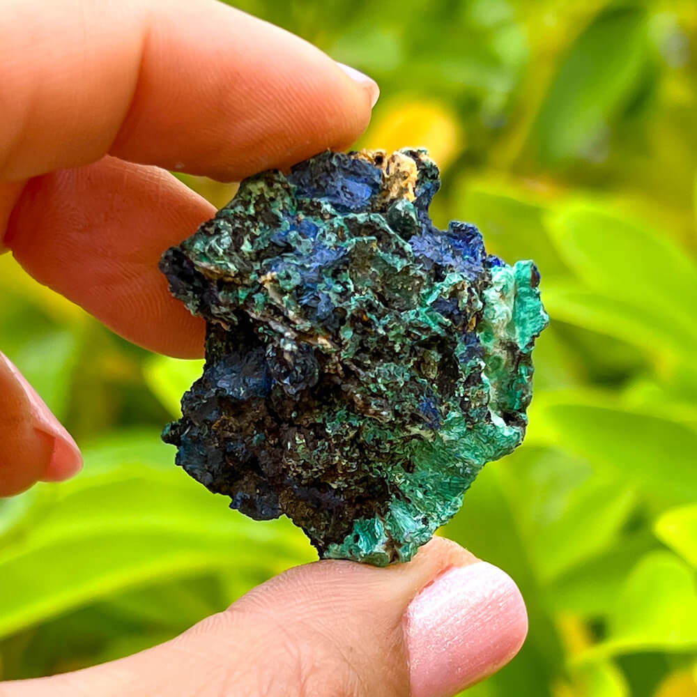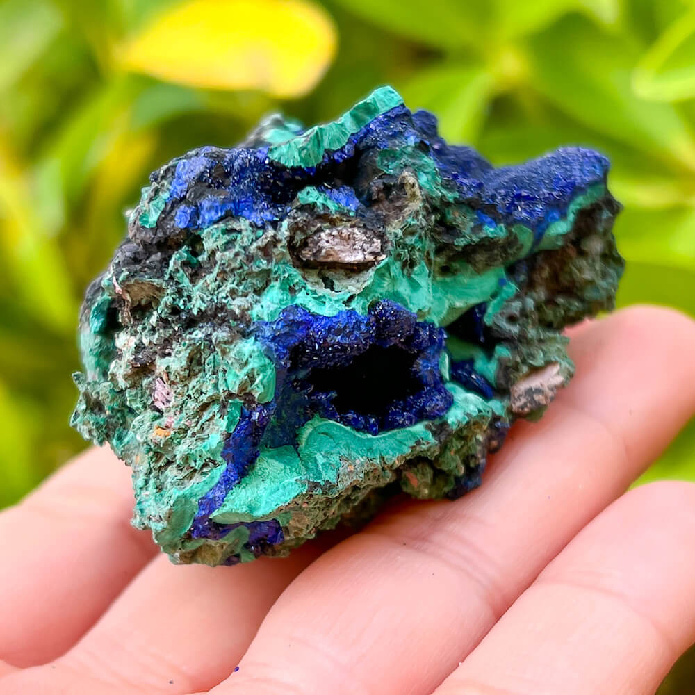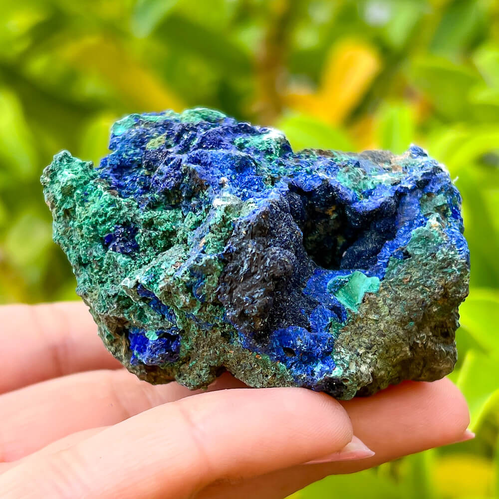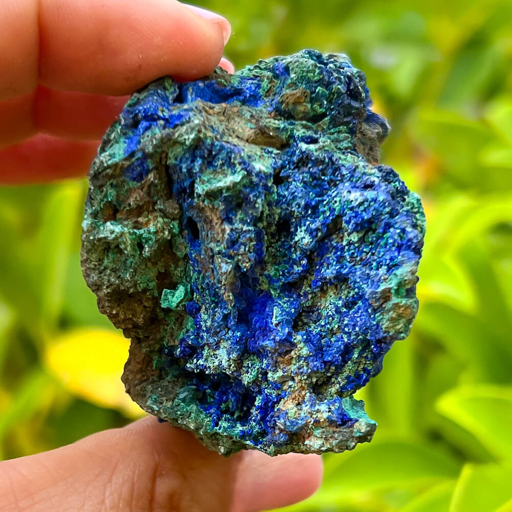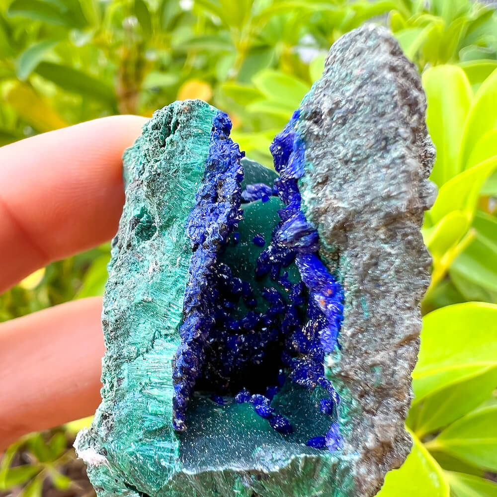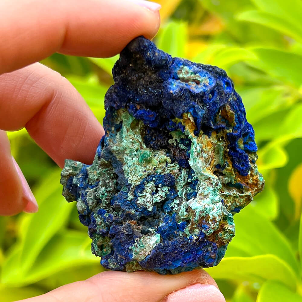 Unidos como azurita-malaquita, se cree que este mineral combina diferentes rasgos, refresca la visión de la vida del usuario y disuelve las características egocéntricas; disipando la presunción, la arrogancia y la vanidad y mejorando la flexibilidad en el movimiento y el pensamiento. Expande la conciencia, crea un equilibrio emocional y activa un escudo protector contra las fuerzas negativas u hostiles.