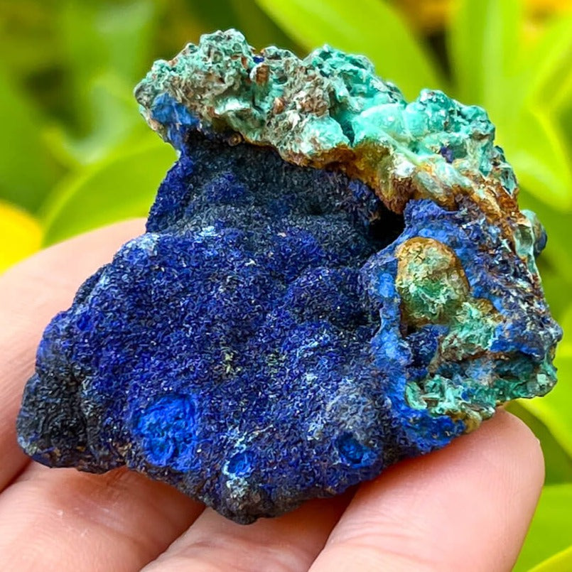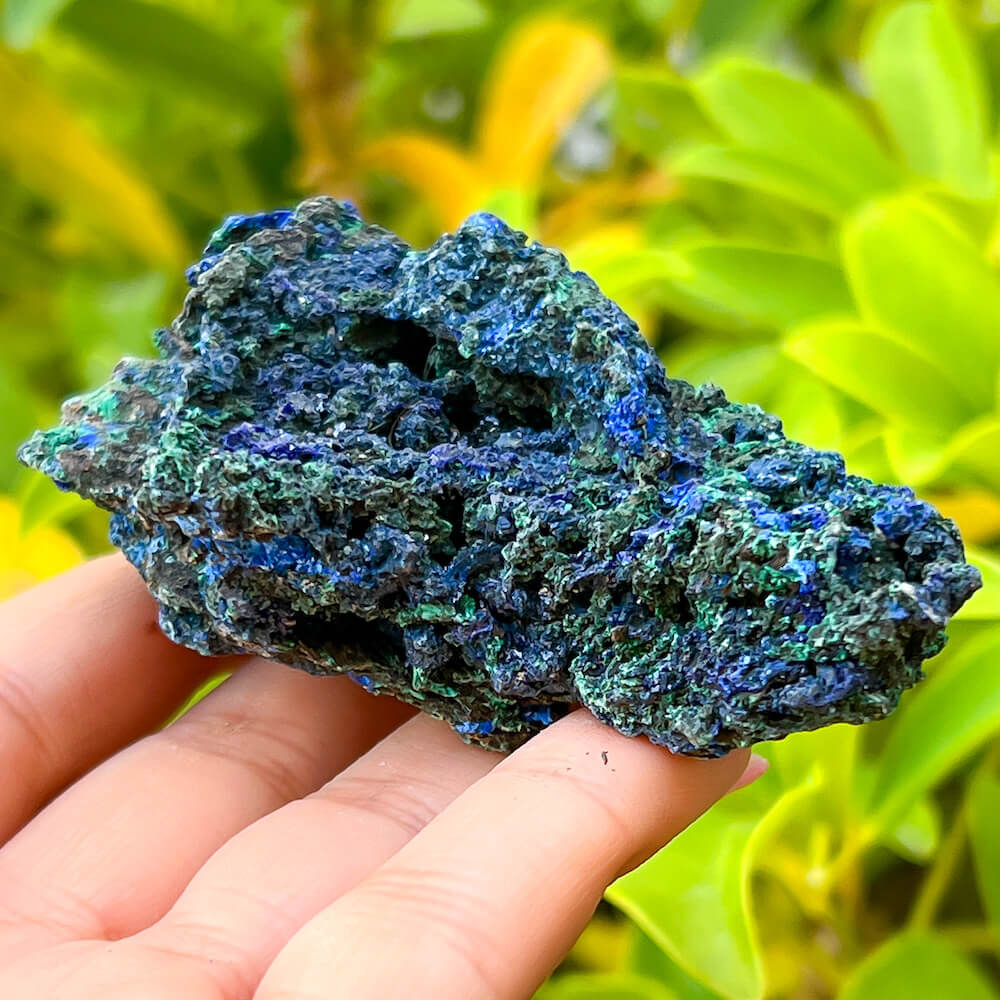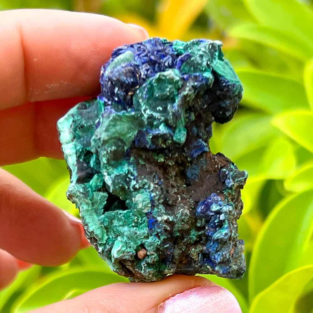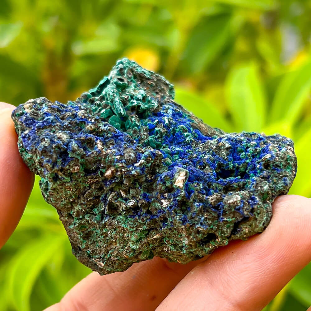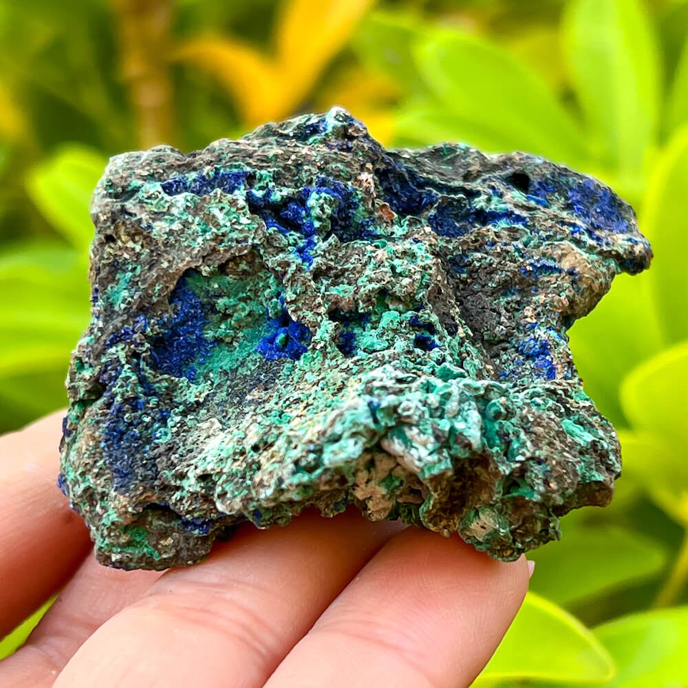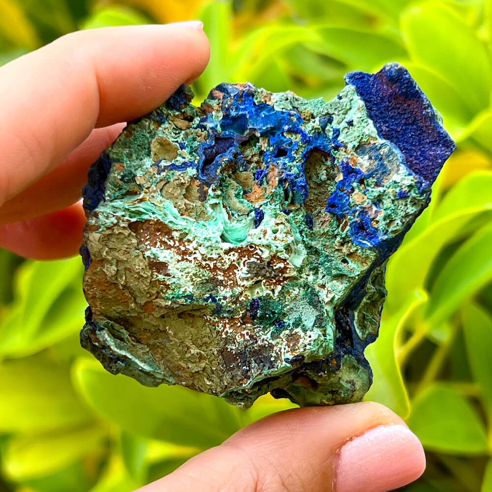 Unidos como azurita-malaquita, se cree que este mineral combina diferentes rasgos, refresca la visión de la vida del usuario y disuelve las características egocéntricas; disipando la presunción, la arrogancia y la vanidad y mejorando la flexibilidad en el movimiento y el pensamiento. Expande la conciencia, crea un equilibrio emocional y activa un escudo protector contra las fuerzas negativas u hostiles.