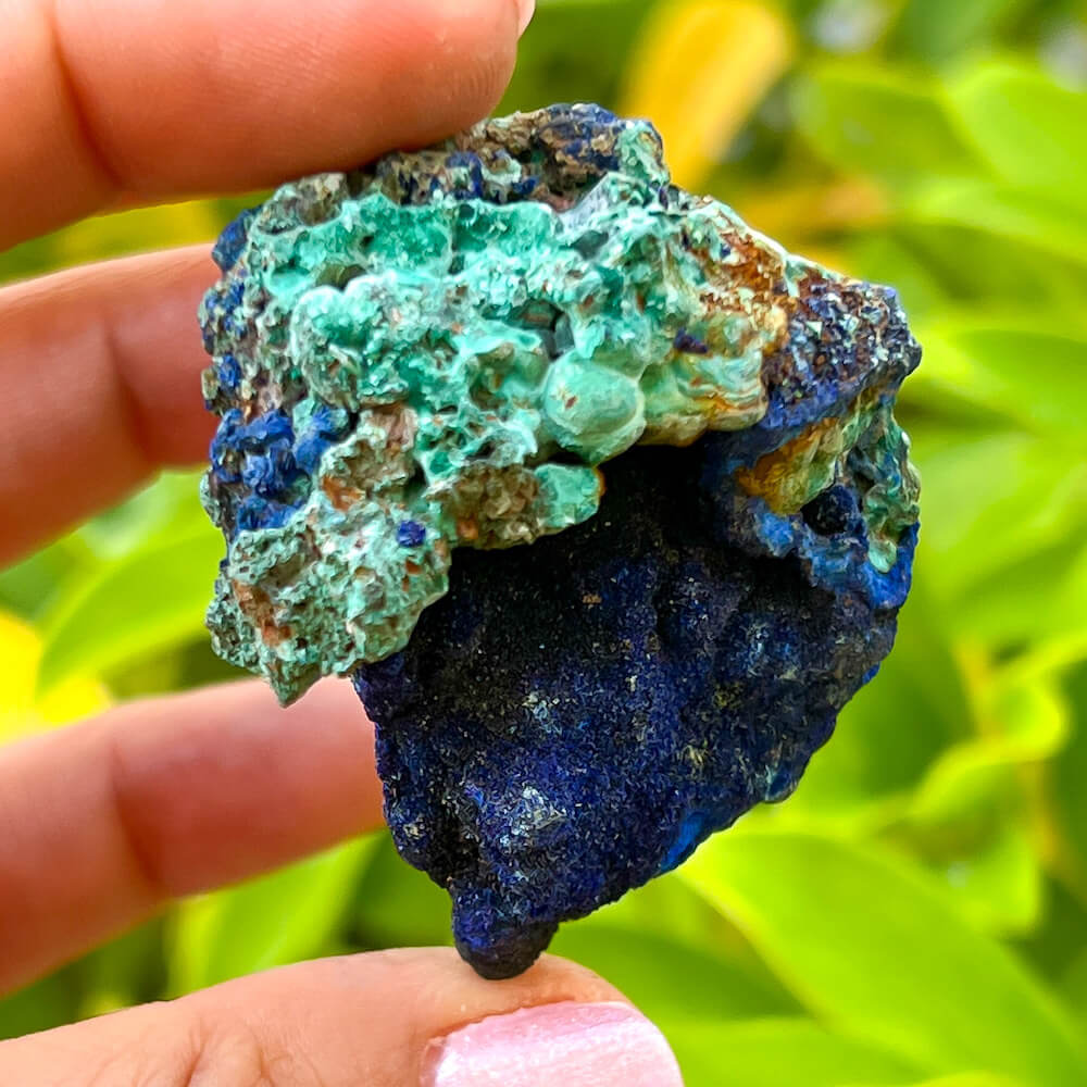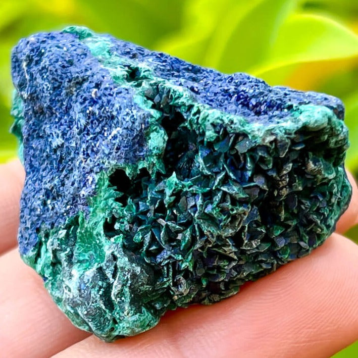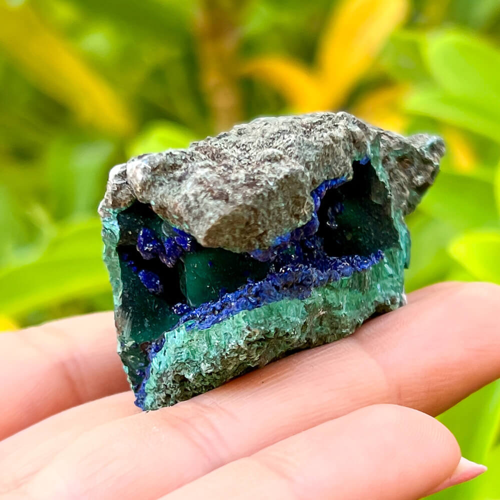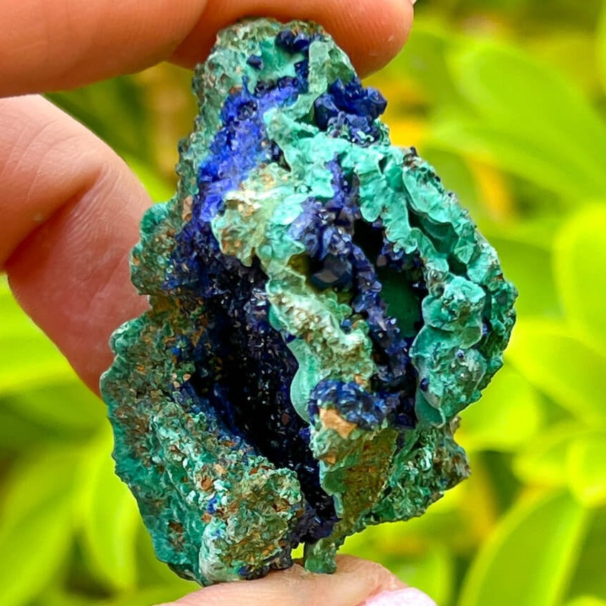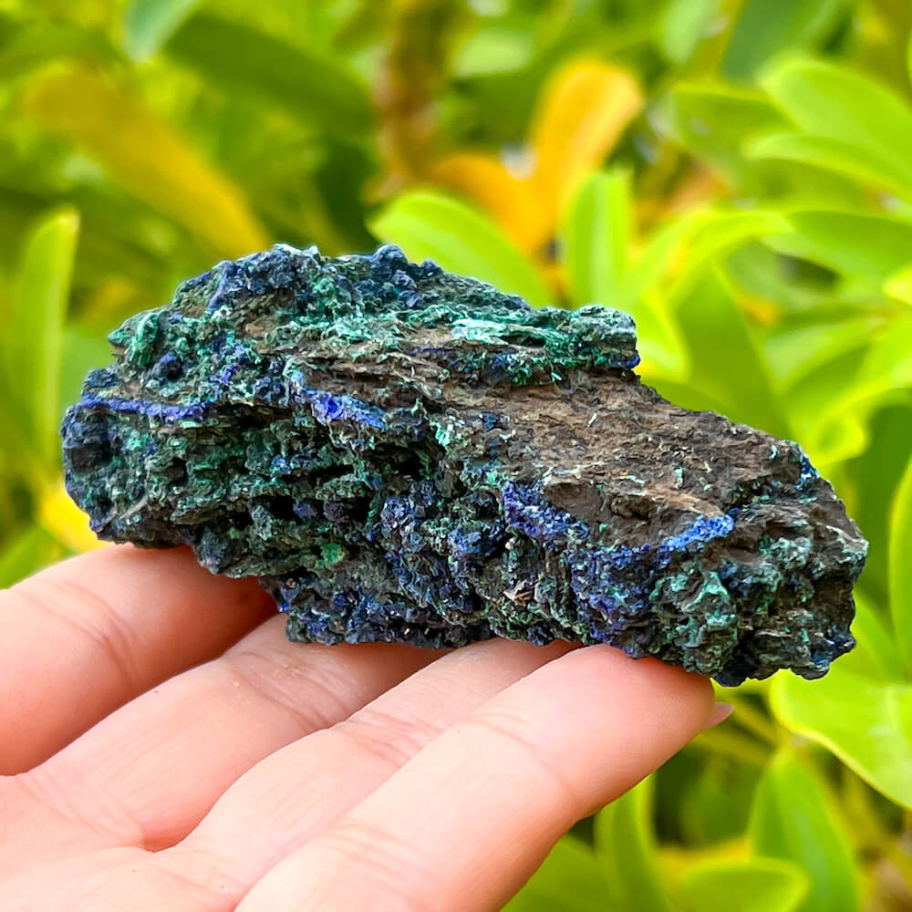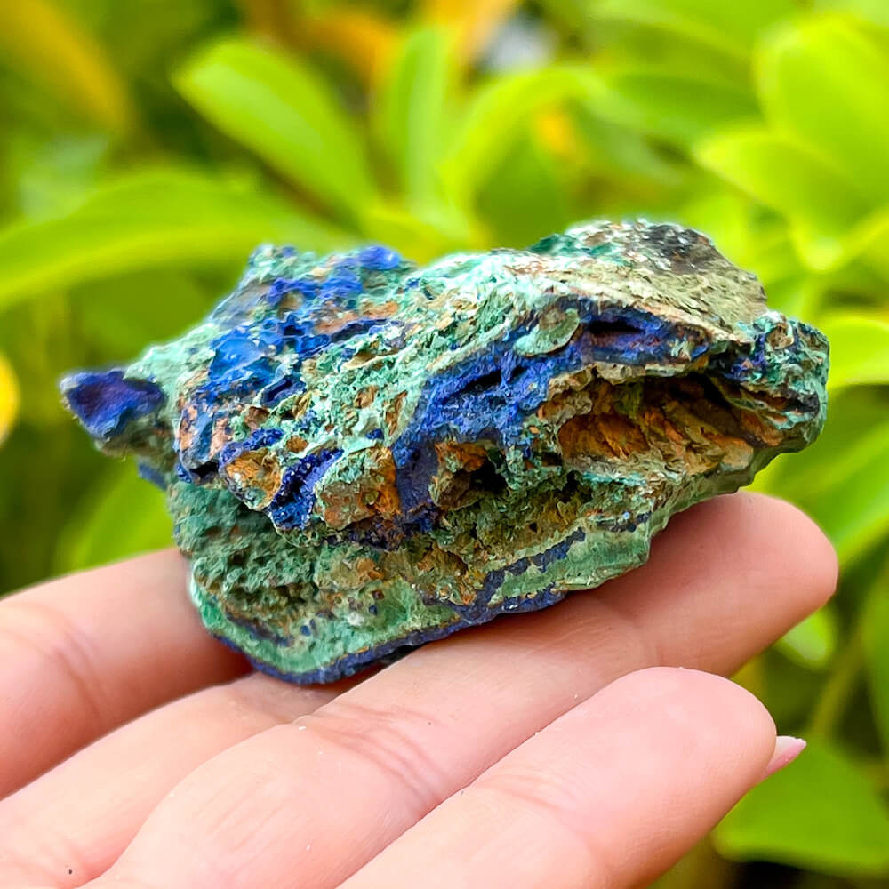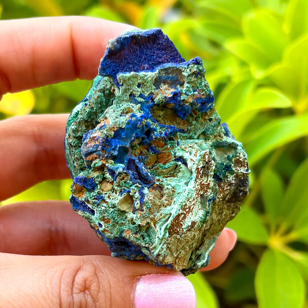 Unidos como azurita-malaquita, se cree que este mineral combina diferentes rasgos, refresca la visión de la vida del usuario y disuelve las características egocéntricas; disipando la presunción, la arrogancia y la vanidad y mejorando la flexibilidad en el movimiento y el pensamiento. Expande la conciencia, crea un equilibrio emocional y activa un escudo protector contra las fuerzas negativas u hostiles.