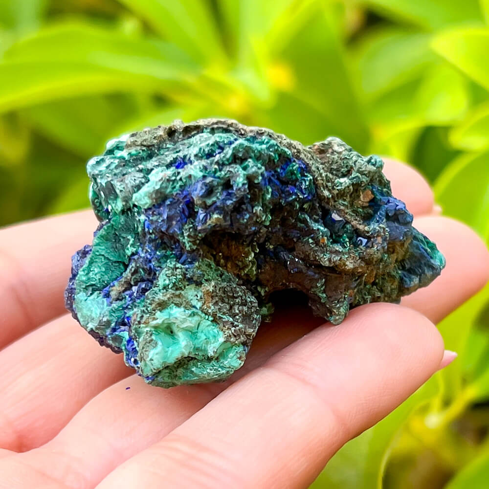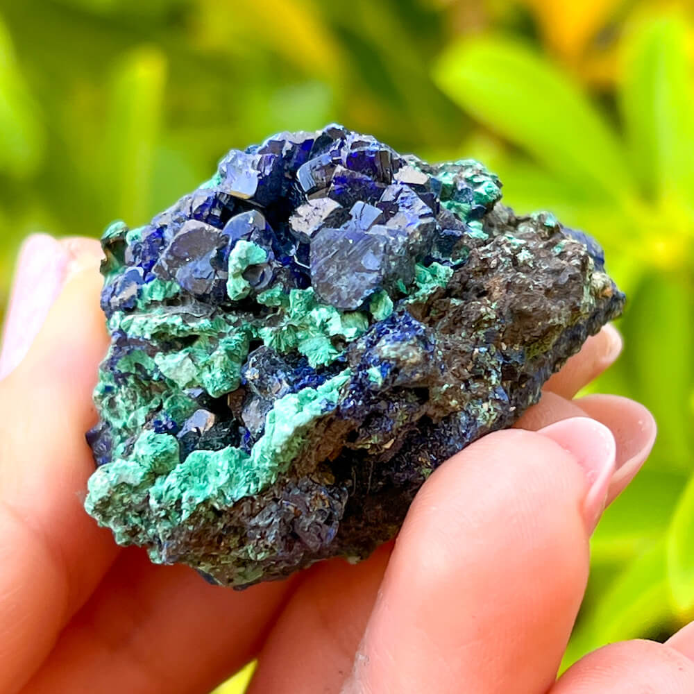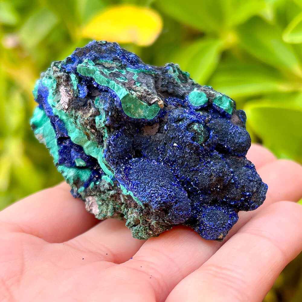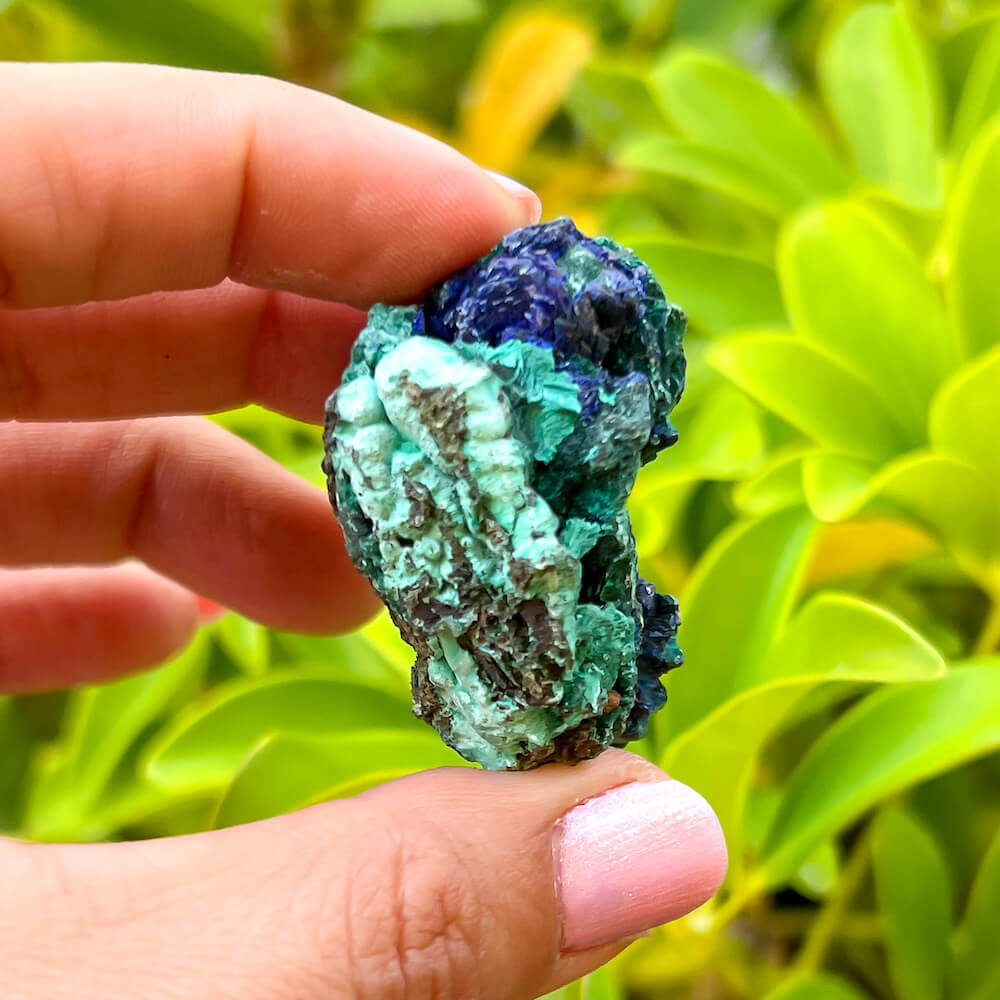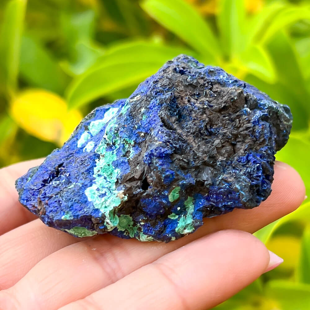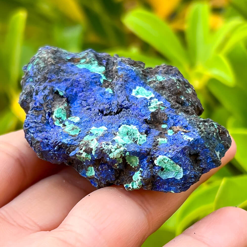 Unidos como azurita-malaquita, se cree que este mineral combina diferentes rasgos, refresca la visión de la vida del usuario y disuelve las características egocéntricas; disipando la presunción, la arrogancia y la vanidad y mejorando la flexibilidad en el movimiento y el pensamiento. Expande la conciencia, crea un equilibrio emocional y activa un escudo protector contra las fuerzas negativas u hostiles.
