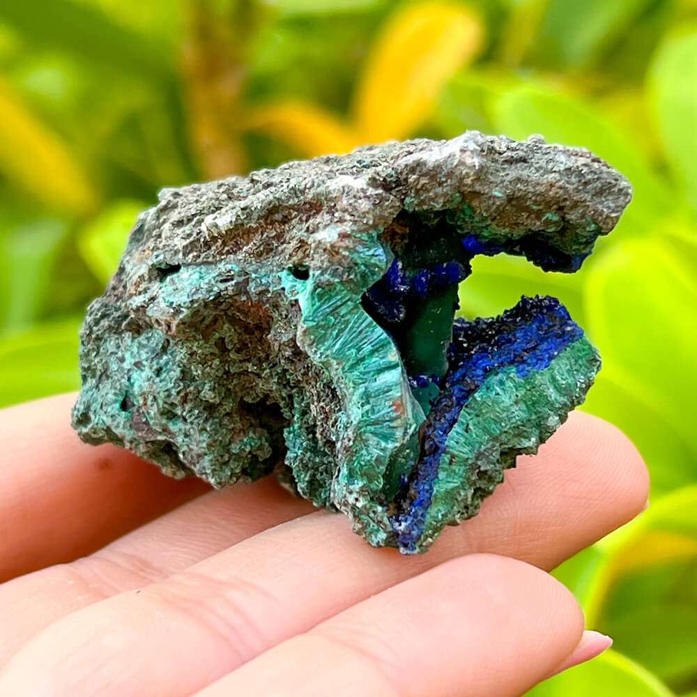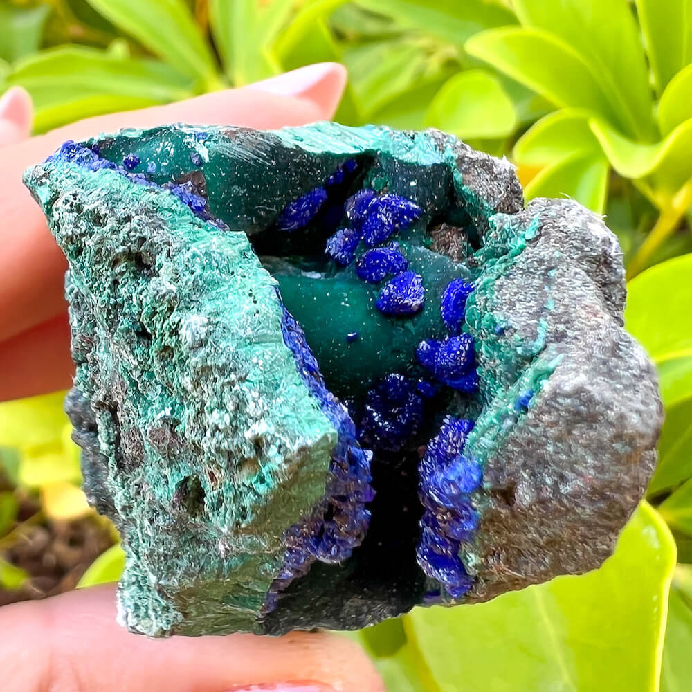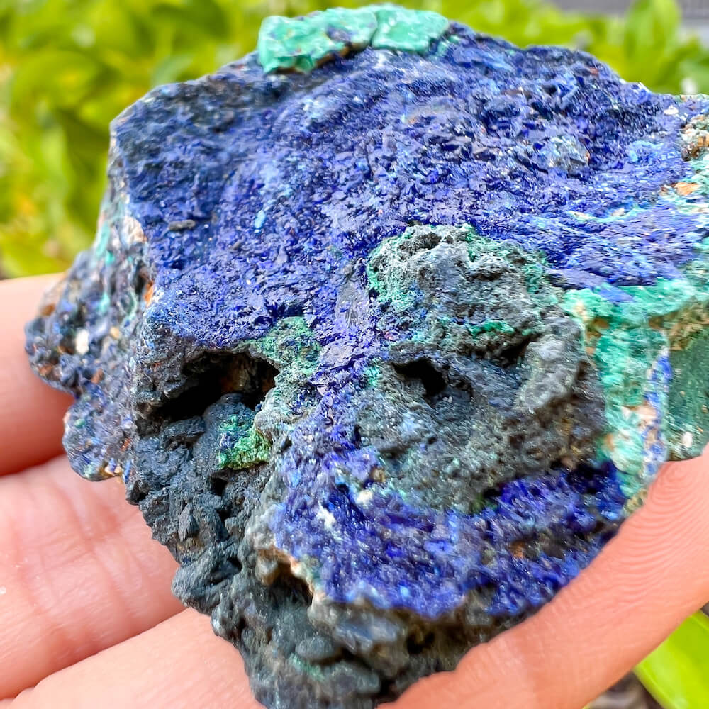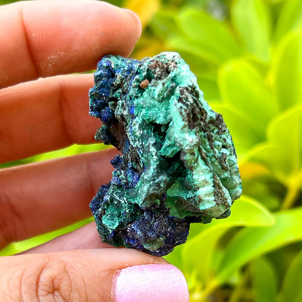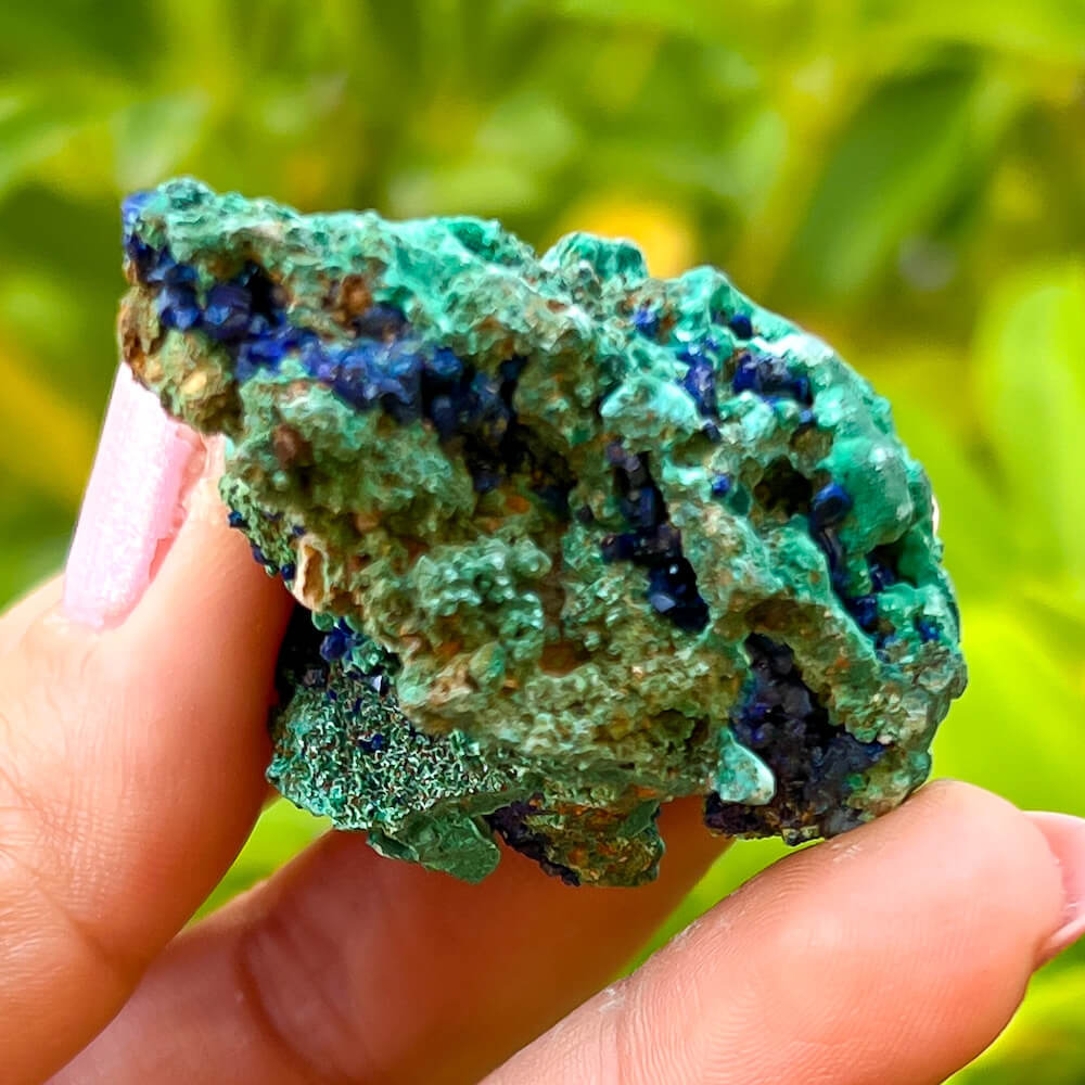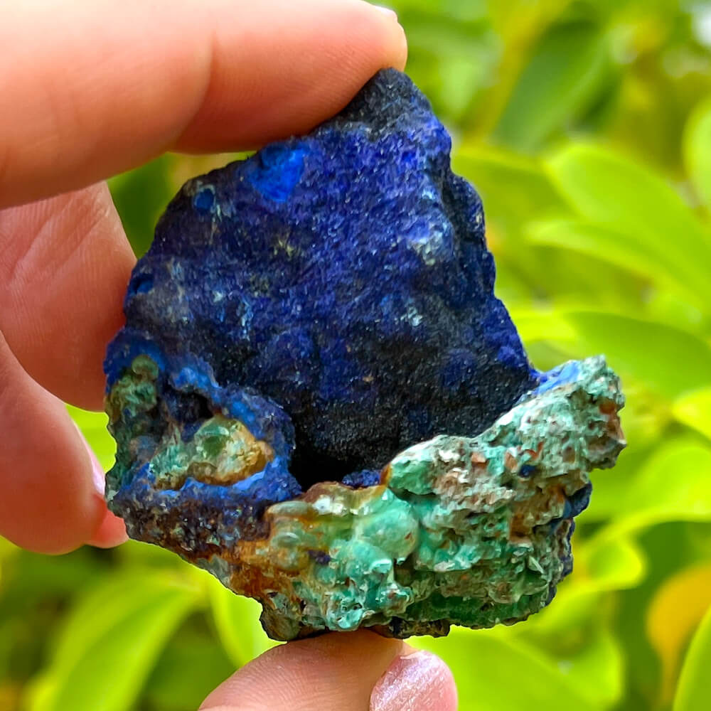 Unidos como azurita-malaquita, se cree que este mineral combina diferentes rasgos, refresca la visión de la vida del usuario y disuelve las características egocéntricas; disipando la presunción, la arrogancia y la vanidad y mejorando la flexibilidad en el movimiento y el pensamiento. Expande la conciencia, crea un equilibrio emocional y activa un escudo protector contra las fuerzas negativas u hostiles.