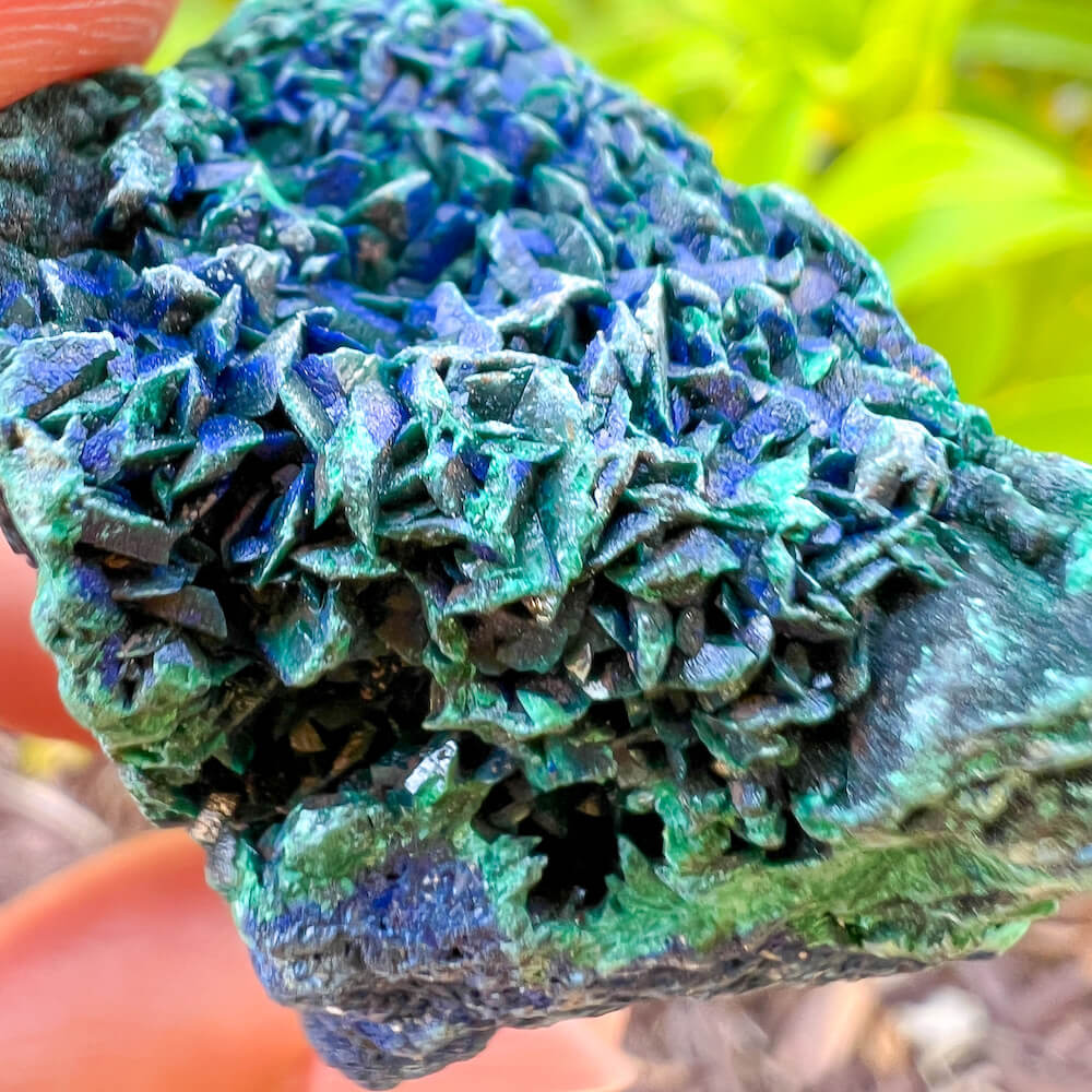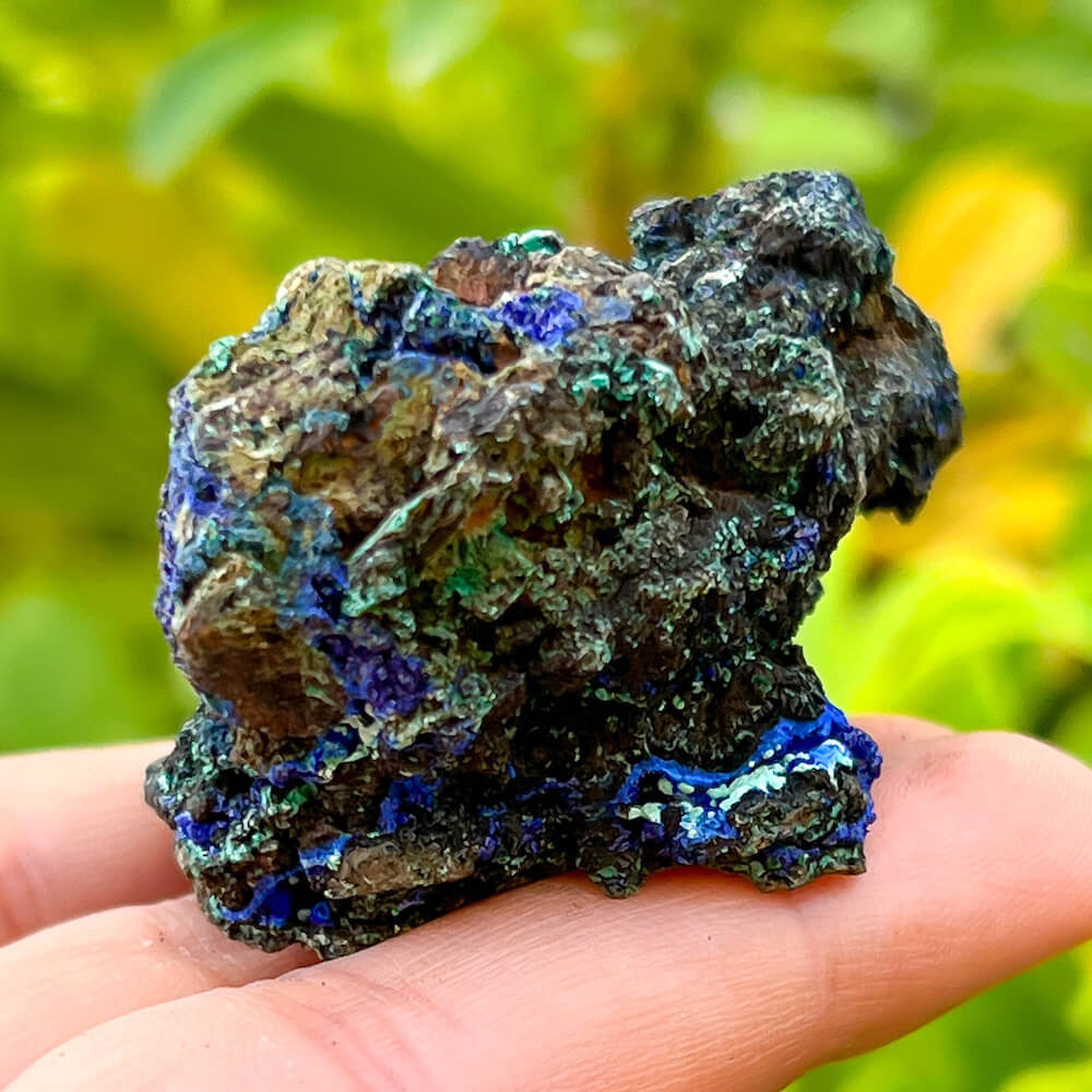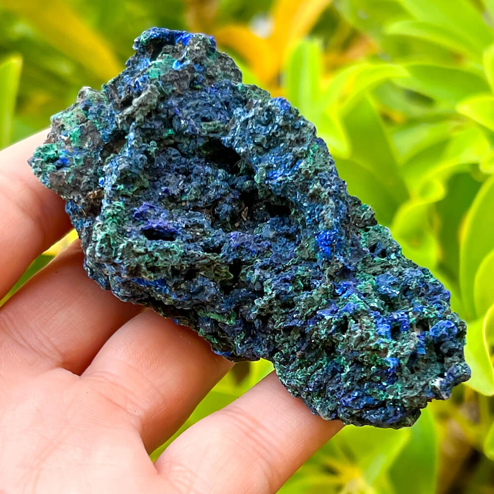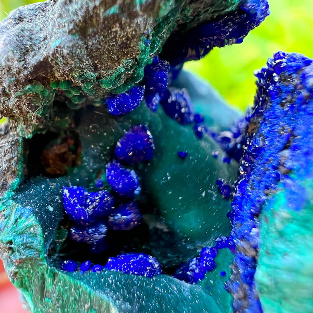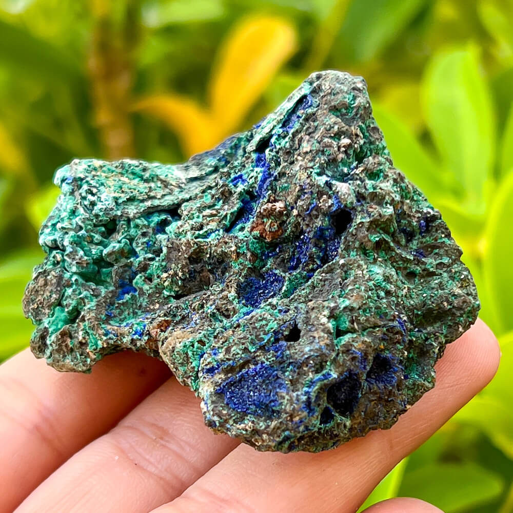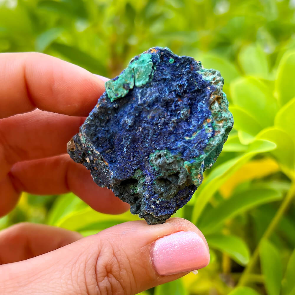 Unidos como azurita-malaquita, se cree que este mineral combina diferentes rasgos, refresca la visión de la vida del usuario y disuelve las características egocéntricas; disipando la presunción, la arrogancia y la vanidad y mejorando la flexibilidad en el movimiento y el pensamiento. Expande la conciencia, crea un equilibrio emocional y activa un escudo protector contra las fuerzas negativas u hostiles.