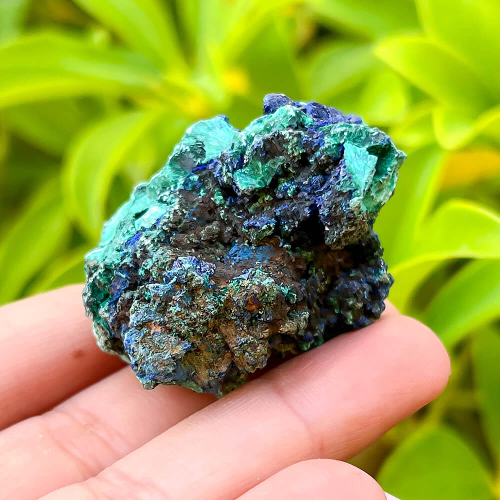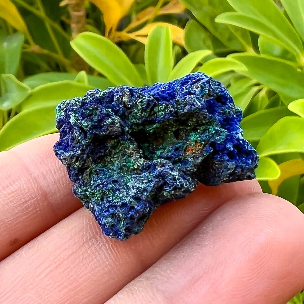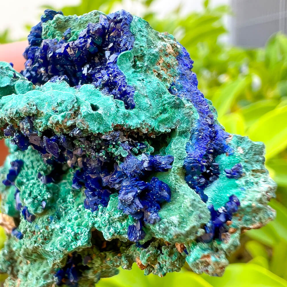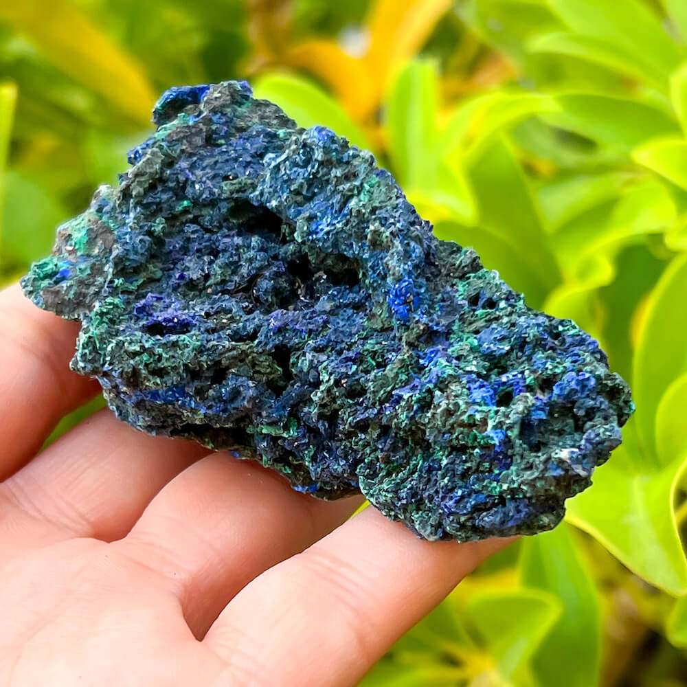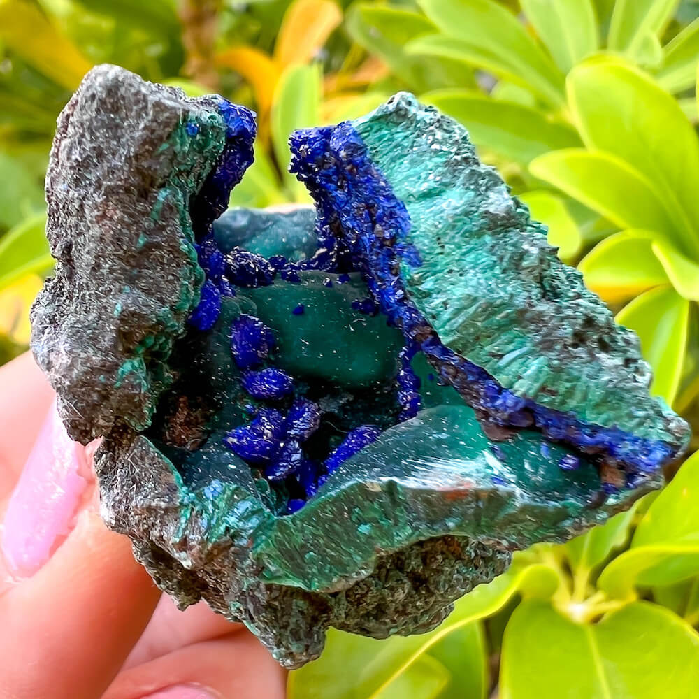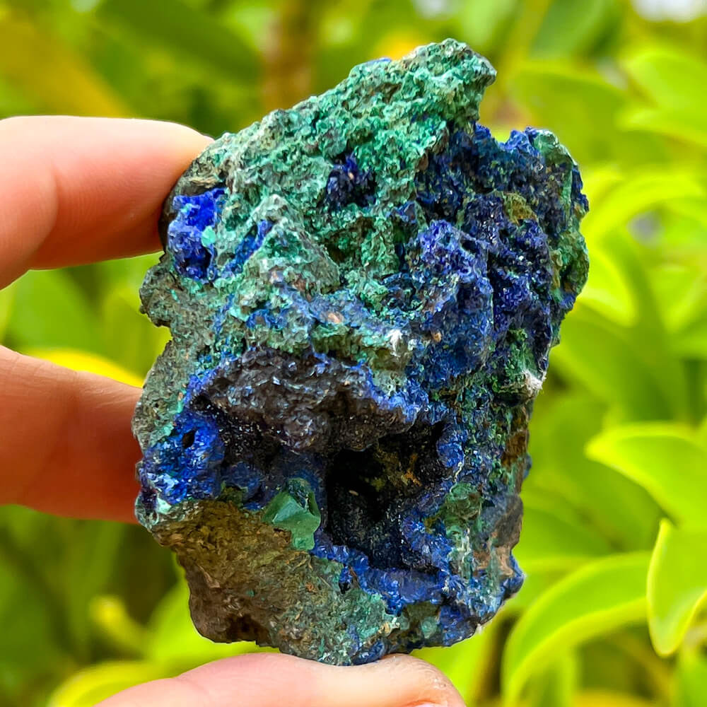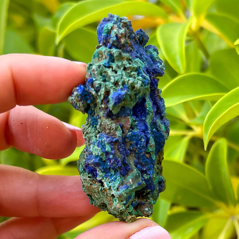 Unidos como azurita-malaquita, se cree que este mineral combina diferentes rasgos, refresca la visión de la vida del usuario y disuelve las características egocéntricas; disipando la presunción, la arrogancia y la vanidad y mejorando la flexibilidad en el movimiento y el pensamiento. Expande la conciencia, crea un equilibrio emocional y activa un escudo protector contra las fuerzas negativas u hostiles.