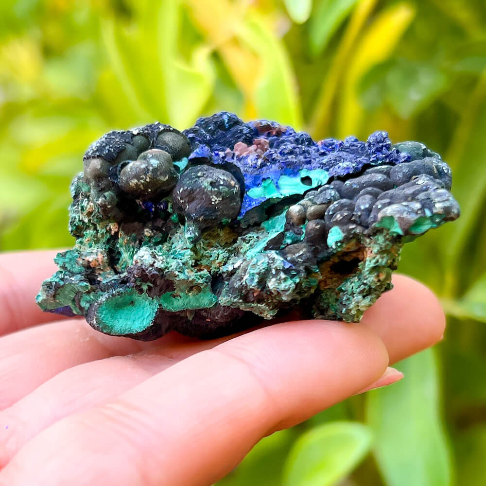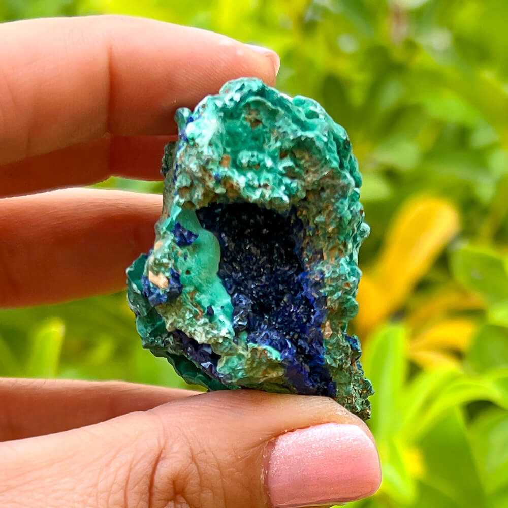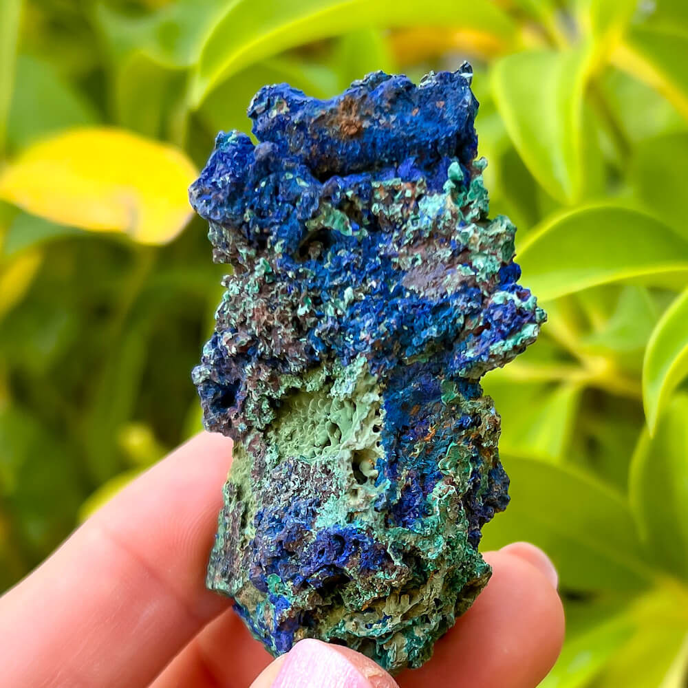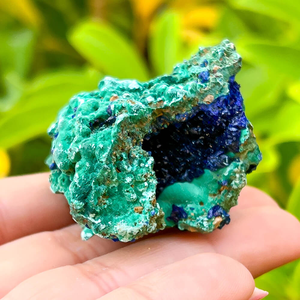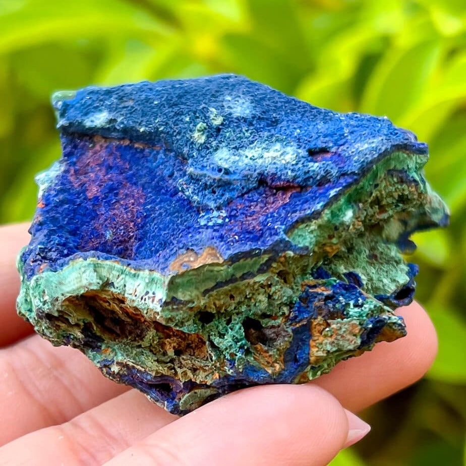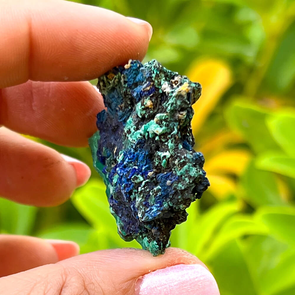 Unidos como azurita-malaquita, se cree que este mineral combina diferentes rasgos, refresca la visión de la vida del usuario y disuelve las características egocéntricas; disipando la presunción, la arrogancia y la vanidad y mejorando la flexibilidad en el movimiento y el pensamiento. Expande la conciencia, crea un equilibrio emocional y activa un escudo protector contra las fuerzas negativas u hostiles.