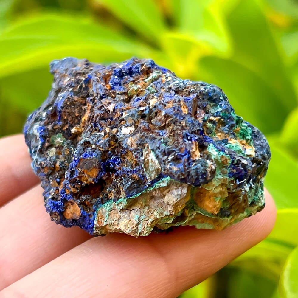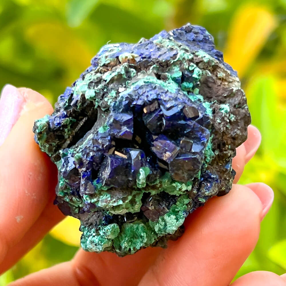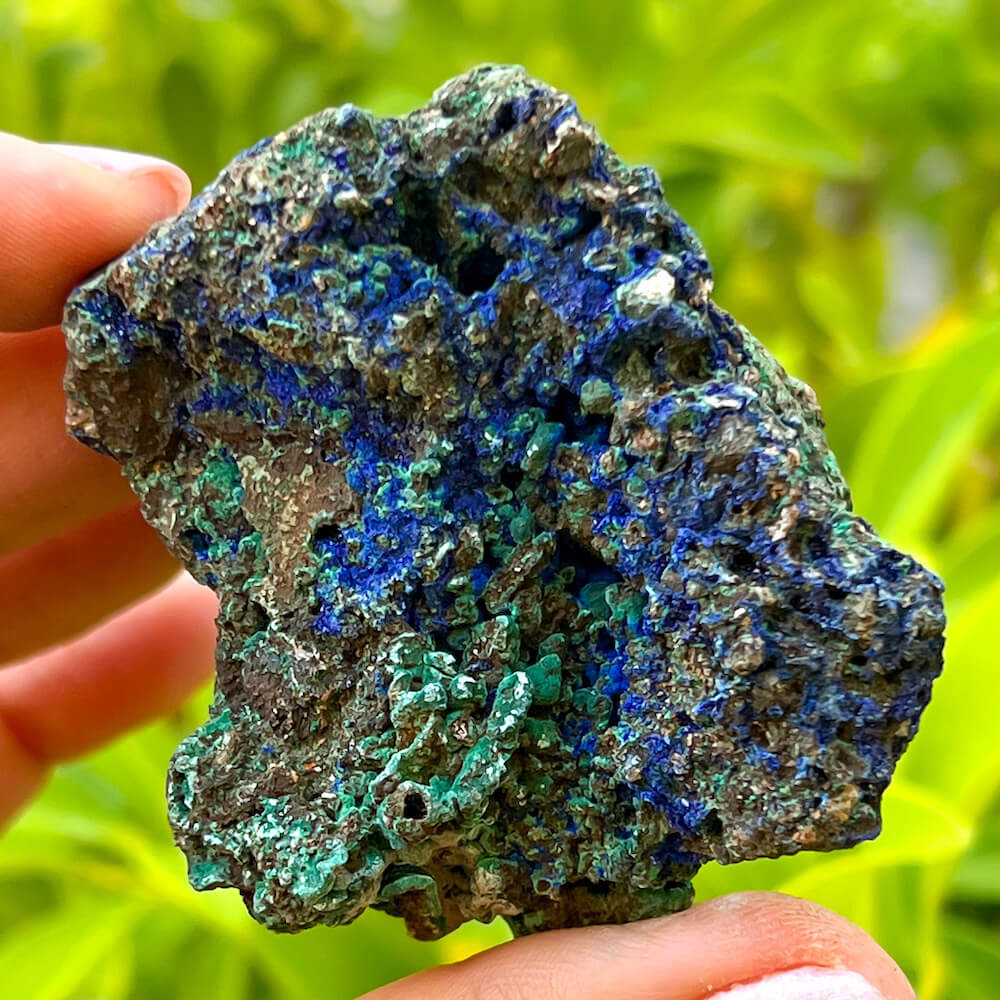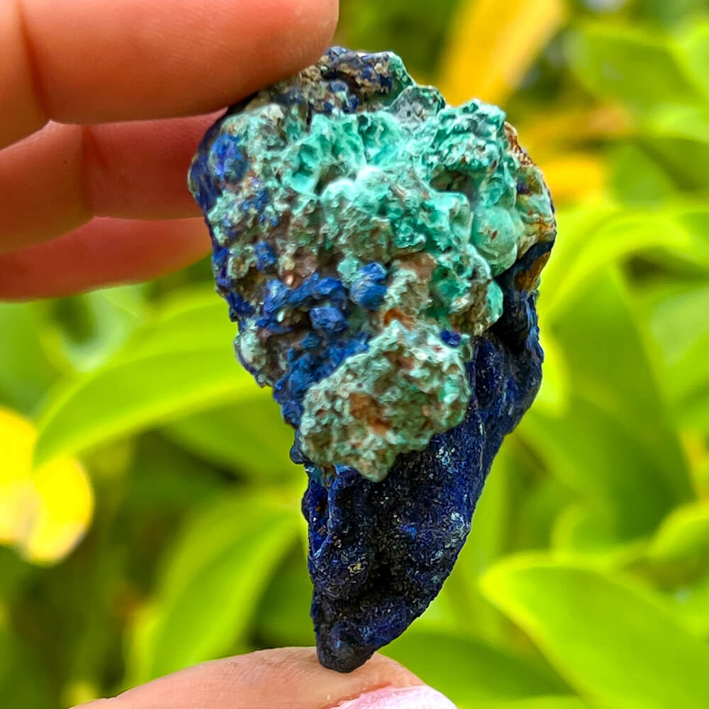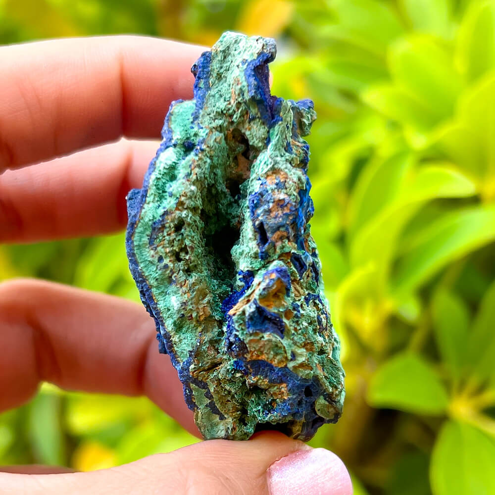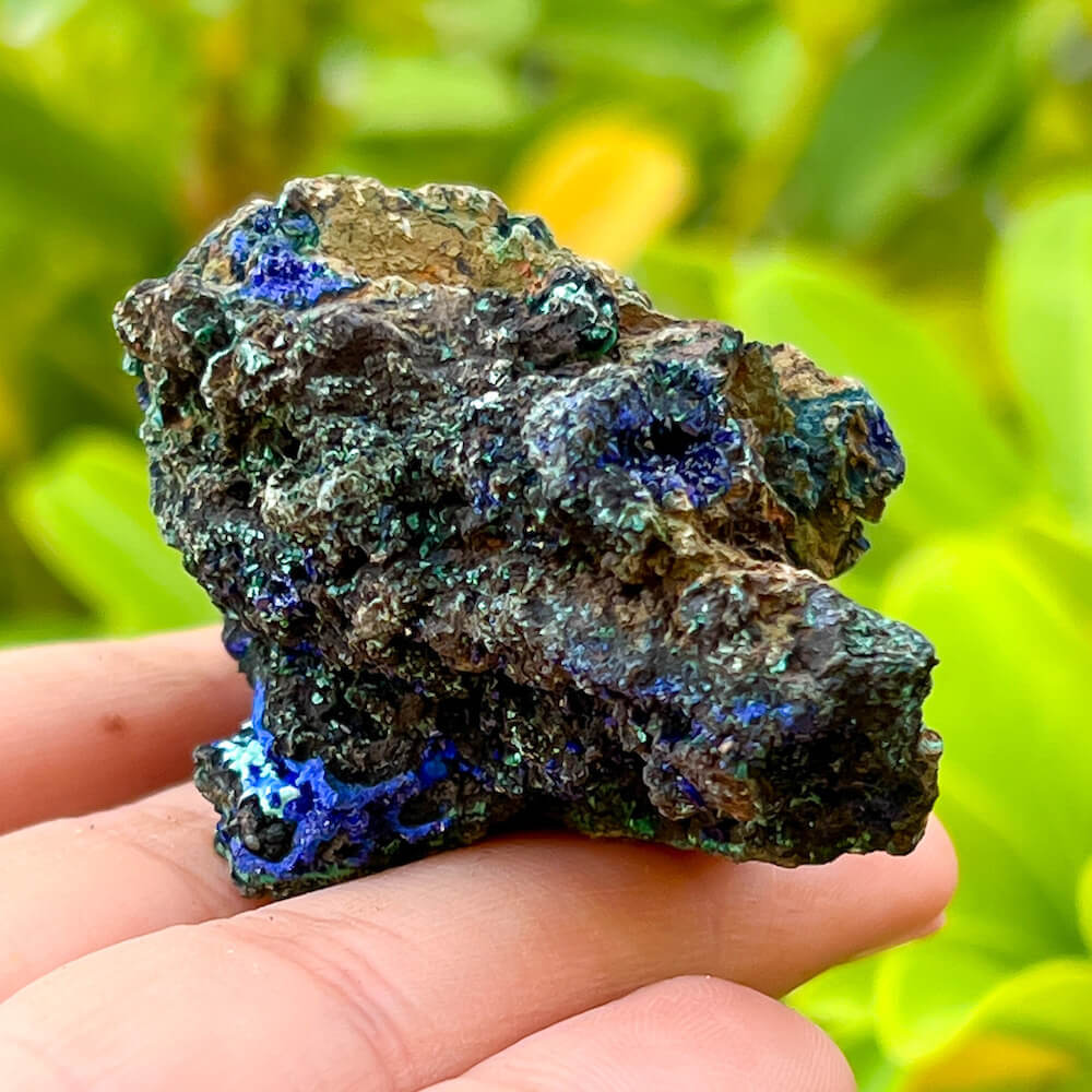 Unidos como azurita-malaquita, se cree que este mineral combina diferentes rasgos, refresca la visión de la vida del usuario y disuelve las características egocéntricas; disipando la presunción, la arrogancia y la vanidad y mejorando la flexibilidad en el movimiento y el pensamiento. Expande la conciencia, crea un equilibrio emocional y activa un escudo protector contra las fuerzas negativas u hostiles.