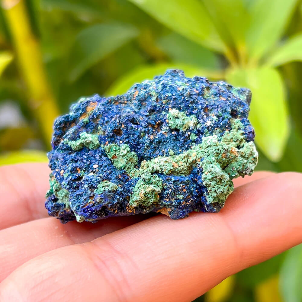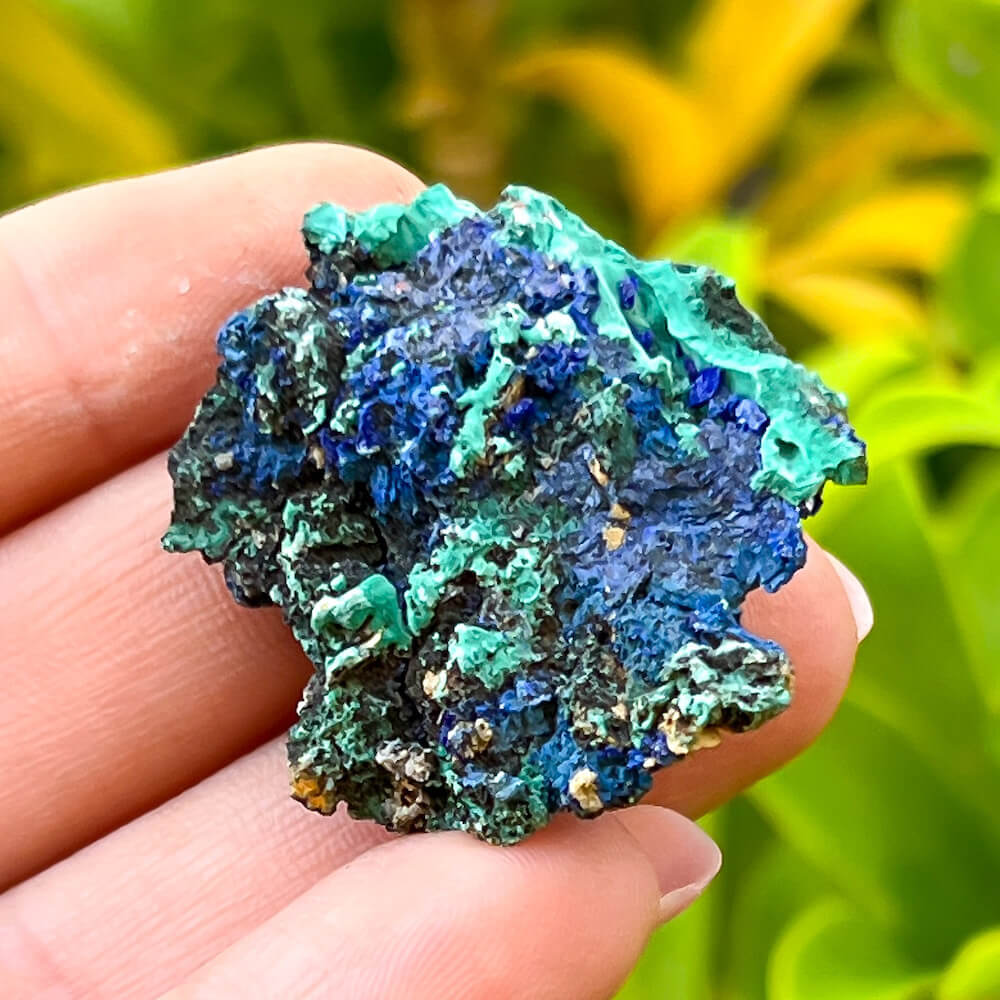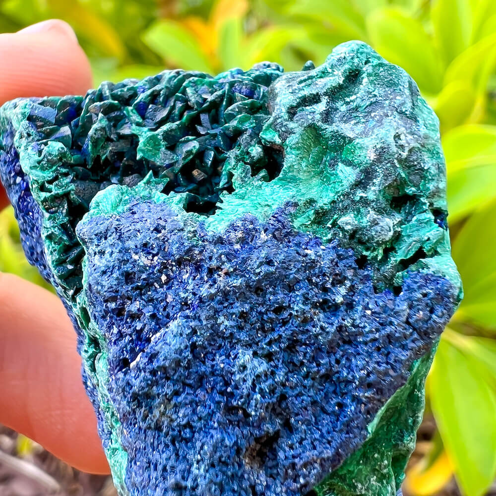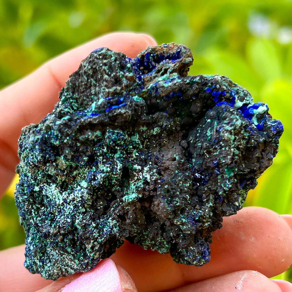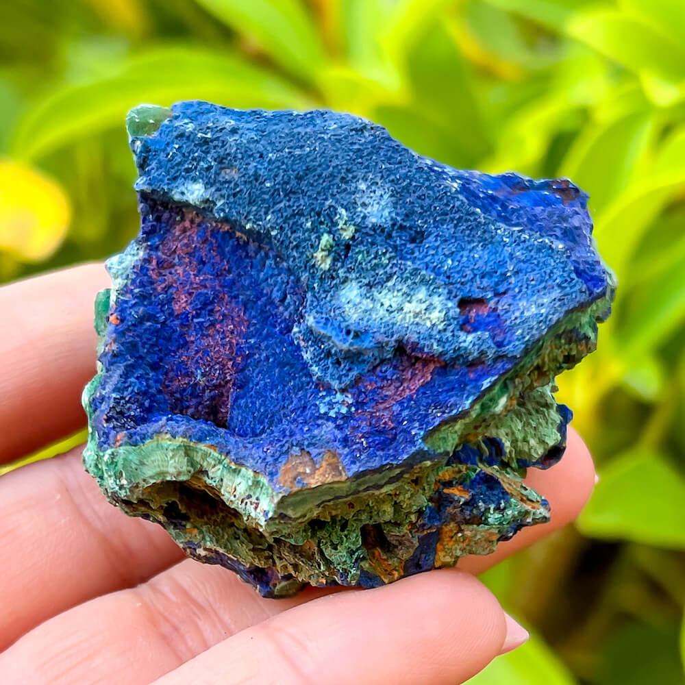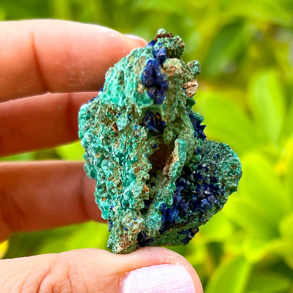 Unidos como azurita-malaquita, se cree que este mineral combina diferentes rasgos, refresca la visión de la vida del usuario y disuelve las características egocéntricas; disipando la presunción, la arrogancia y la vanidad y mejorando la flexibilidad en el movimiento y el pensamiento. Expande la conciencia, crea un equilibrio emocional y activa un escudo protector contra las fuerzas negativas u hostiles.