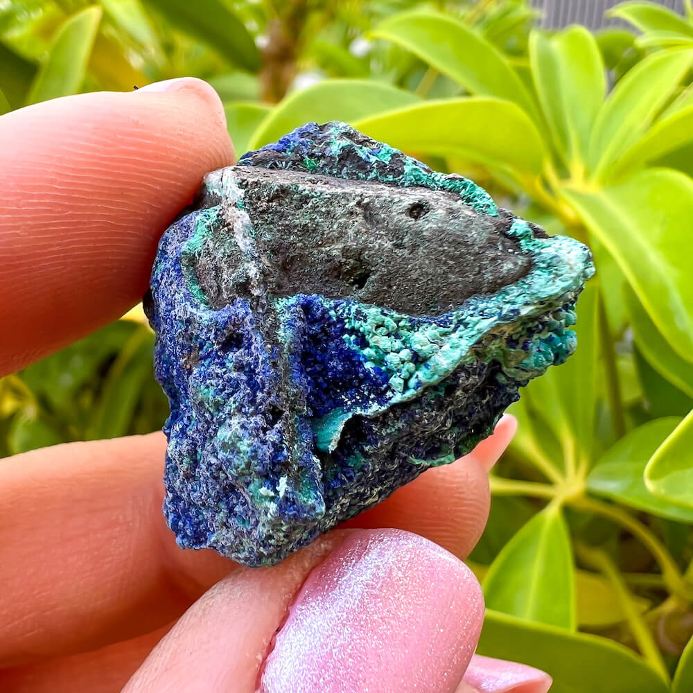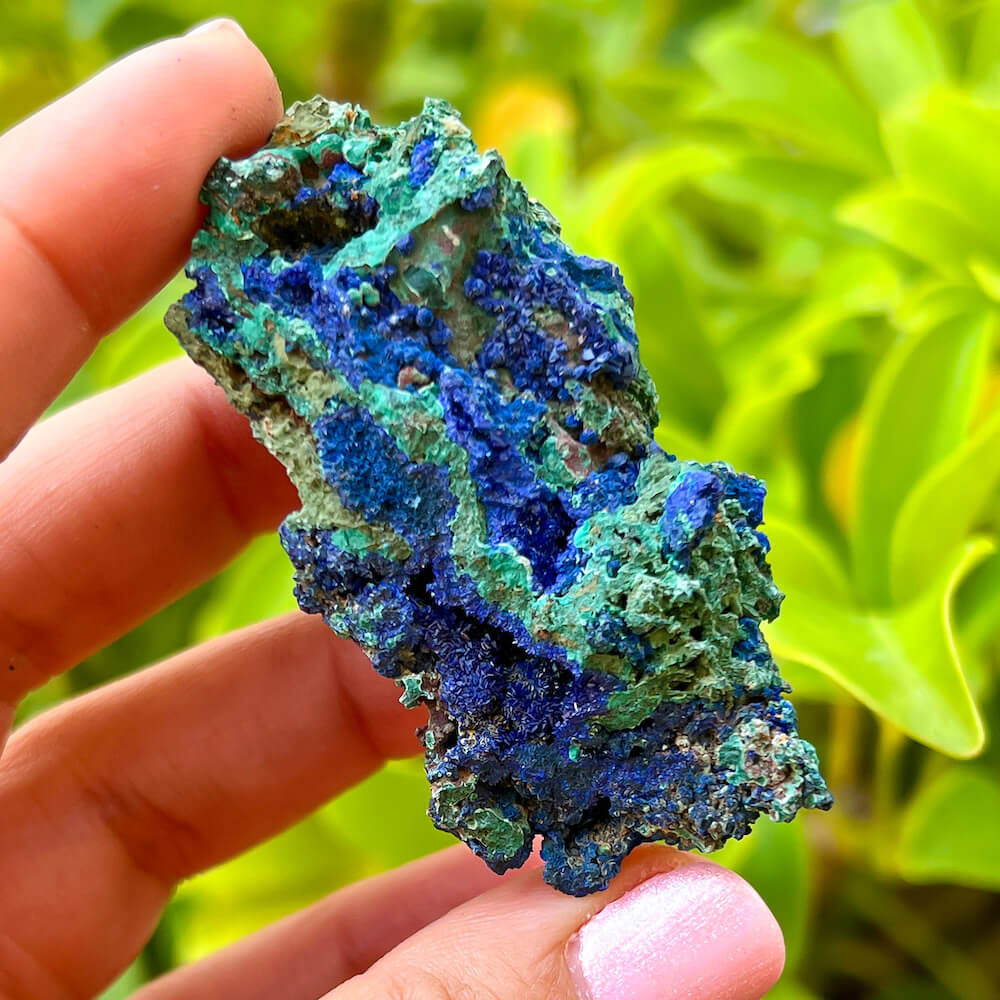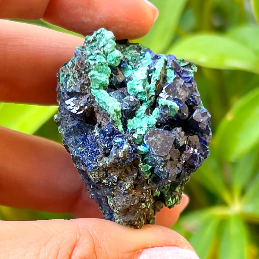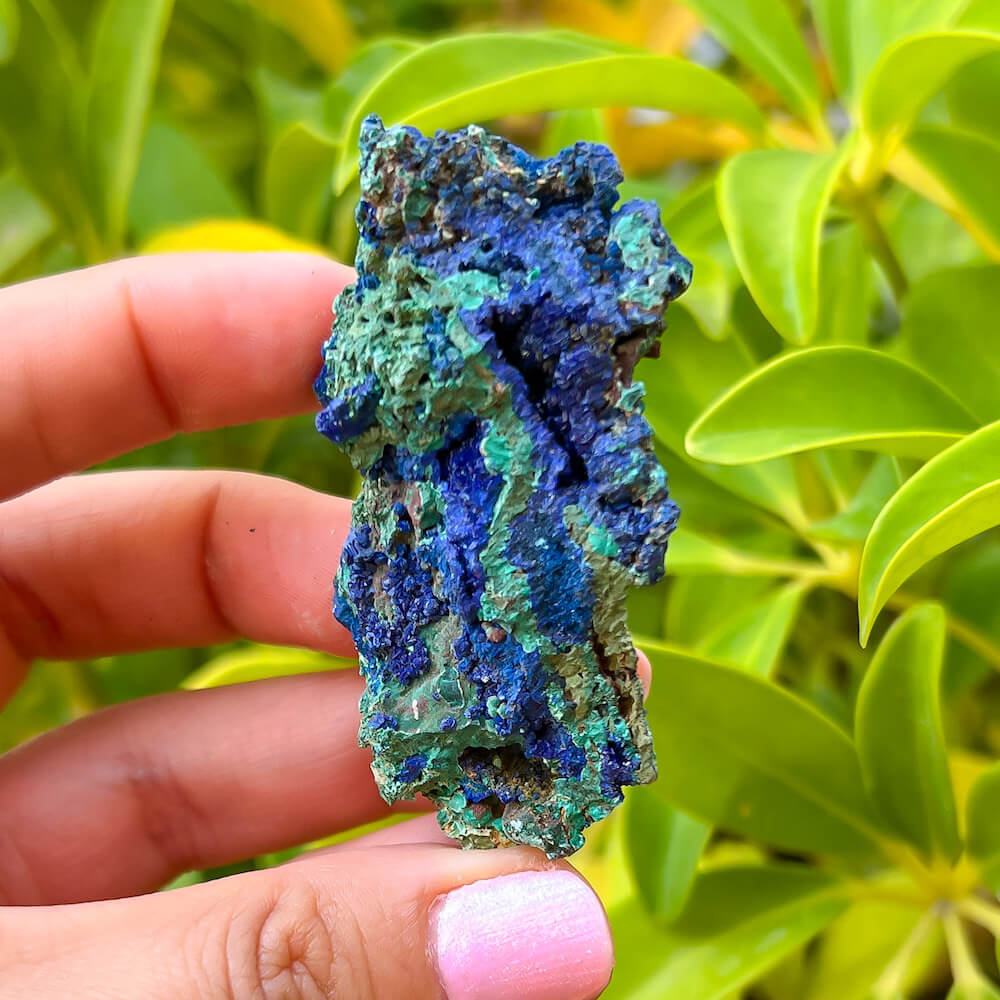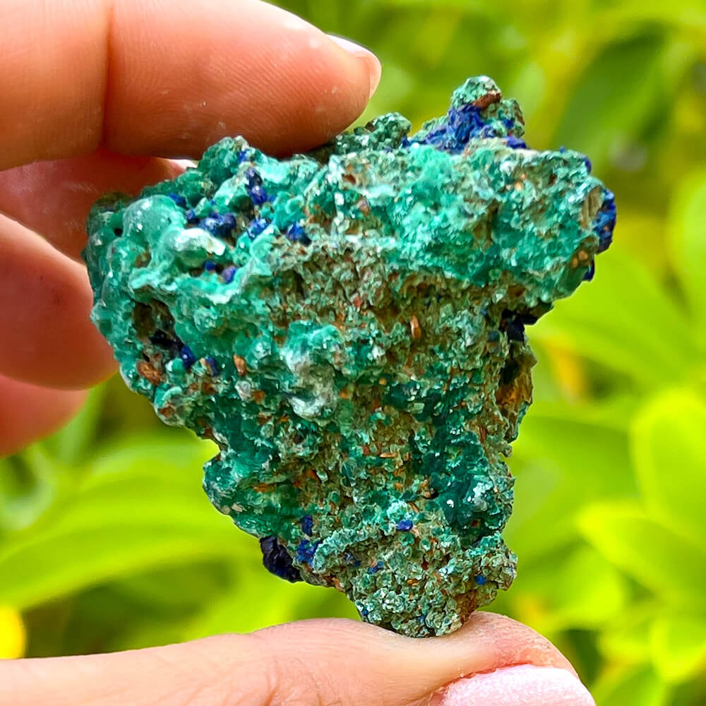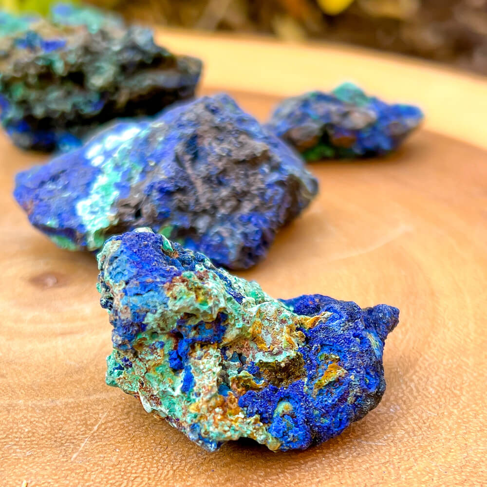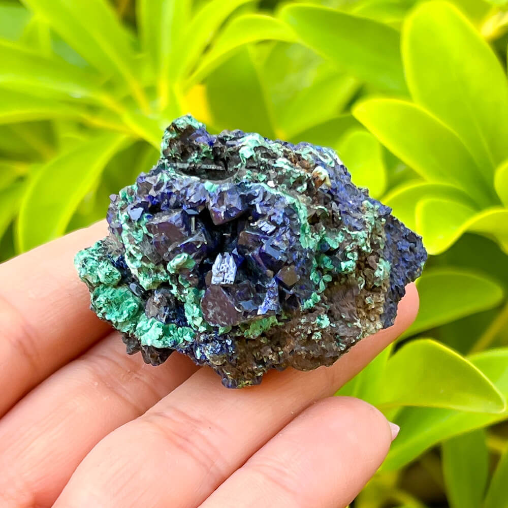Unidos como azurita-malaquita, se cree que este mineral combina diferentes rasgos, refresca la visión de la vida del usuario y disuelve las características egocéntricas; disipando la presunción, la arrogancia y la vanidad y mejorando la flexibilidad en el movimiento y el pensamiento. Expande la conciencia, crea un equilibrio emocional y activa un escudo protector contra las fuerzas negativas u hostiles.
