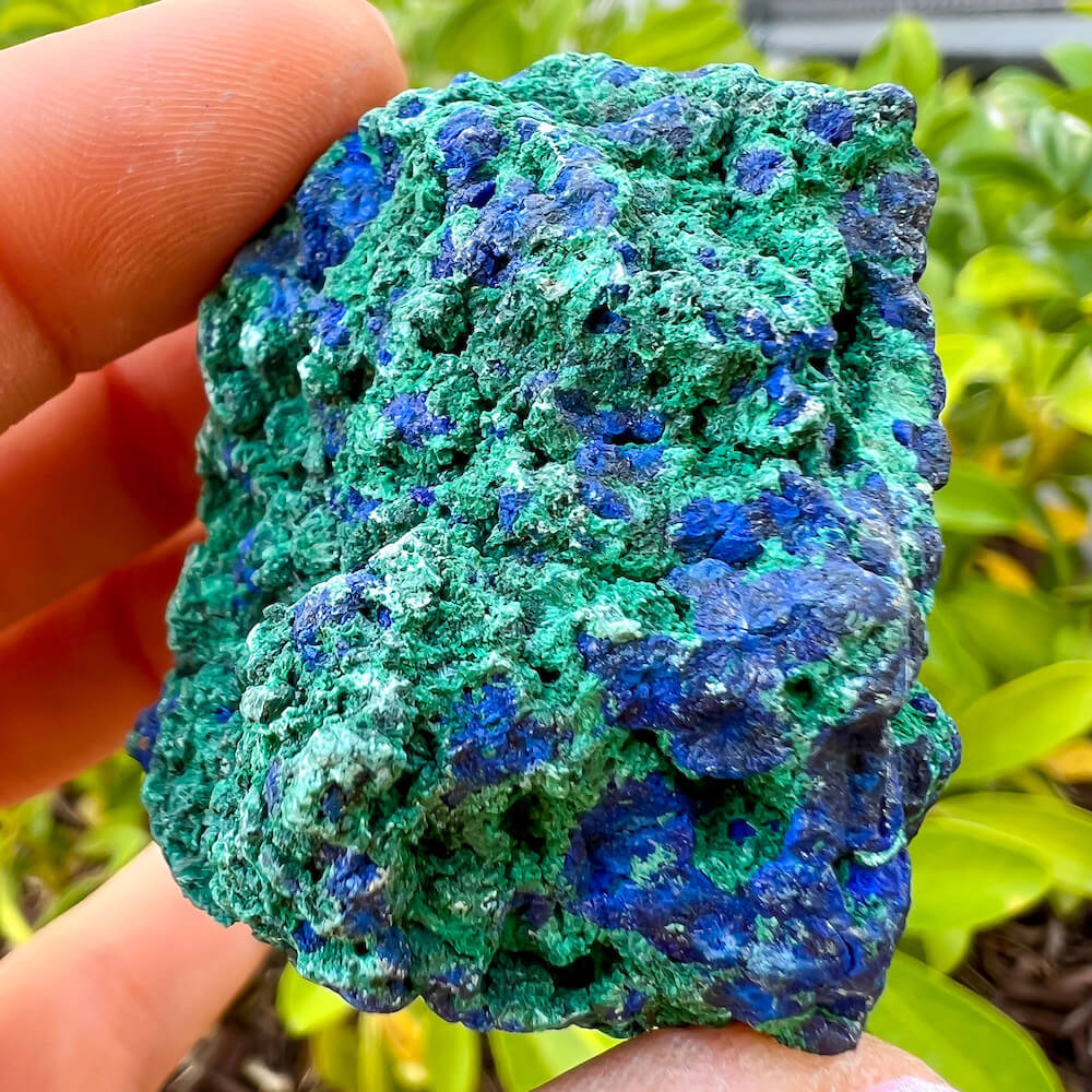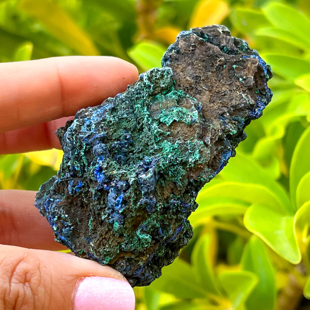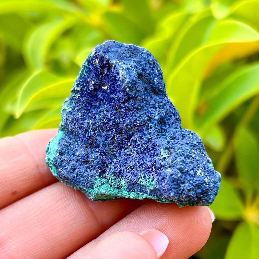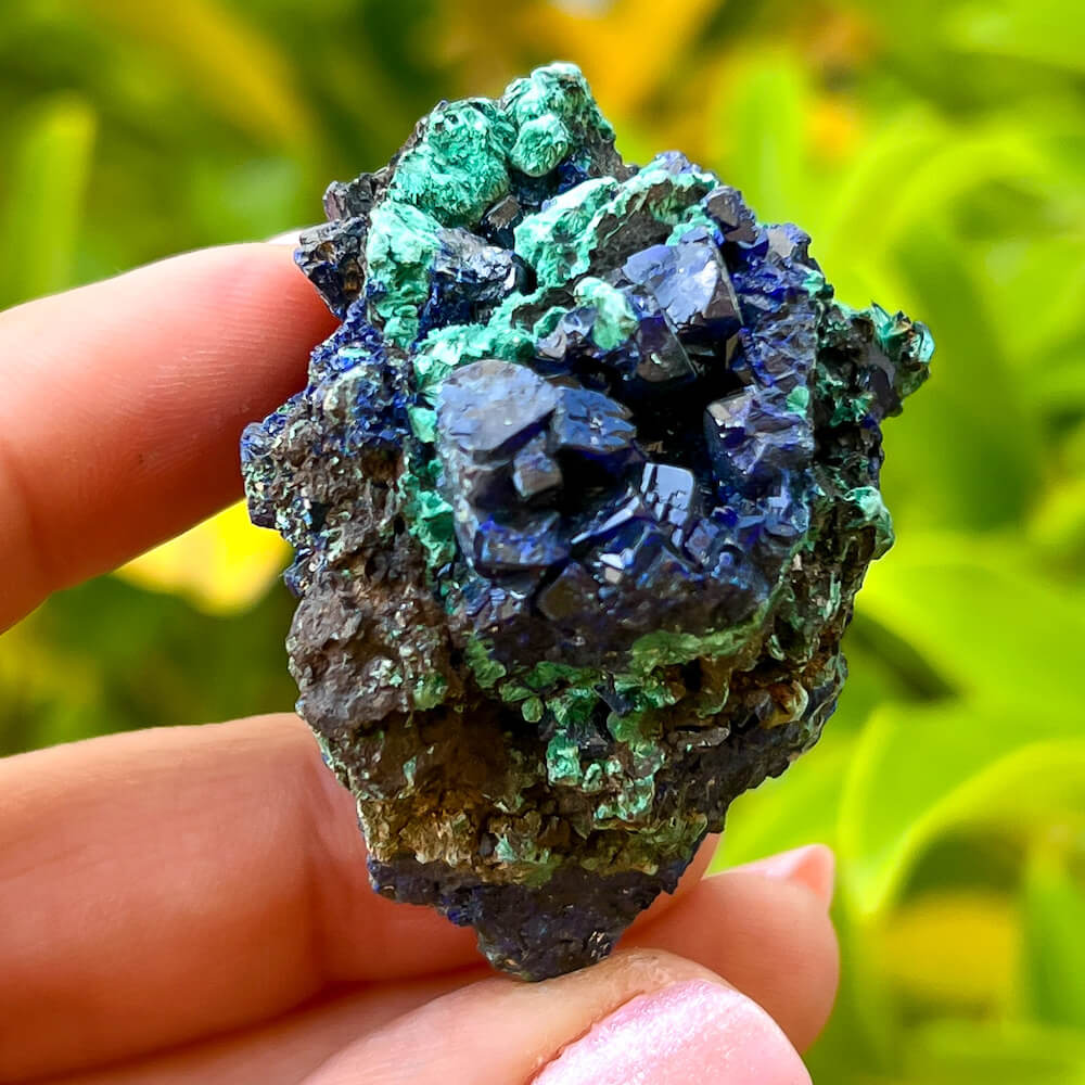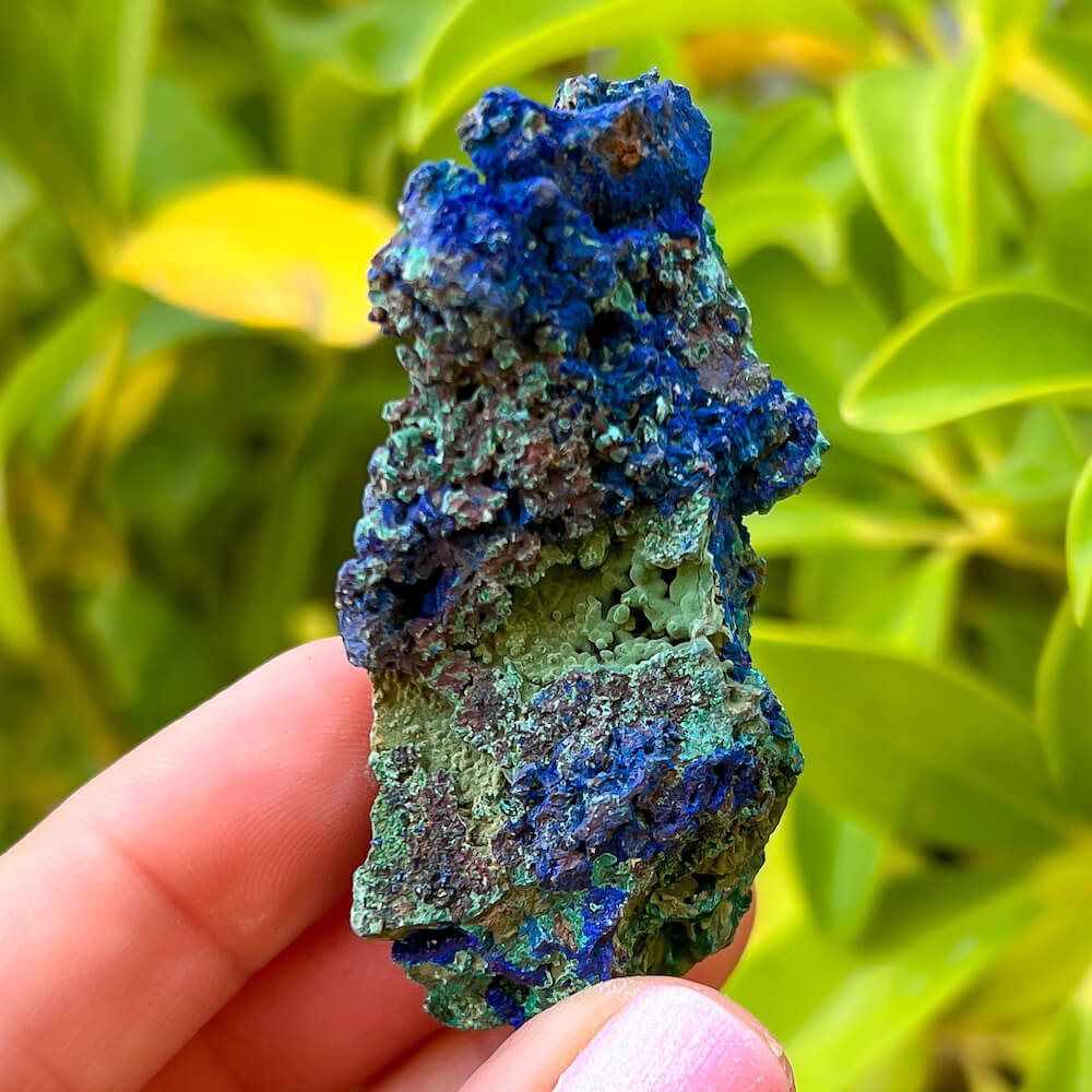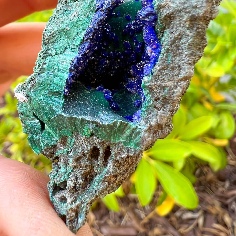 Unidos como azurita-malaquita, se cree que este mineral combina diferentes rasgos, refresca la visión de la vida del usuario y disuelve las características egocéntricas; disipando la presunción, la arrogancia y la vanidad y mejorando la flexibilidad en el movimiento y el pensamiento. Expande la conciencia, crea un equilibrio emocional y activa un escudo protector contra las fuerzas negativas u hostiles.