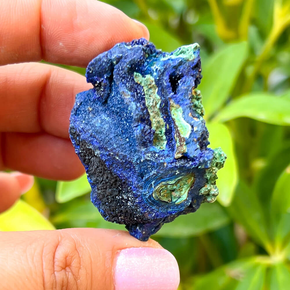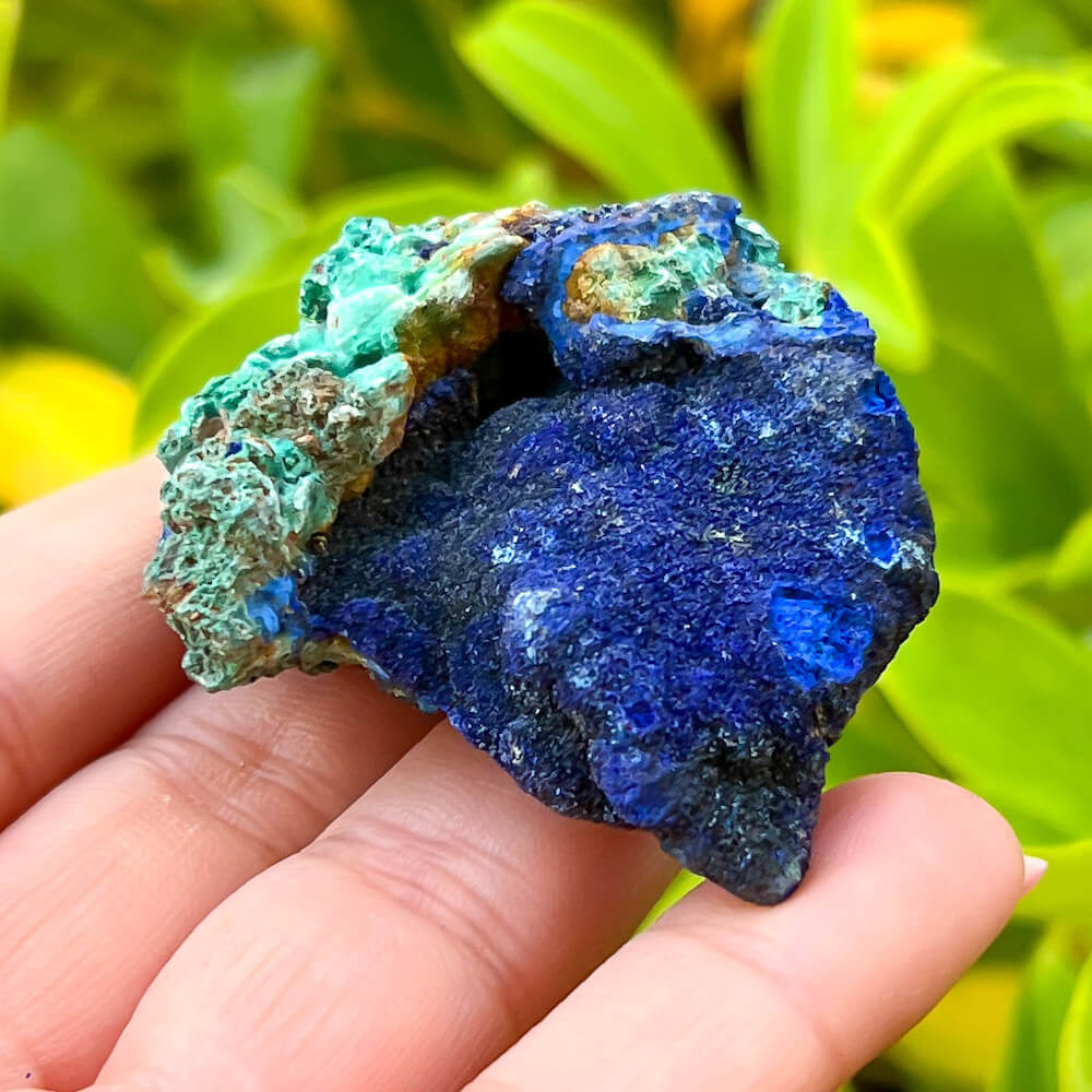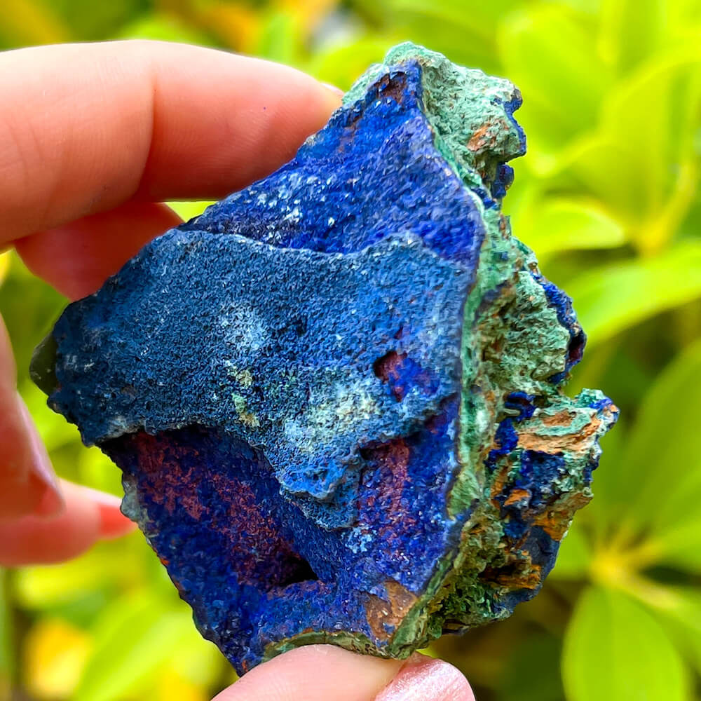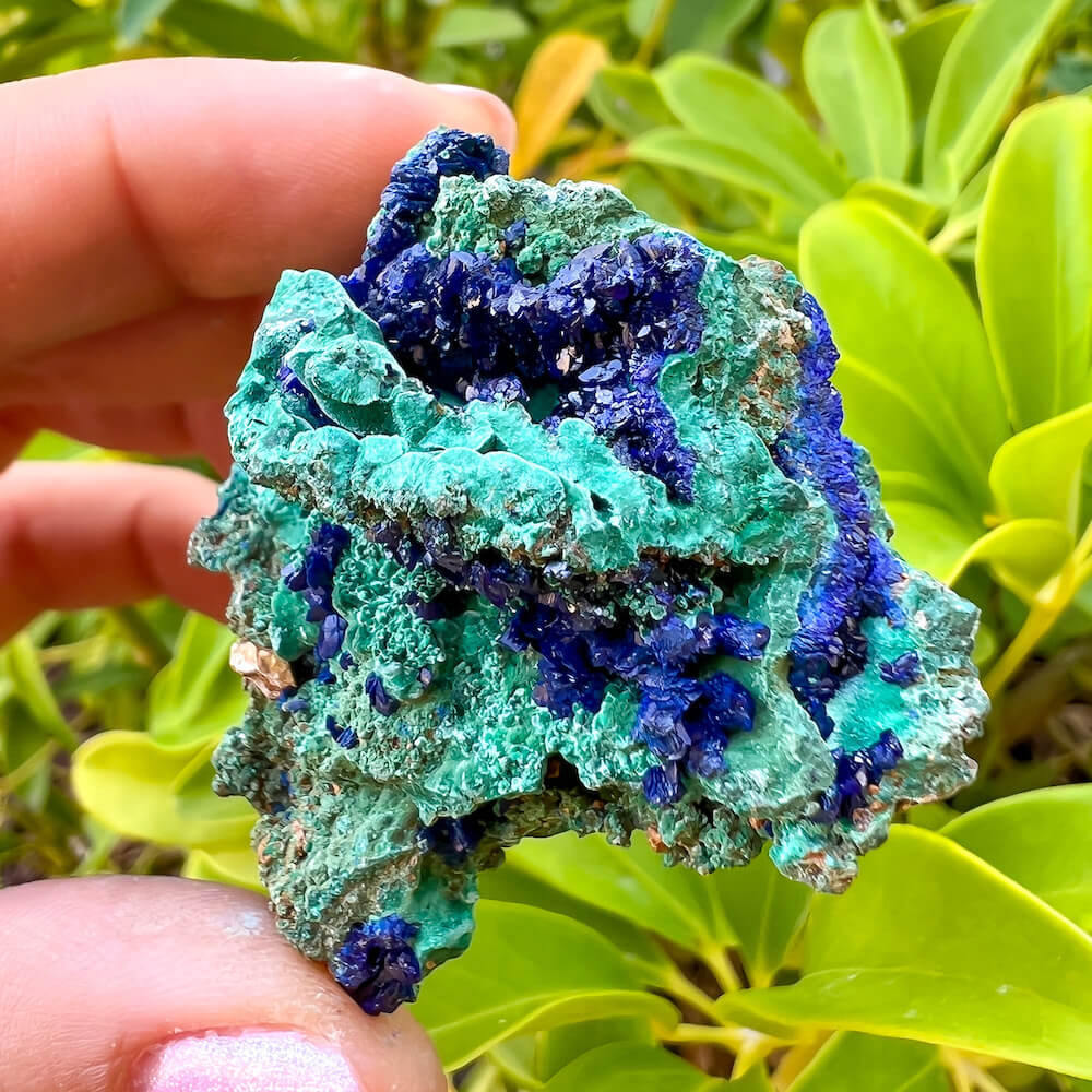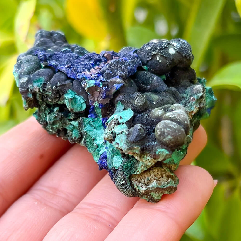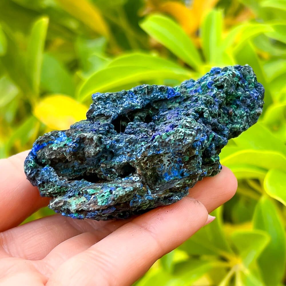 Unidos como azurita-malaquita, se cree que este mineral combina diferentes rasgos, refresca la visión de la vida del usuario y disuelve las características egocéntricas; disipando la presunción, la arrogancia y la vanidad y mejorando la flexibilidad en el movimiento y el pensamiento. Expande la conciencia, crea un equilibrio emocional y activa un escudo protector contra las fuerzas negativas u hostiles.