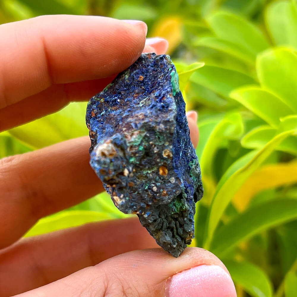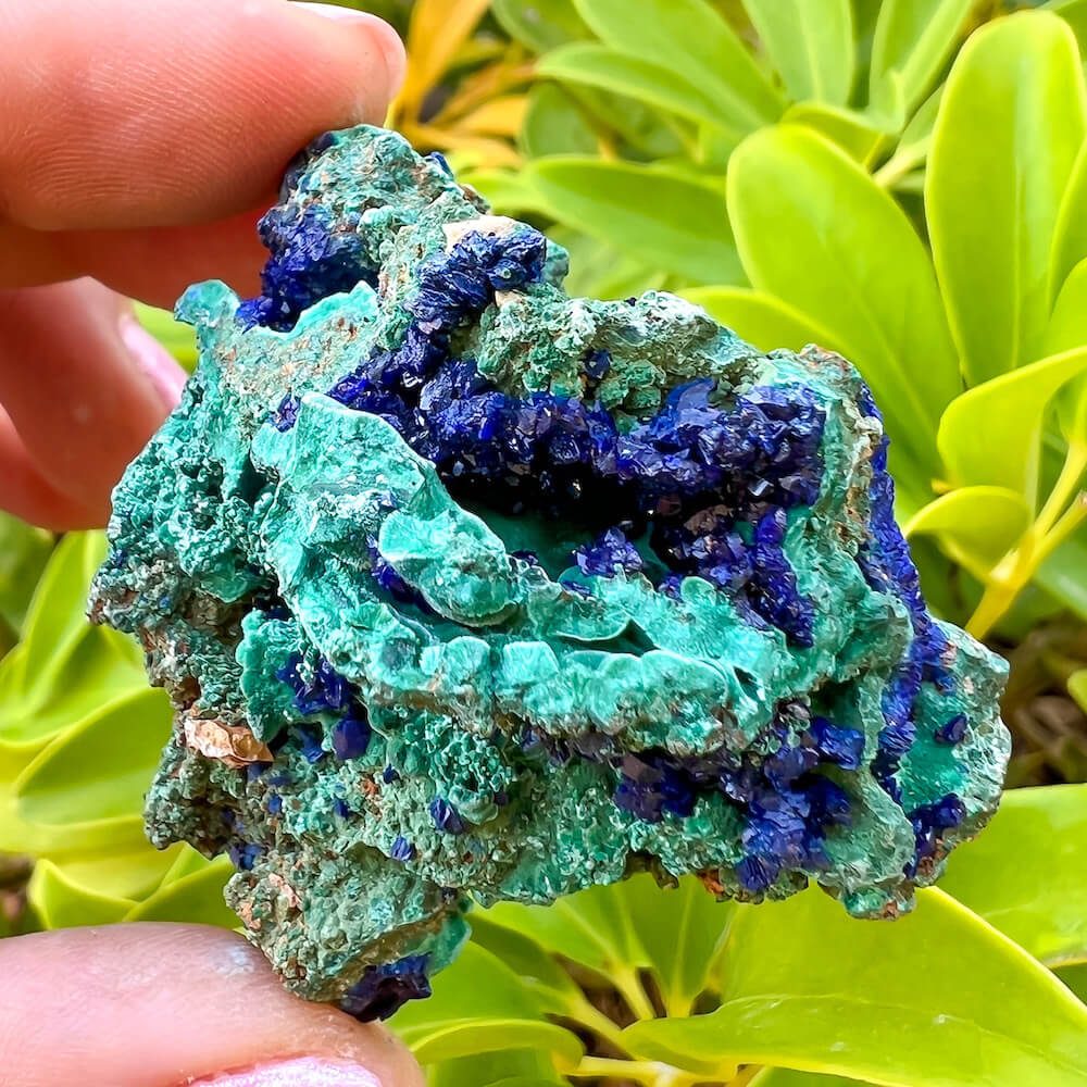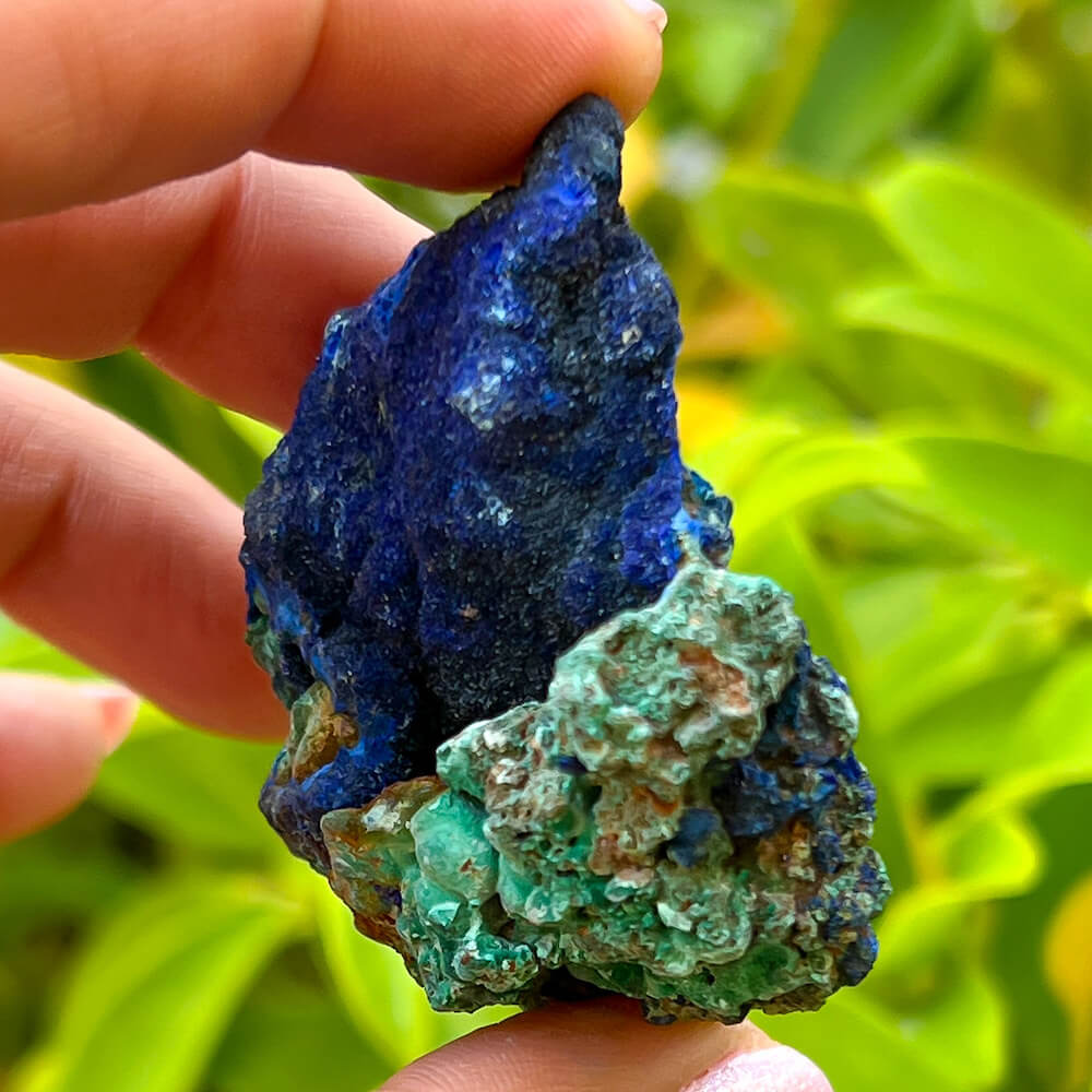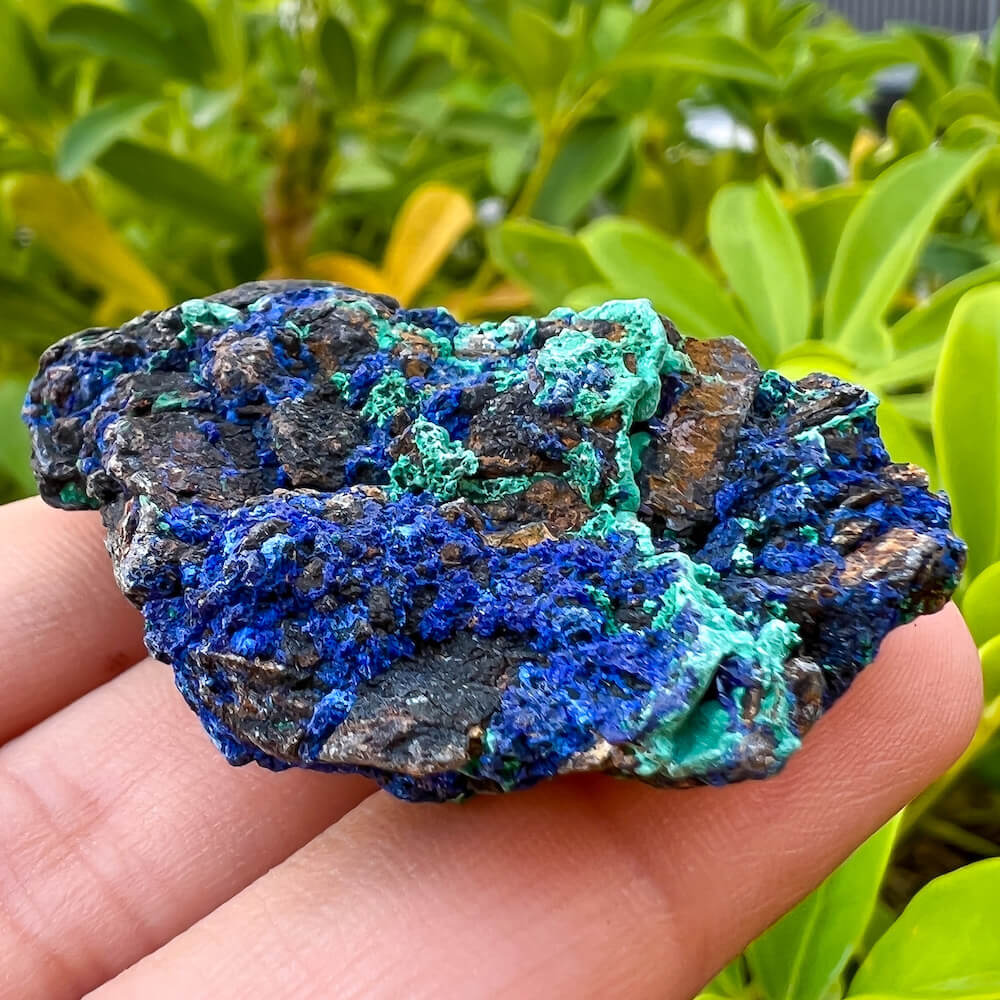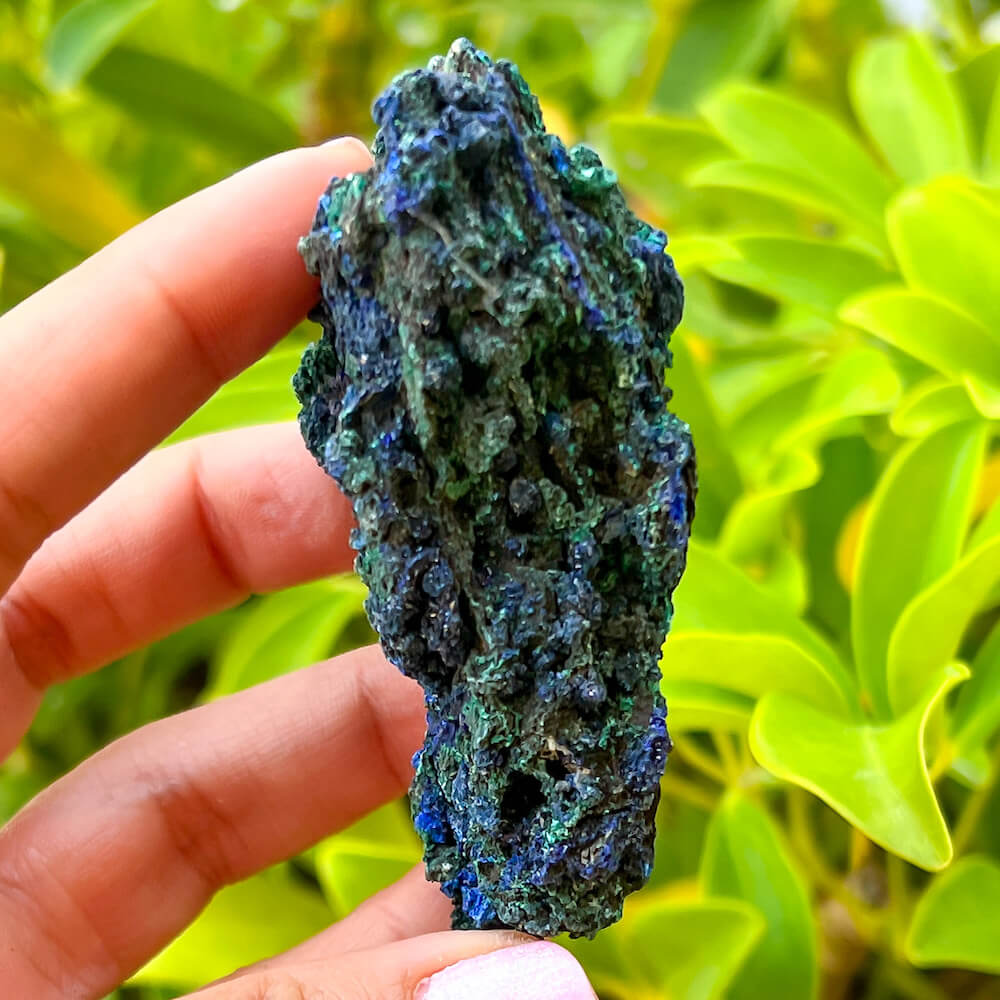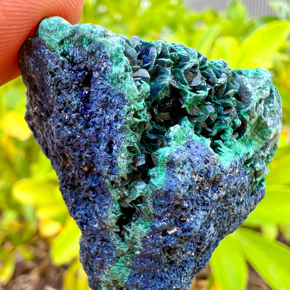 Unidos como azurita-malaquita, se cree que este mineral combina diferentes rasgos, refresca la visión de la vida del usuario y disuelve las características egocéntricas; disipando la presunción, la arrogancia y la vanidad y mejorando la flexibilidad en el movimiento y el pensamiento. Expande la conciencia, crea un equilibrio emocional y activa un escudo protector contra las fuerzas negativas u hostiles.