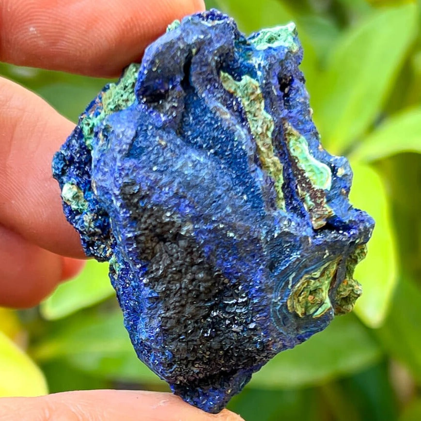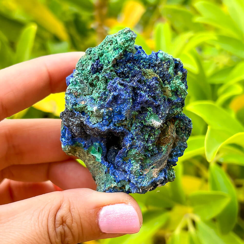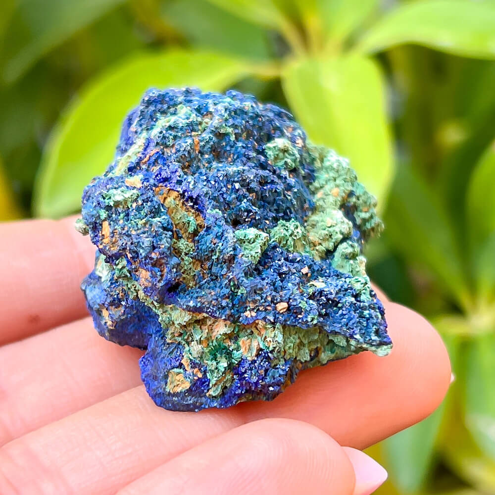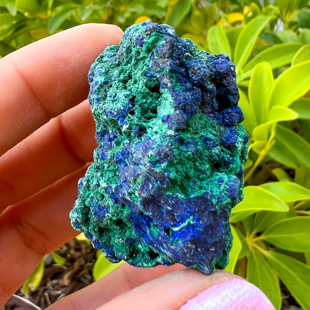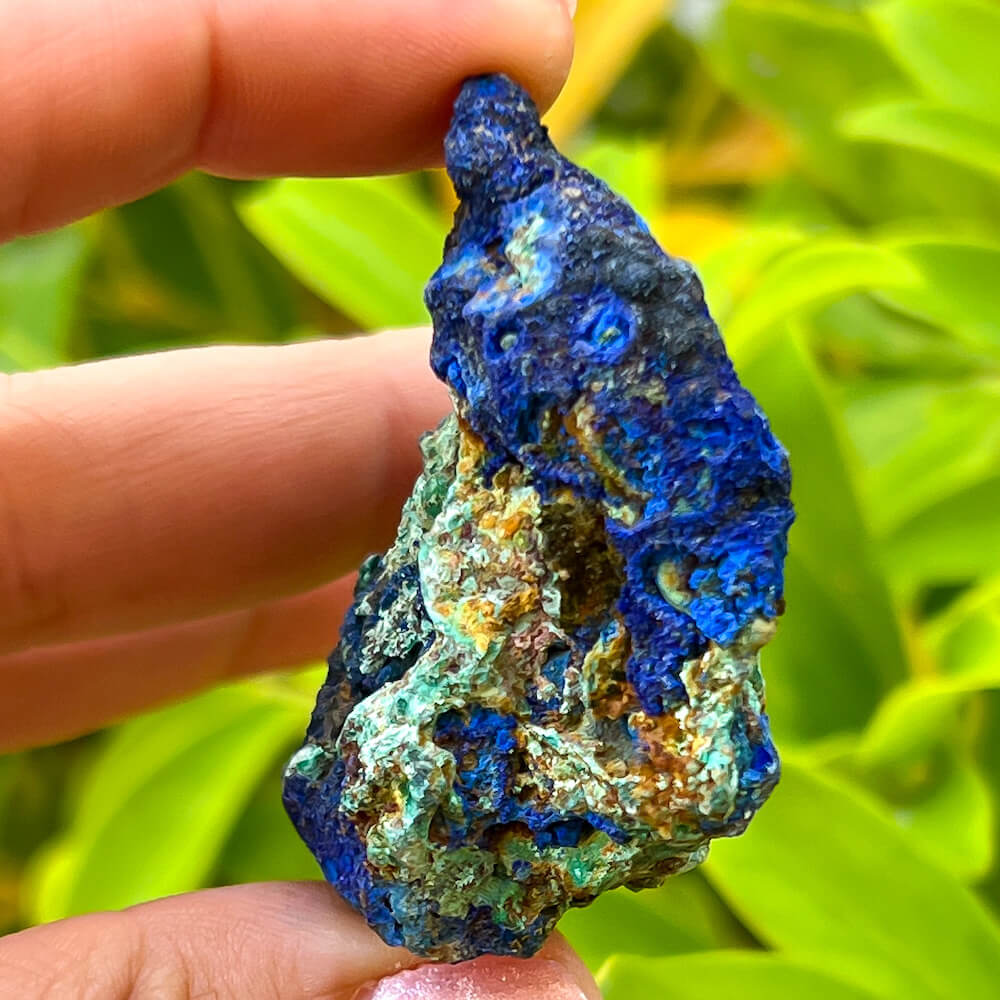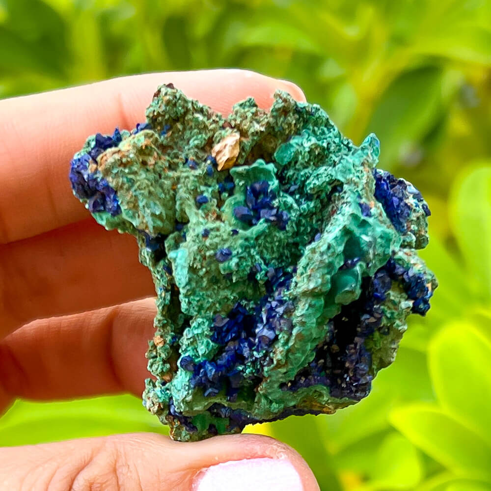 Unidos como azurita-malaquita, se cree que este mineral combina diferentes rasgos, refresca la visión de la vida del usuario y disuelve las características egocéntricas; disipando la presunción, la arrogancia y la vanidad y mejorando la flexibilidad en el movimiento y el pensamiento. Expande la conciencia, crea un equilibrio emocional y activa un escudo protector contra las fuerzas negativas u hostiles.