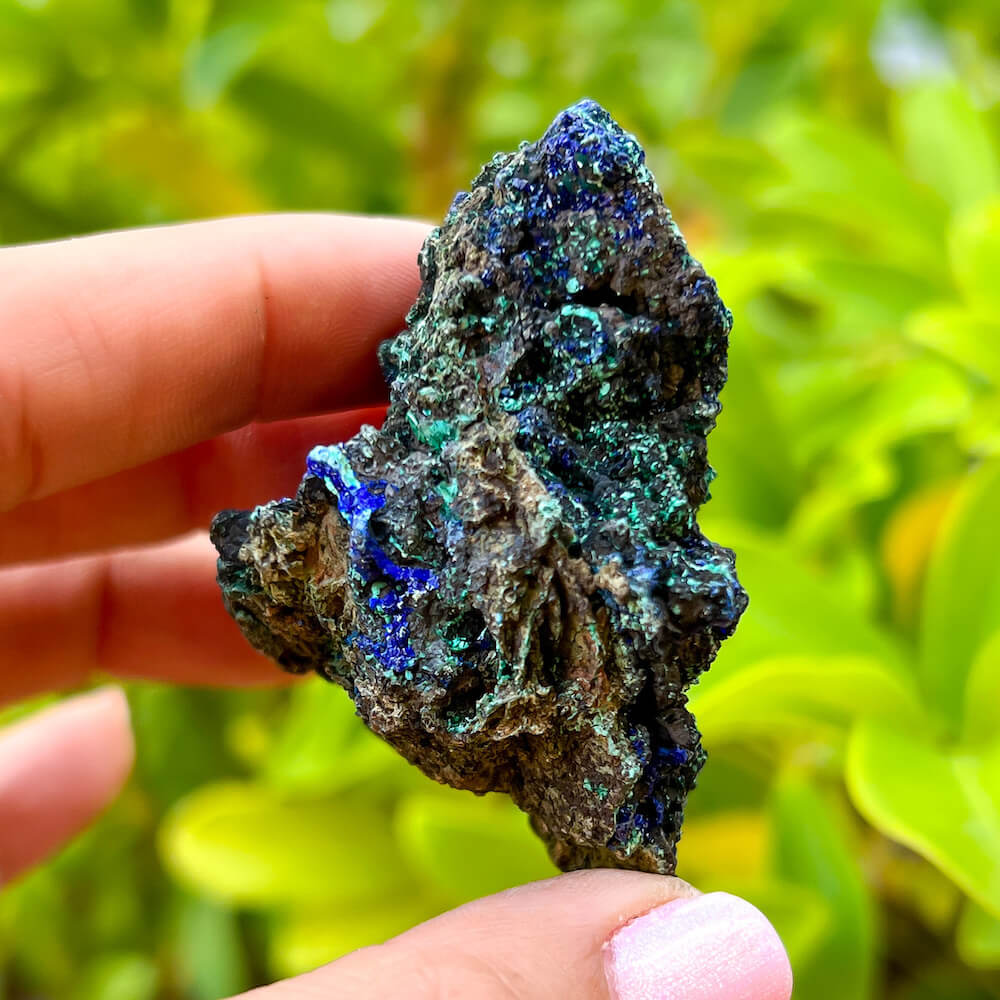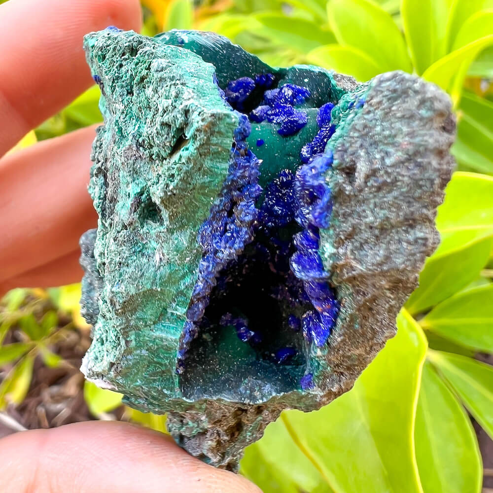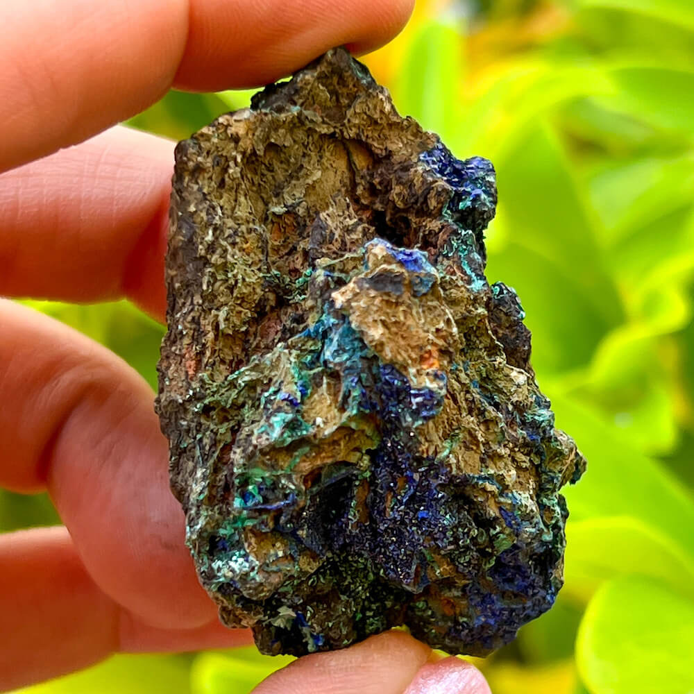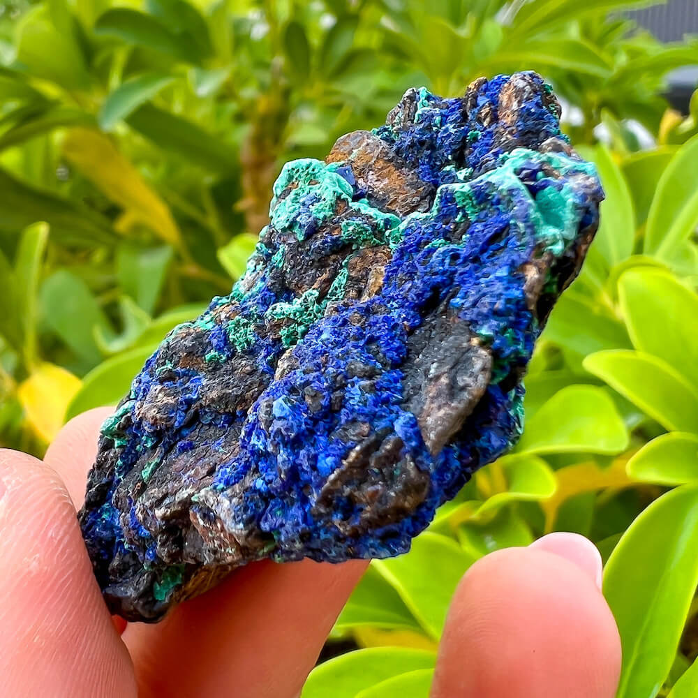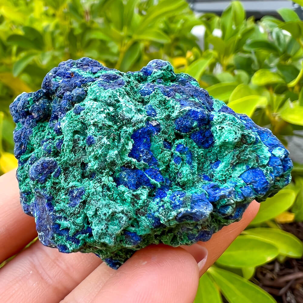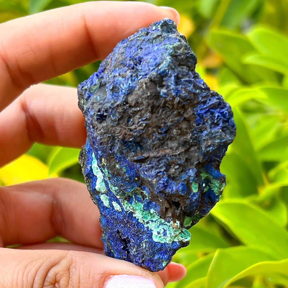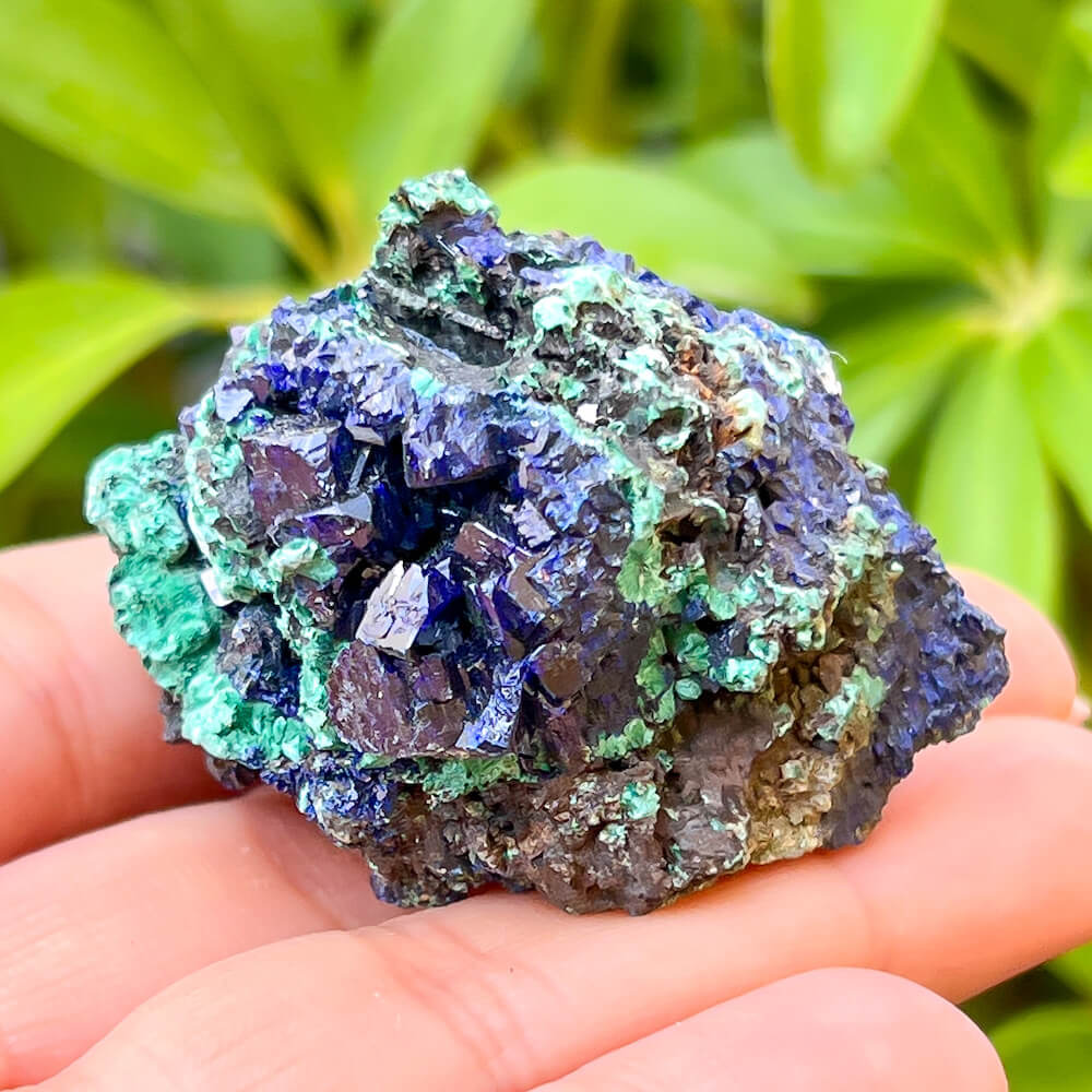 Unidos como azurita-malaquita, se cree que este mineral combina diferentes rasgos, refresca la visión de la vida del usuario y disuelve las características egocéntricas; disipando la presunción, la arrogancia y la vanidad y mejorando la flexibilidad en el movimiento y el pensamiento. Expande la conciencia, crea un equilibrio emocional y activa un escudo protector contra las fuerzas negativas u hostiles.