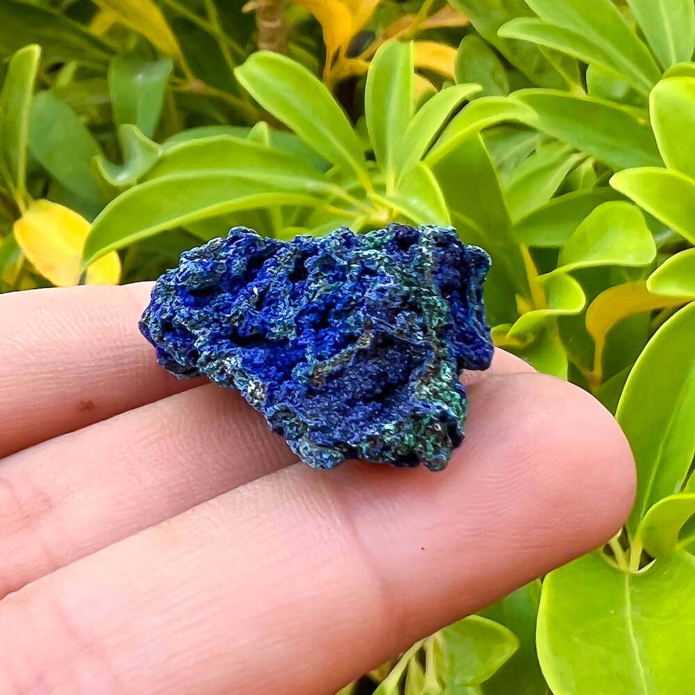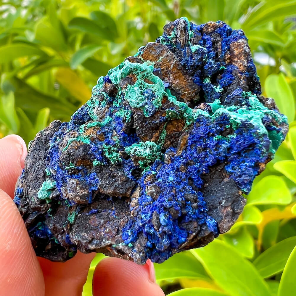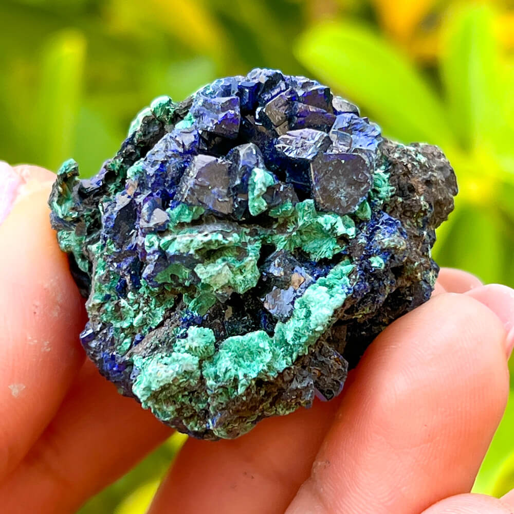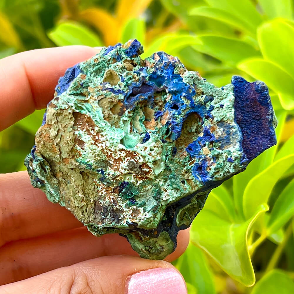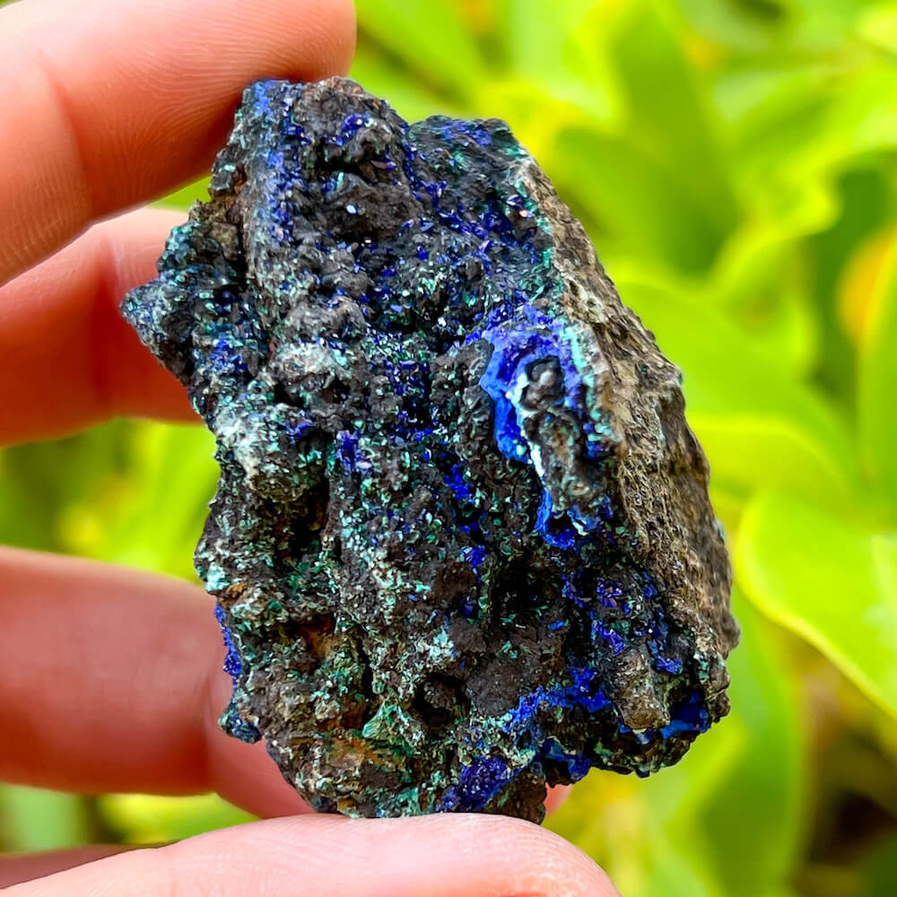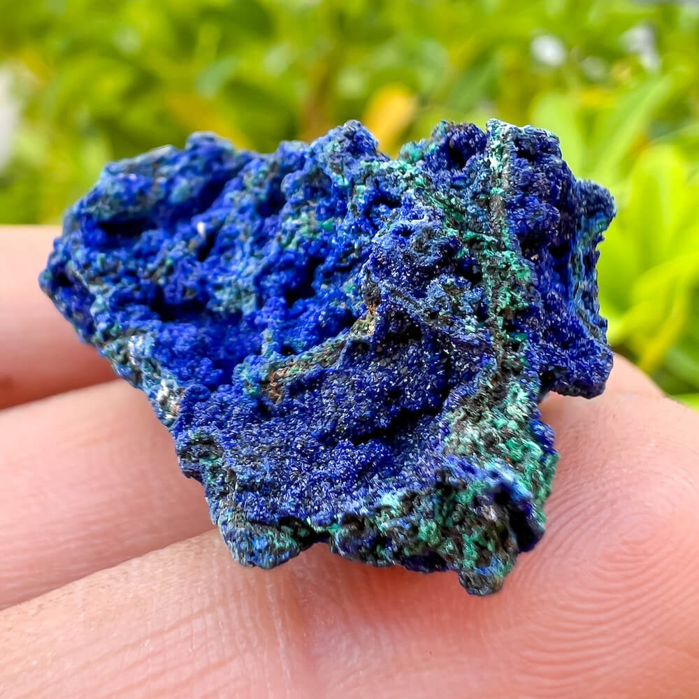 Unidos como azurita-malaquita, se cree que este mineral combina diferentes rasgos, refresca la visión de la vida del usuario y disuelve las características egocéntricas; disipando la presunción, la arrogancia y la vanidad y mejorando la flexibilidad en el movimiento y el pensamiento. Expande la conciencia, crea un equilibrio emocional y activa un escudo protector contra las fuerzas negativas u hostiles.