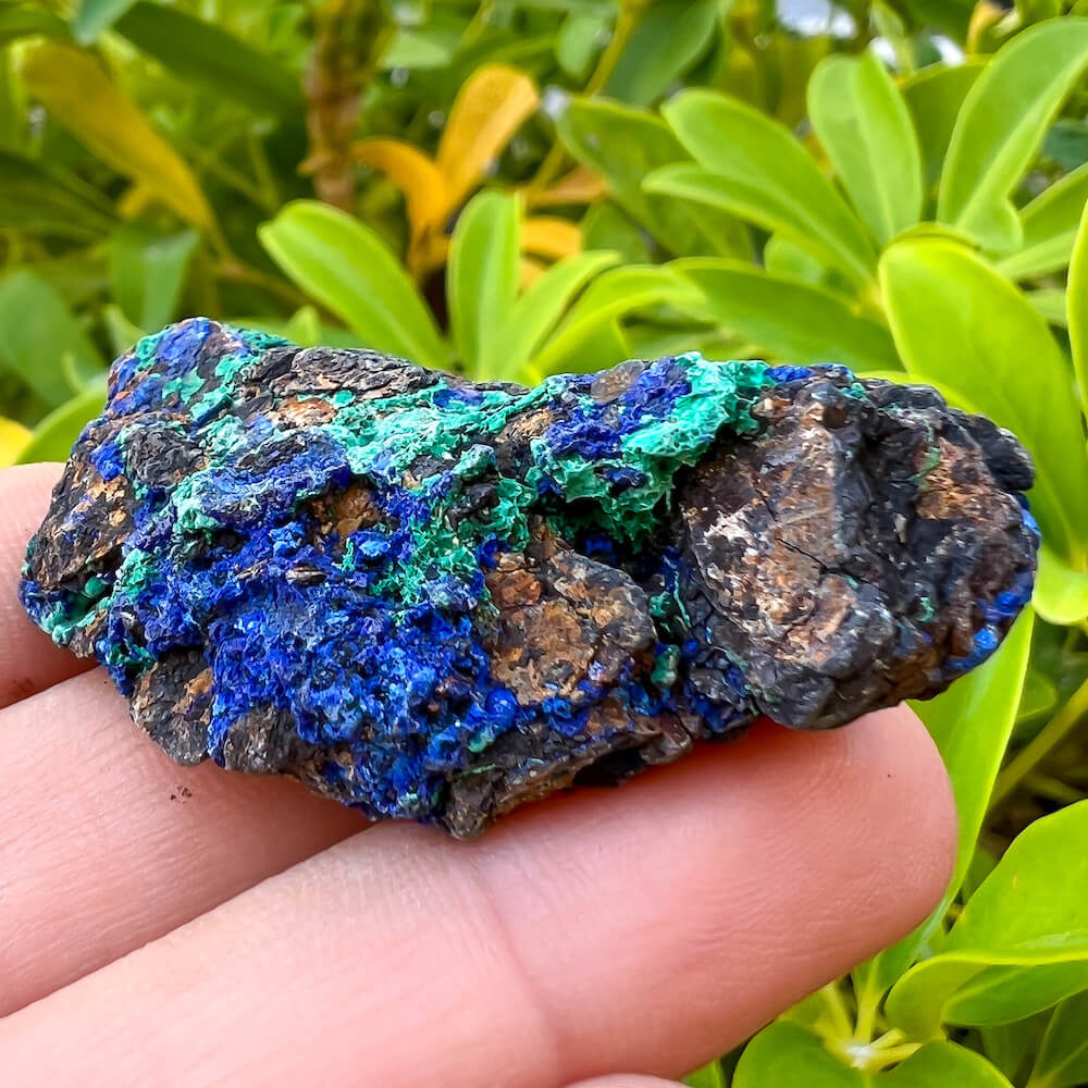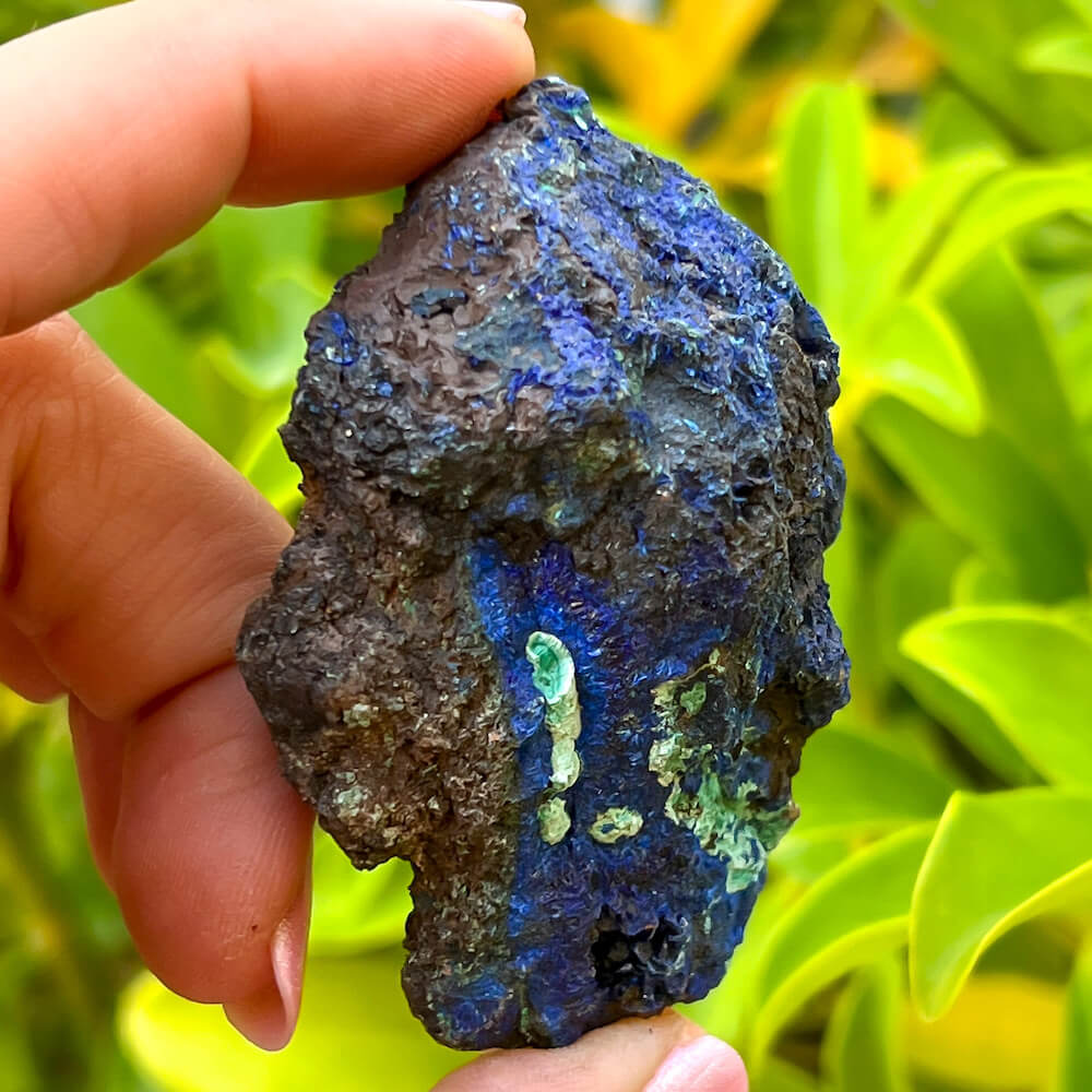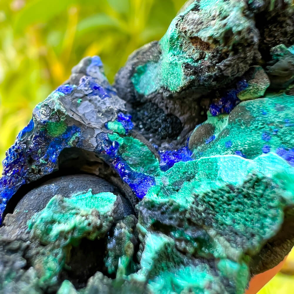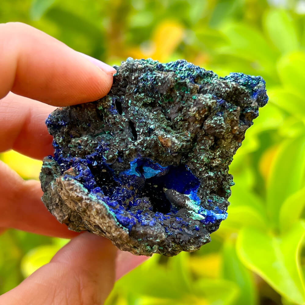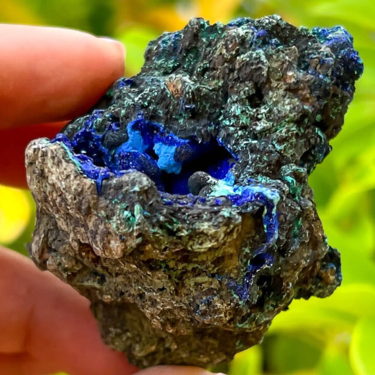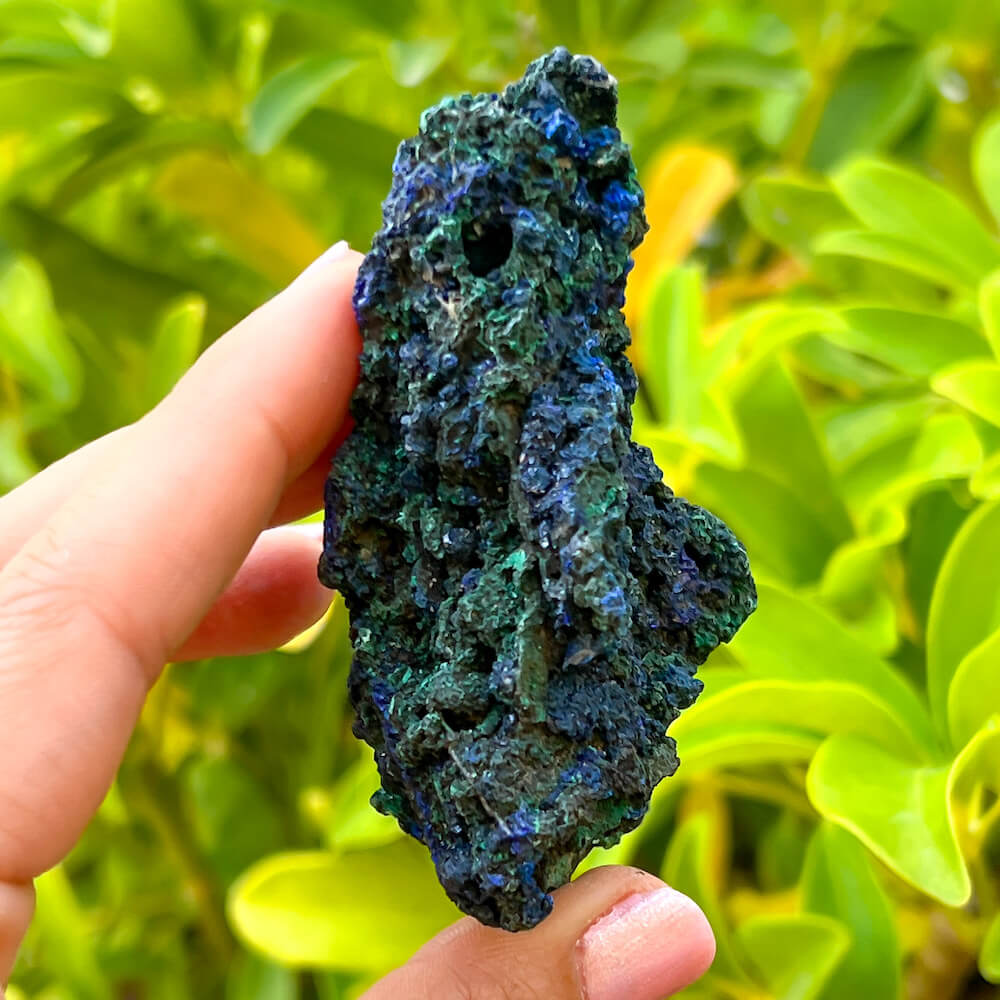 Unidos como azurita-malaquita, se cree que este mineral combina diferentes rasgos, refresca la visión de la vida del usuario y disuelve las características egocéntricas; disipando la presunción, la arrogancia y la vanidad y mejorando la flexibilidad en el movimiento y el pensamiento. Expande la conciencia, crea un equilibrio emocional y activa un escudo protector contra las fuerzas negativas u hostiles.
