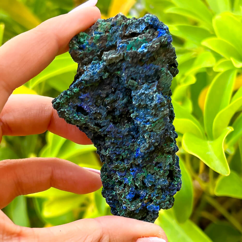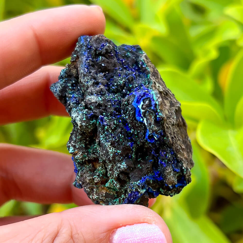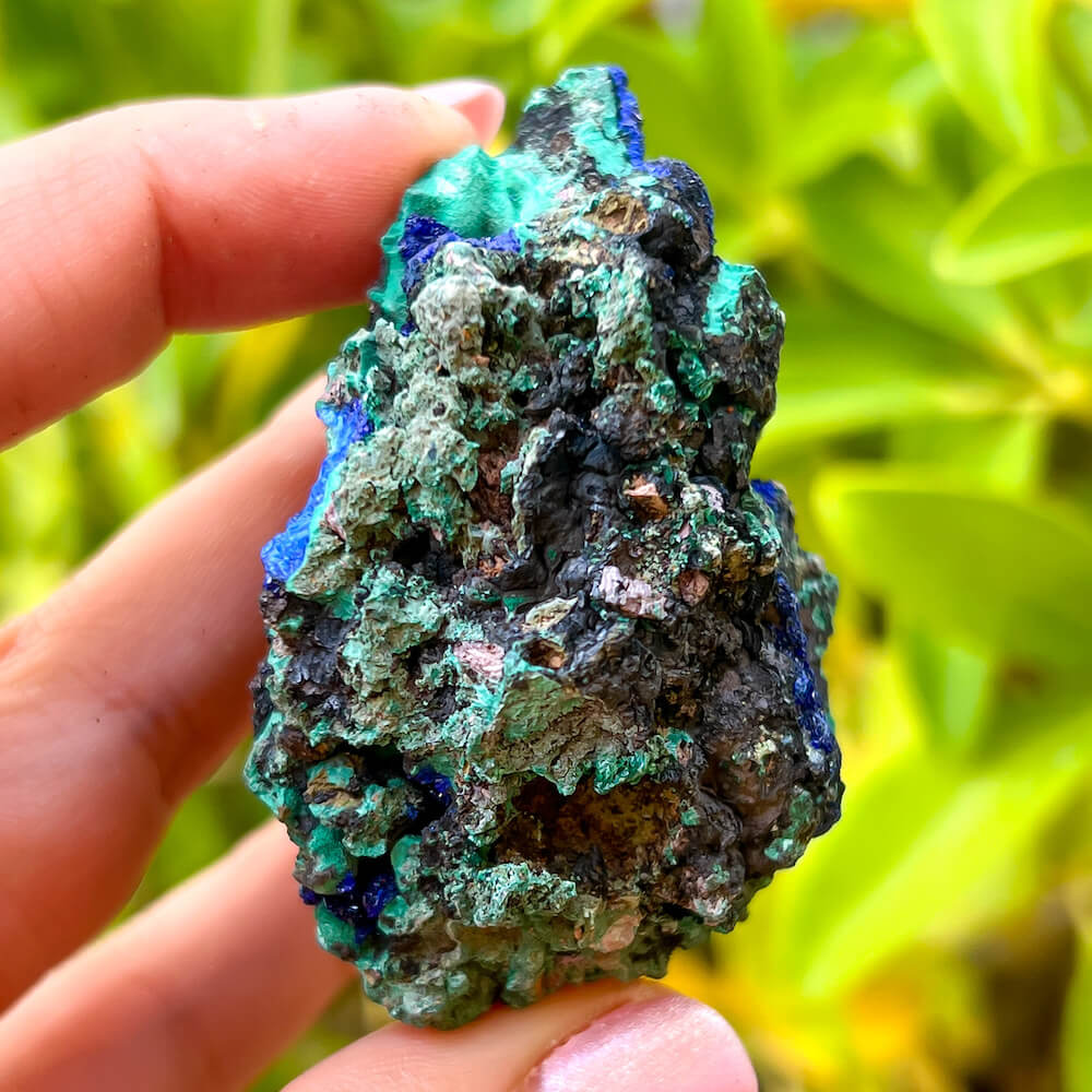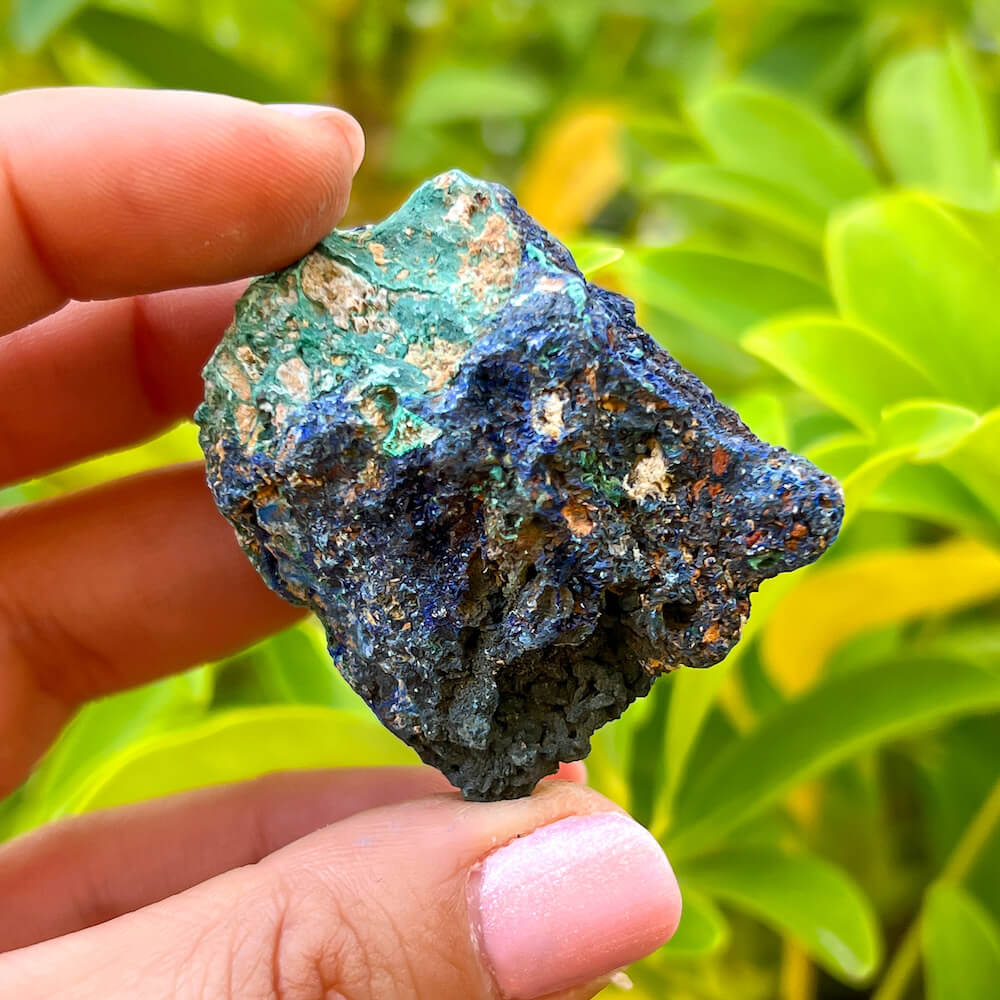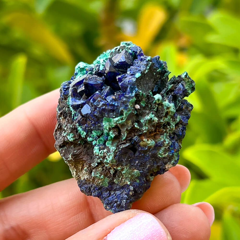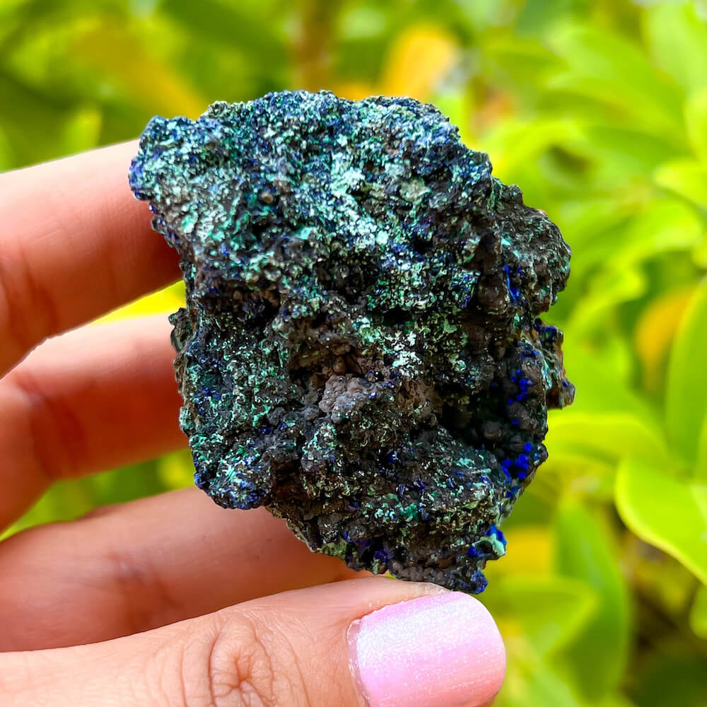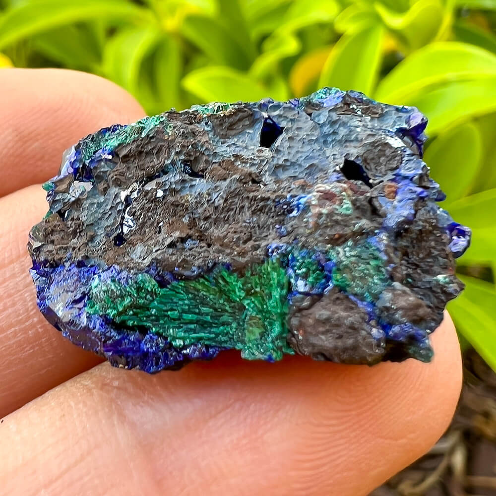 Unidos como azurita-malaquita, se cree que este mineral combina diferentes rasgos, refresca la visión de la vida del usuario y disuelve las características egocéntricas; disipando la presunción, la arrogancia y la vanidad y mejorando la flexibilidad en el movimiento y el pensamiento. Expande la conciencia, crea un equilibrio emocional y activa un escudo protector contra las fuerzas negativas u hostiles.