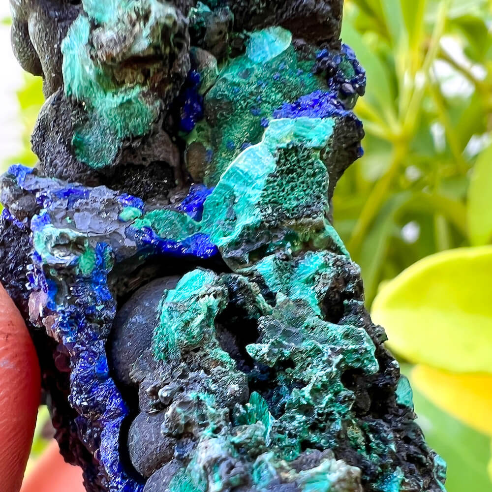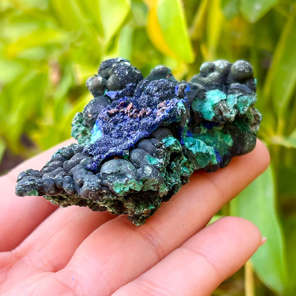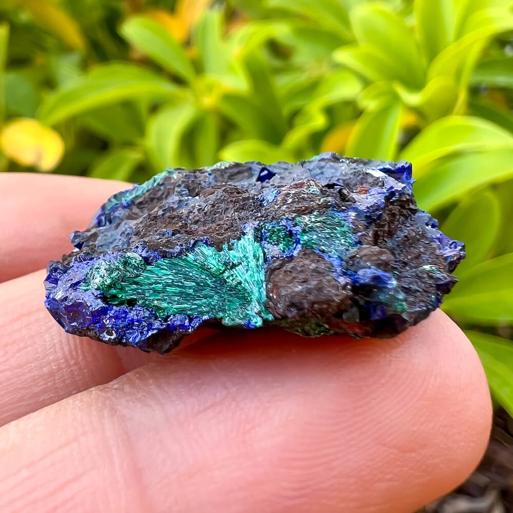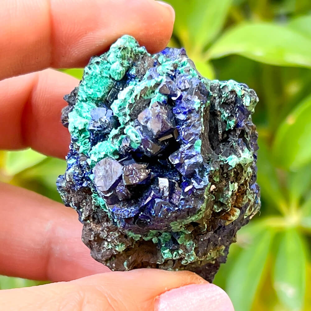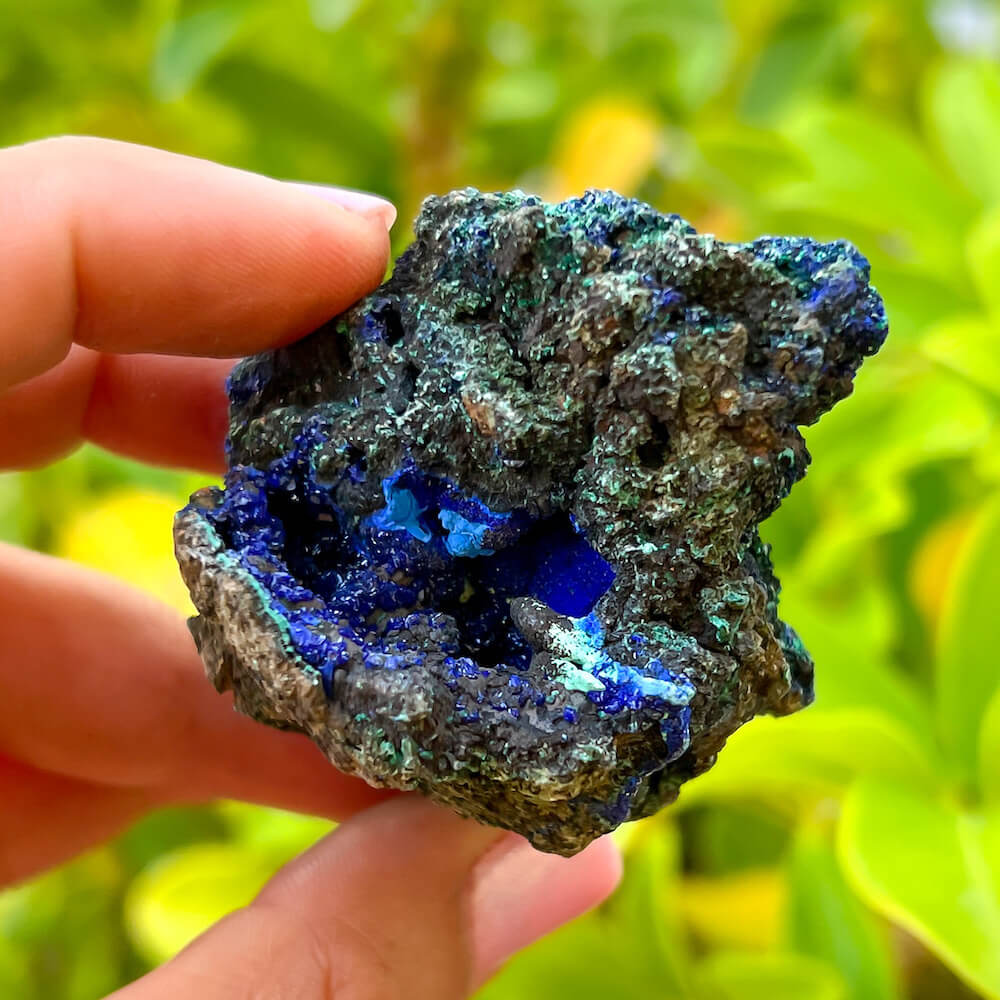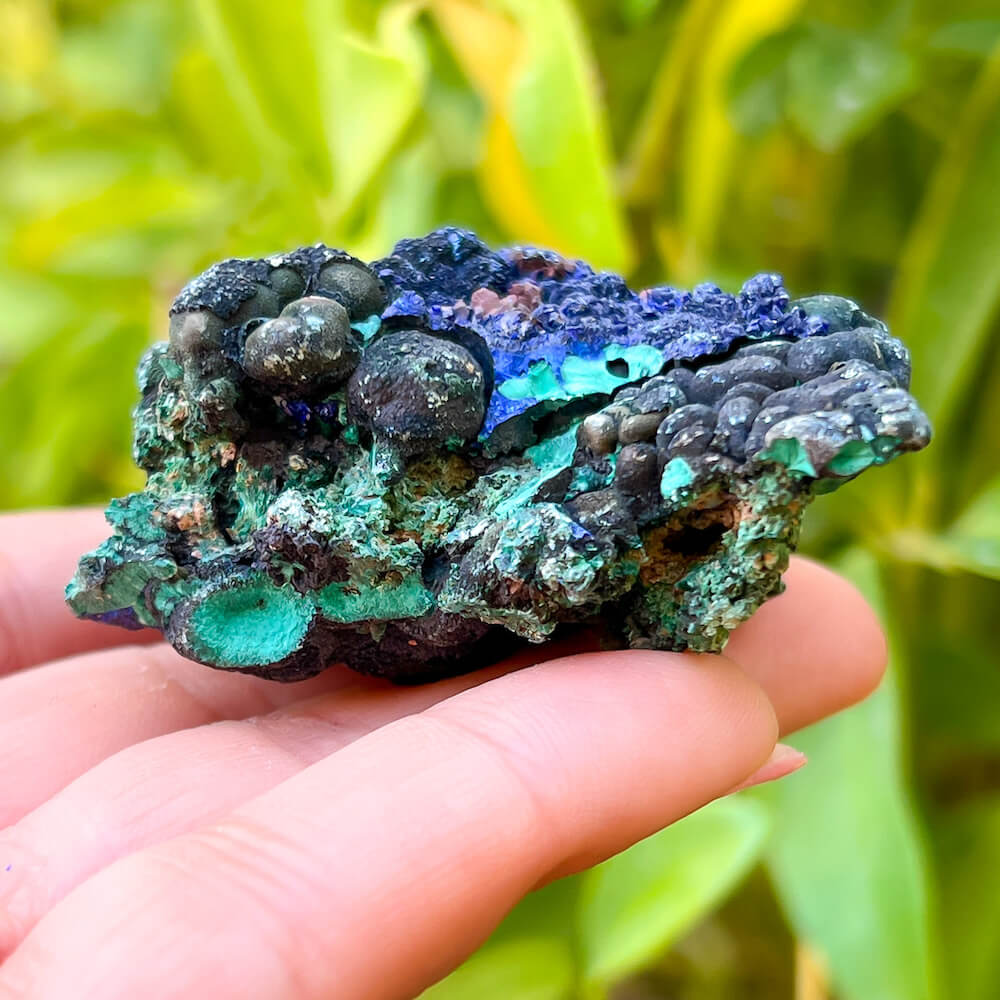 Unidos como azurita-malaquita, se cree que este mineral combina diferentes rasgos, refresca la visión de la vida del usuario y disuelve las características egocéntricas; disipando la presunción, la arrogancia y la vanidad y mejorando la flexibilidad en el movimiento y el pensamiento. Expande la conciencia, crea un equilibrio emocional y activa un escudo protector contra las fuerzas negativas u hostiles.