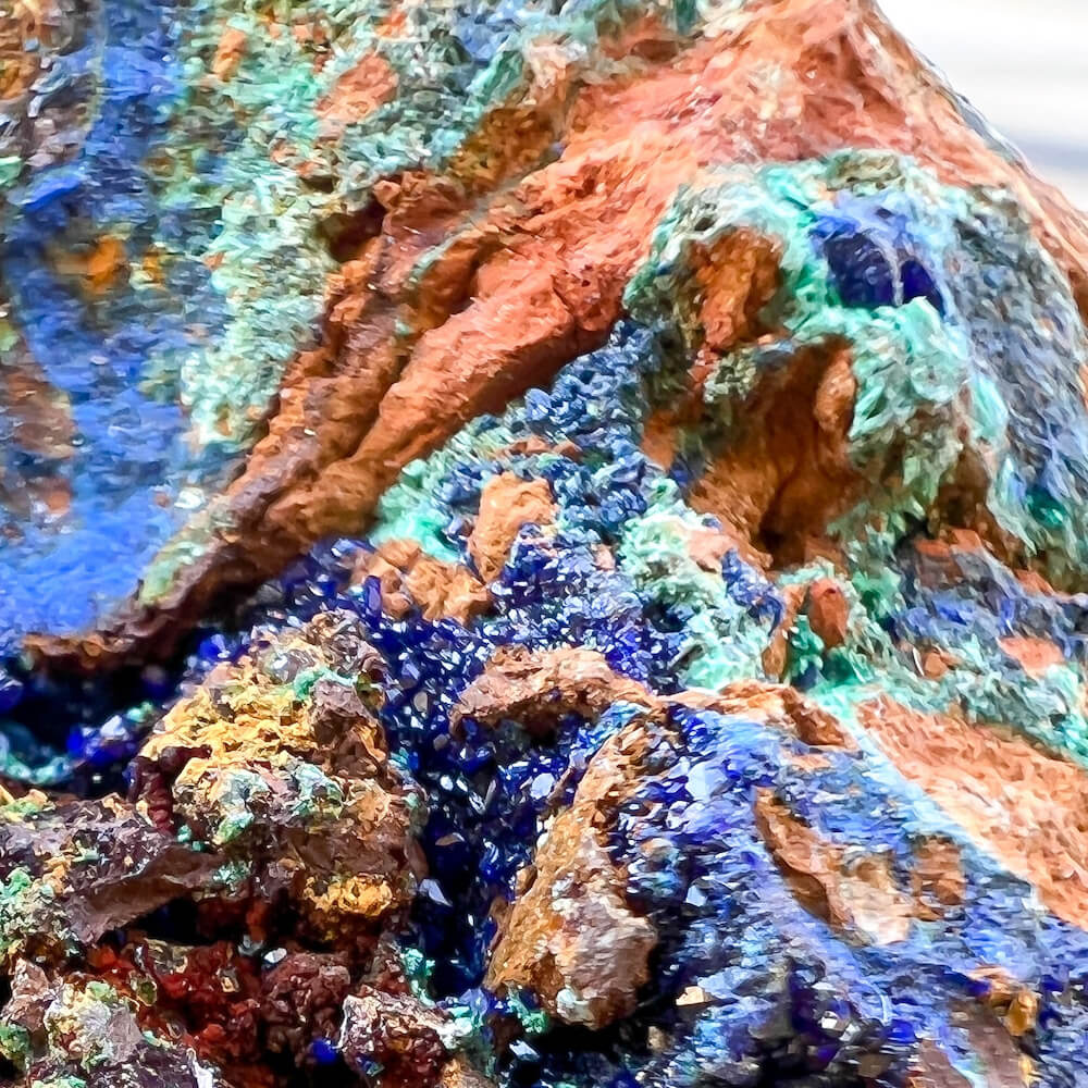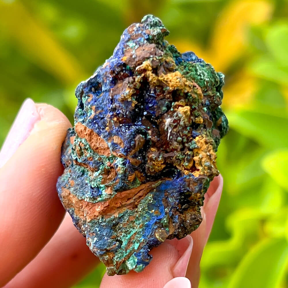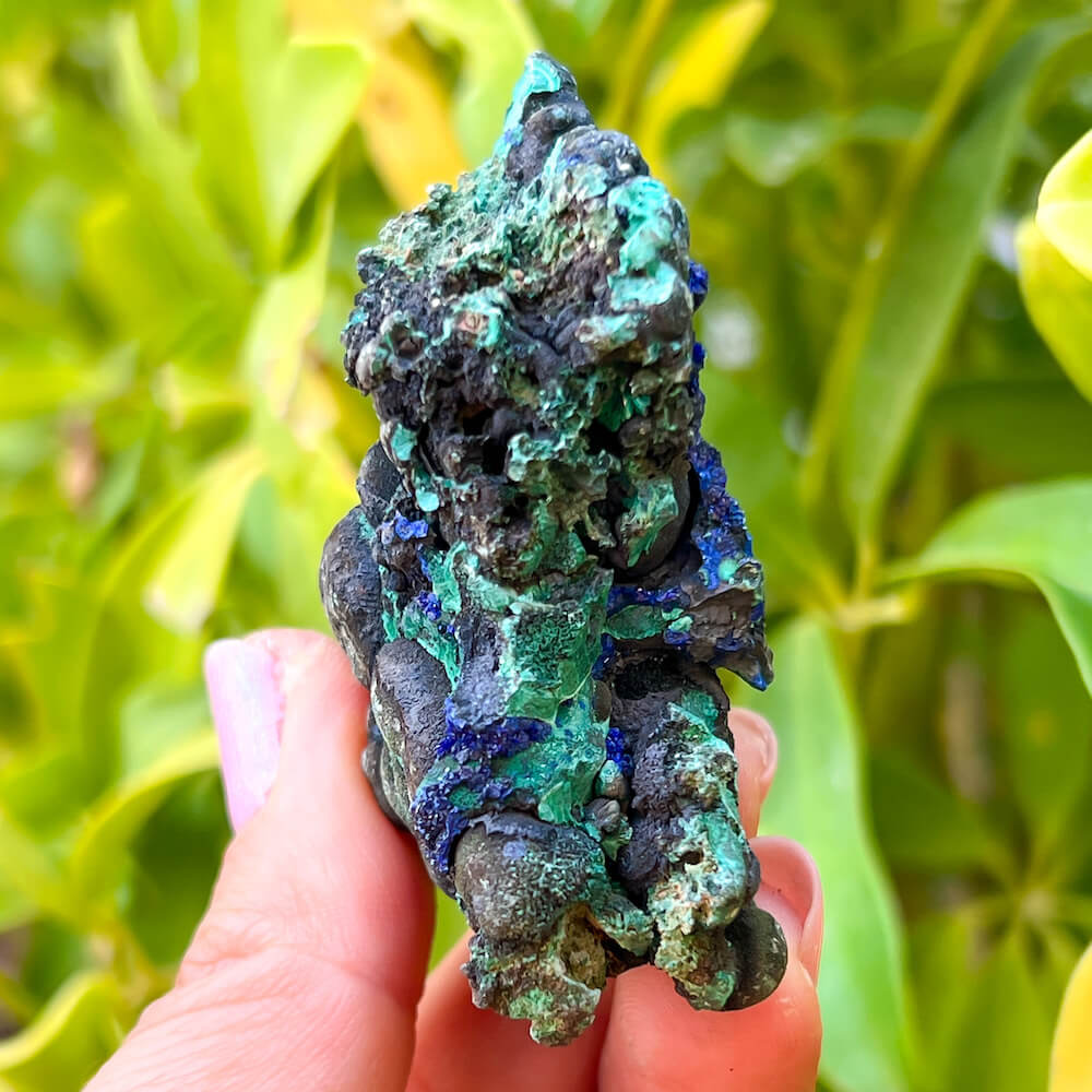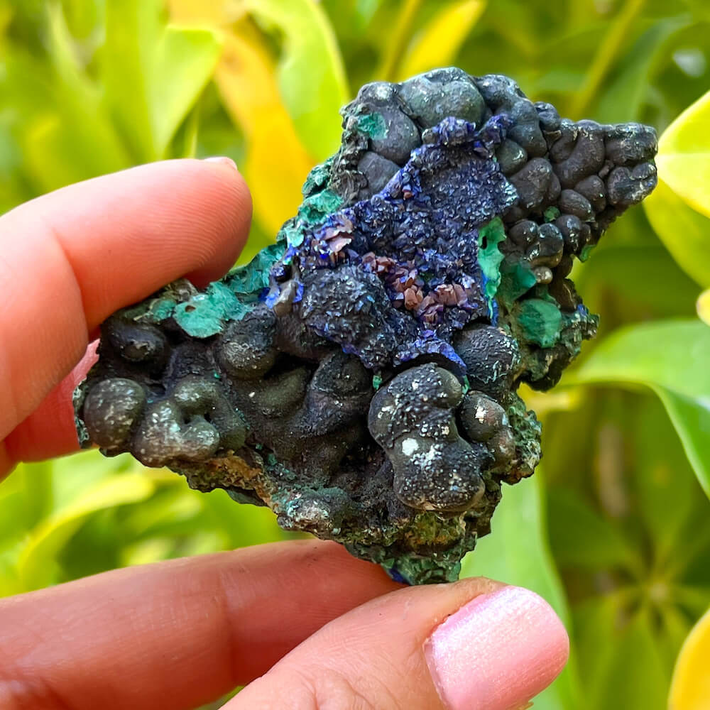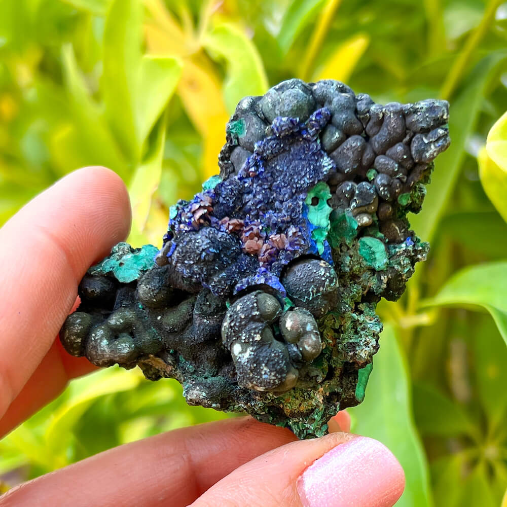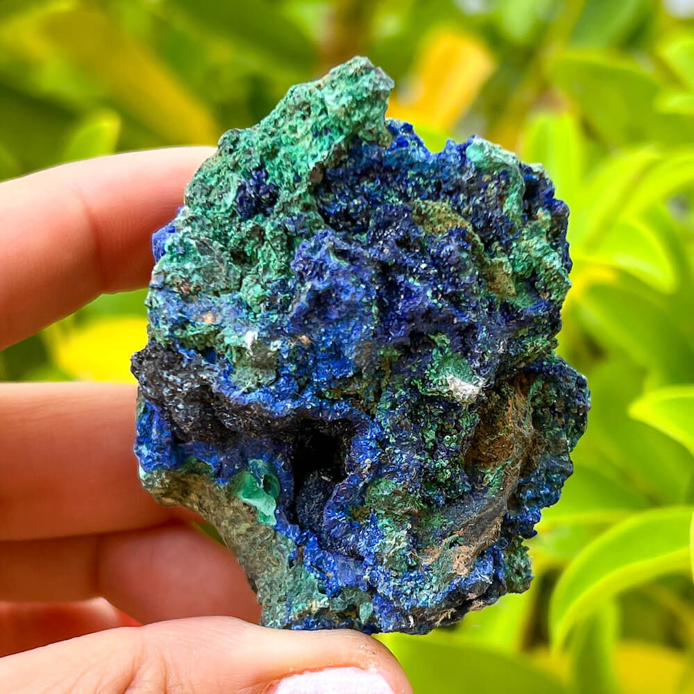 Unidos como azurita-malaquita, se cree que este mineral combina diferentes rasgos, refresca la visión de la vida del usuario y disuelve las características egocéntricas; disipando la presunción, la arrogancia y la vanidad y mejorando la flexibilidad en el movimiento y el pensamiento. Expande la conciencia, crea un equilibrio emocional y activa un escudo protector contra las fuerzas negativas u hostiles.