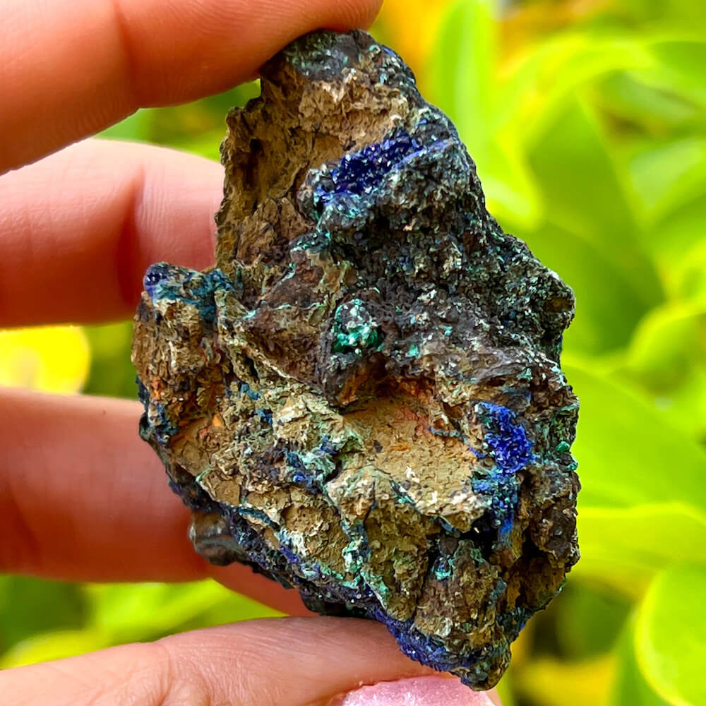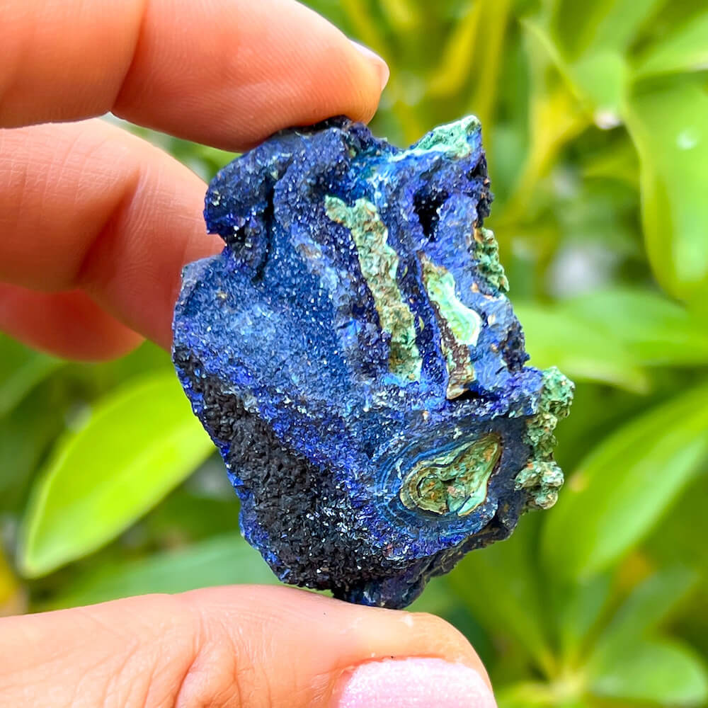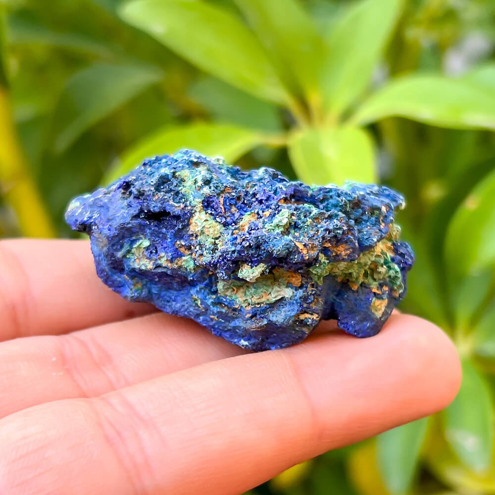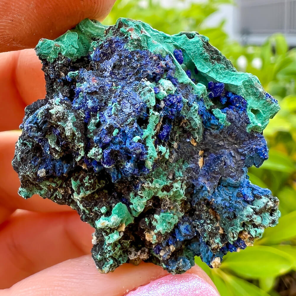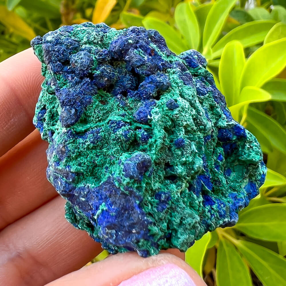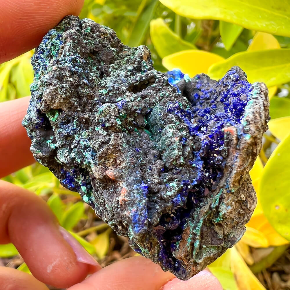 Seems to be mostly pure Azurite. Lots of little crystal inclusions. Not seeing a lot of malachite on it. Very happy with this little rock! Thank you!