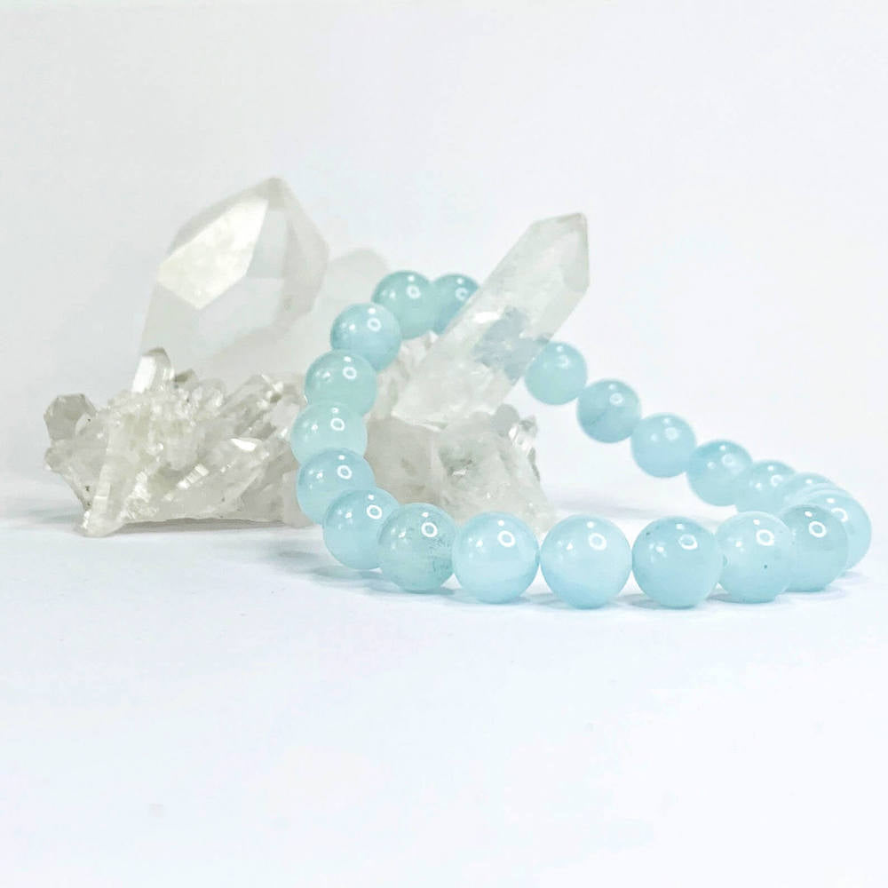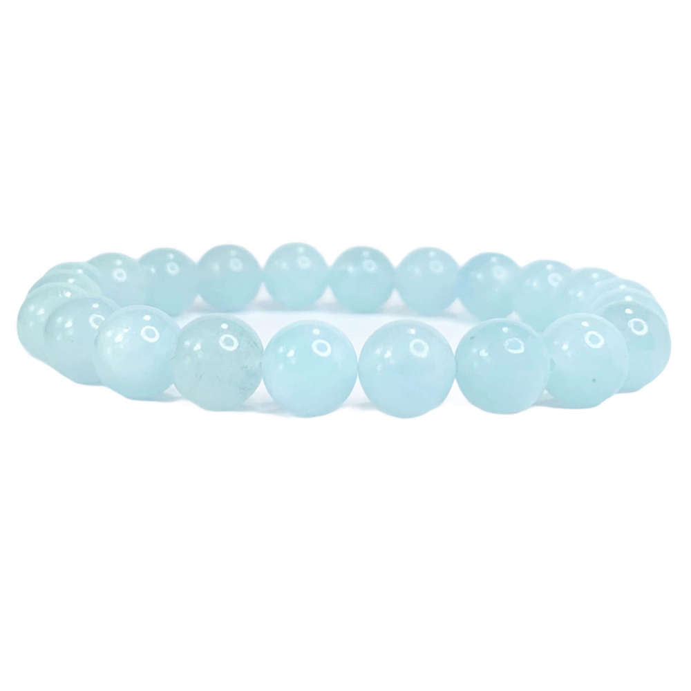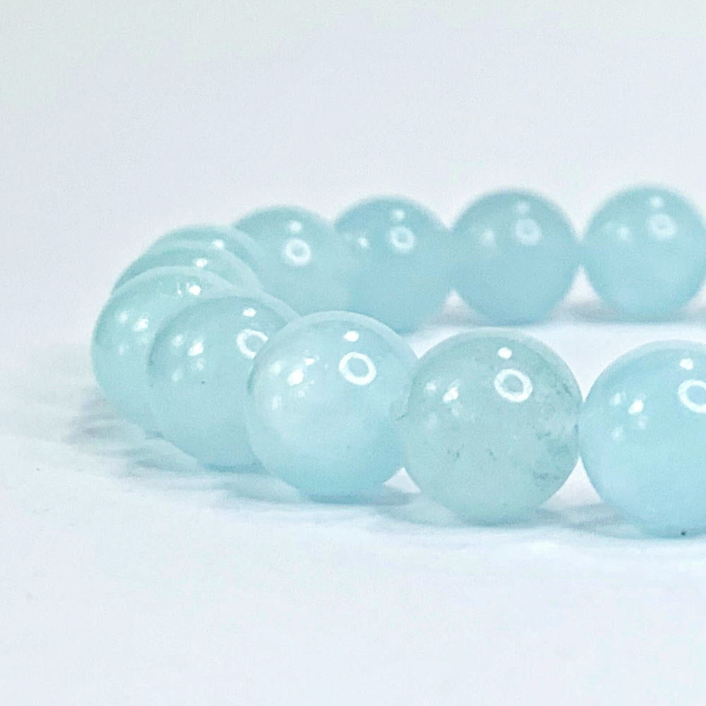 Esta pulsera de aguamarina está hecha de preciosas cuentas brillantes de 8 mm. La aguamarina es una piedra de nacimiento de marzo y es un excelente regalo de cumpleaños.