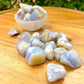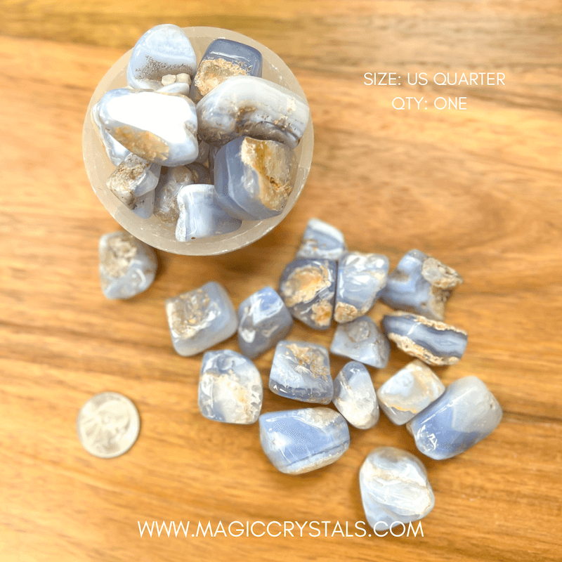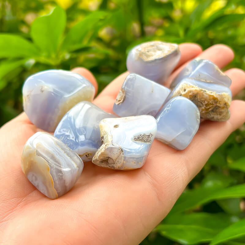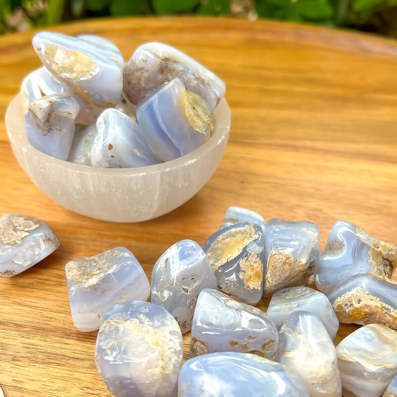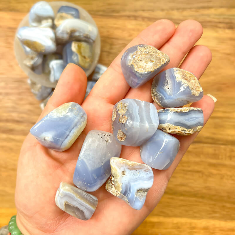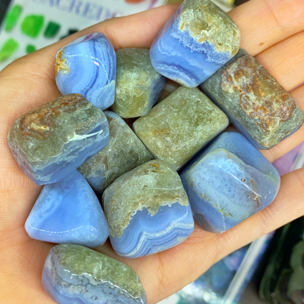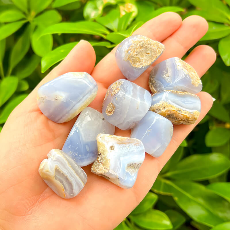 La frecuencia de Blue Lace Agate abre y limpia el chakra de la garganta y ayuda a conectar las comunicaciones de uno con la guía superior de uno. Blue Lace Agate puede ayudar a la comunicación en situaciones en las que se deben evitar las palabras de enojo y promover una comprensión clara. Blue Lace Agate también es útil para equilibrar los chakras de la garganta de aquellos que no pueden dejar de hablar, o que tienden a hablar antes de pensar en las consecuencias y efectos de sus palabras en el mundo.