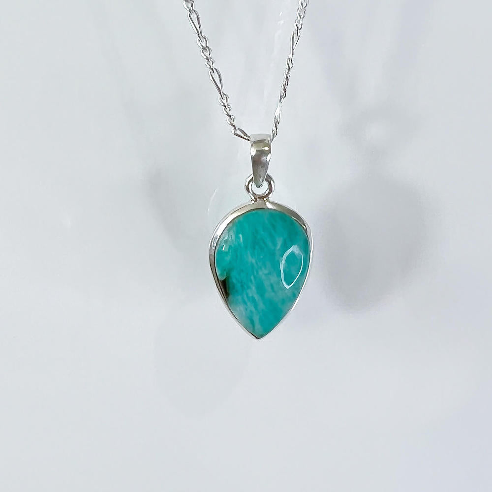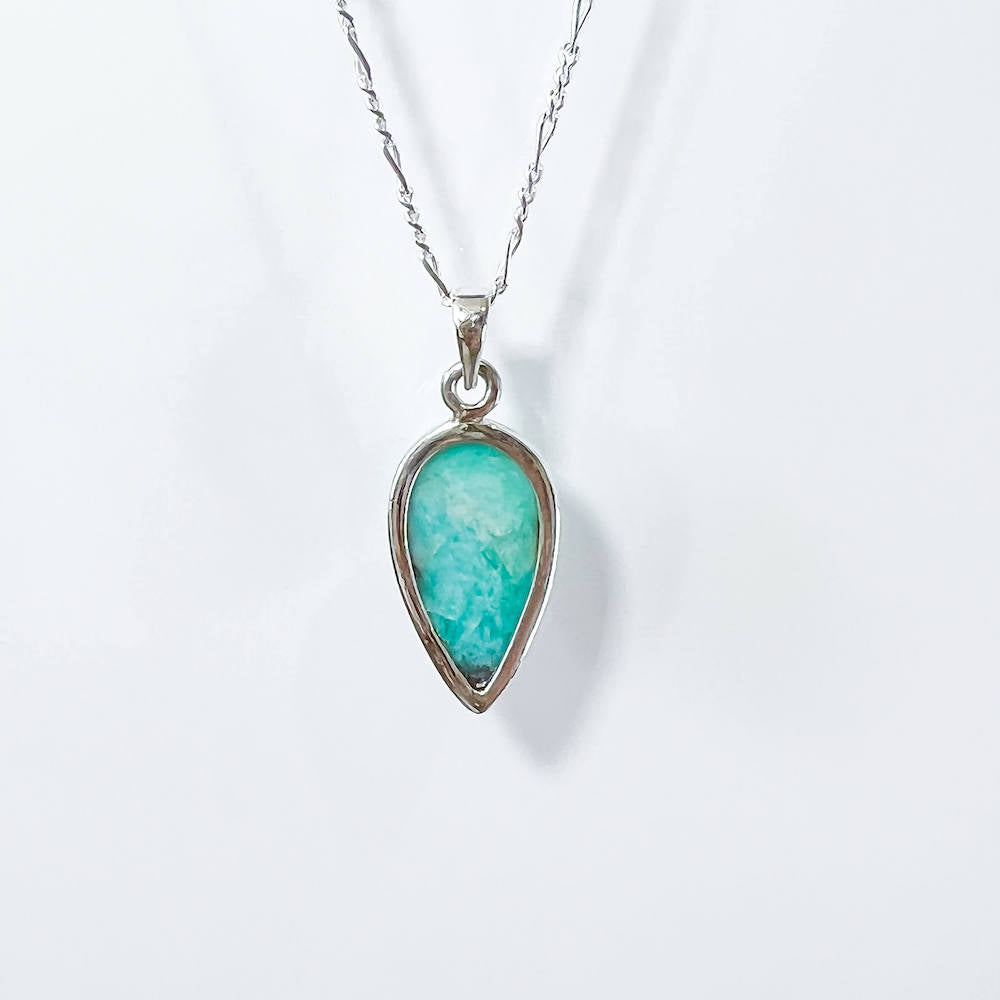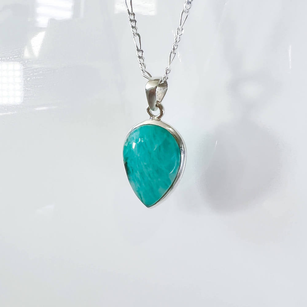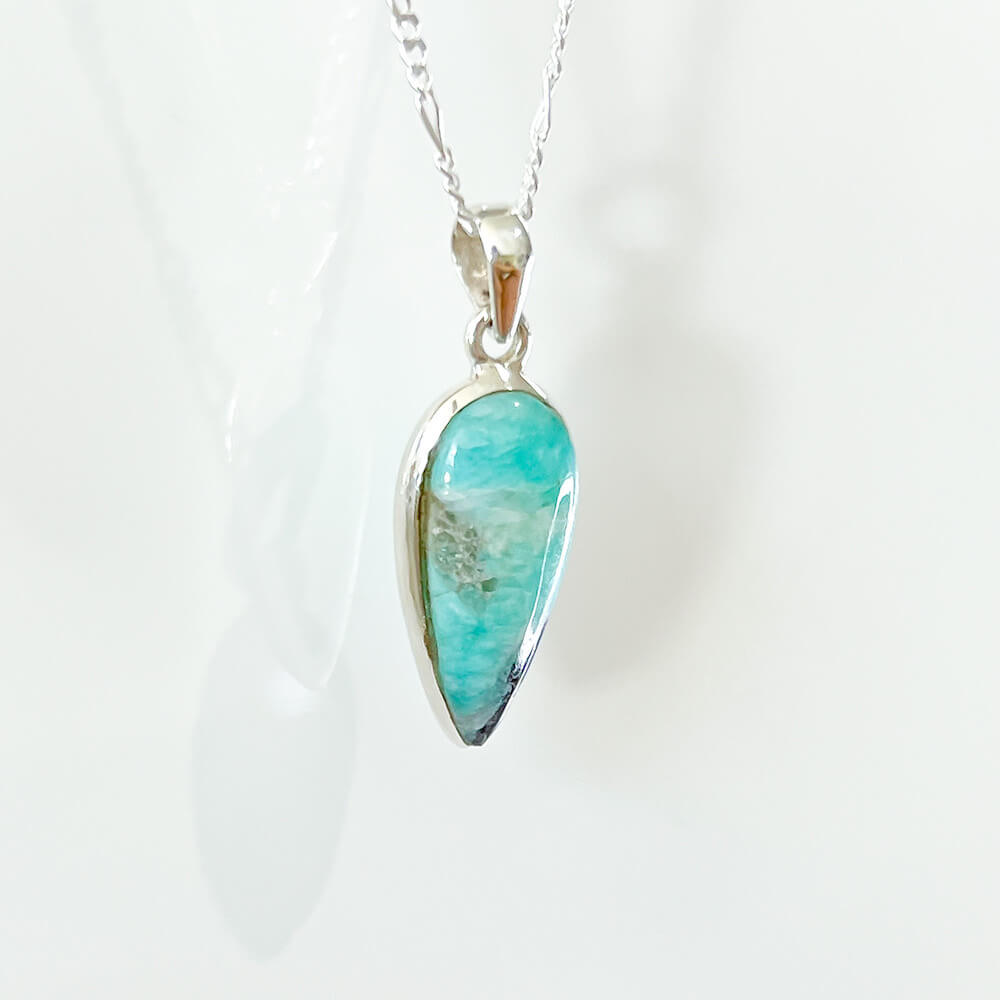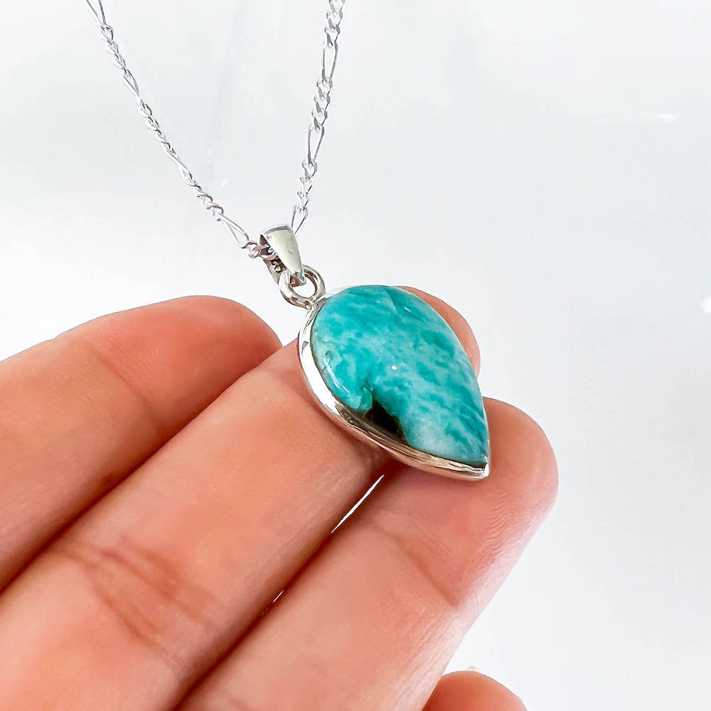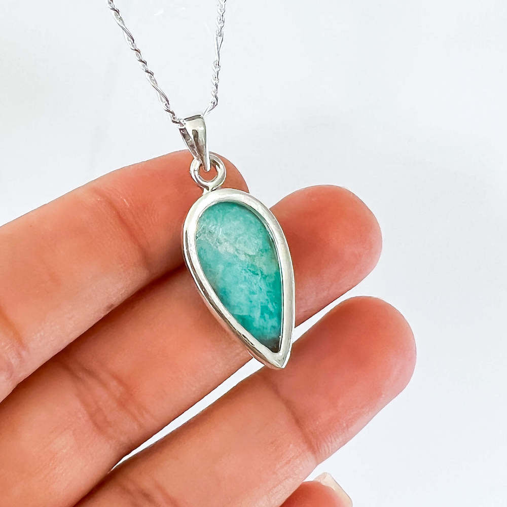 Collar con colgante de plata de ley con gota de piedra de amazonita azul genuina - E