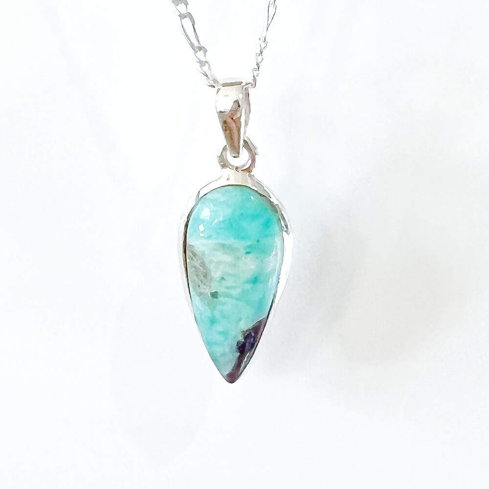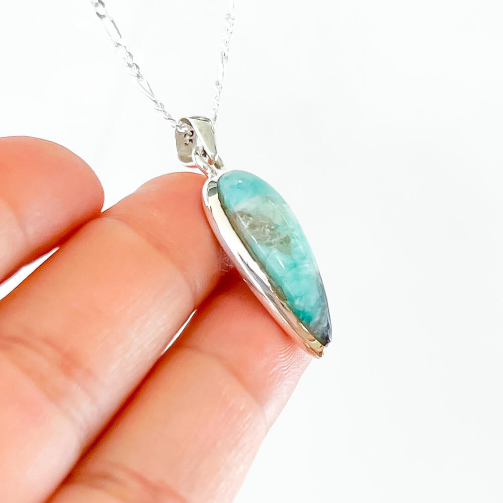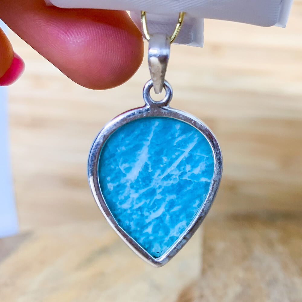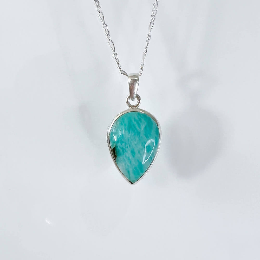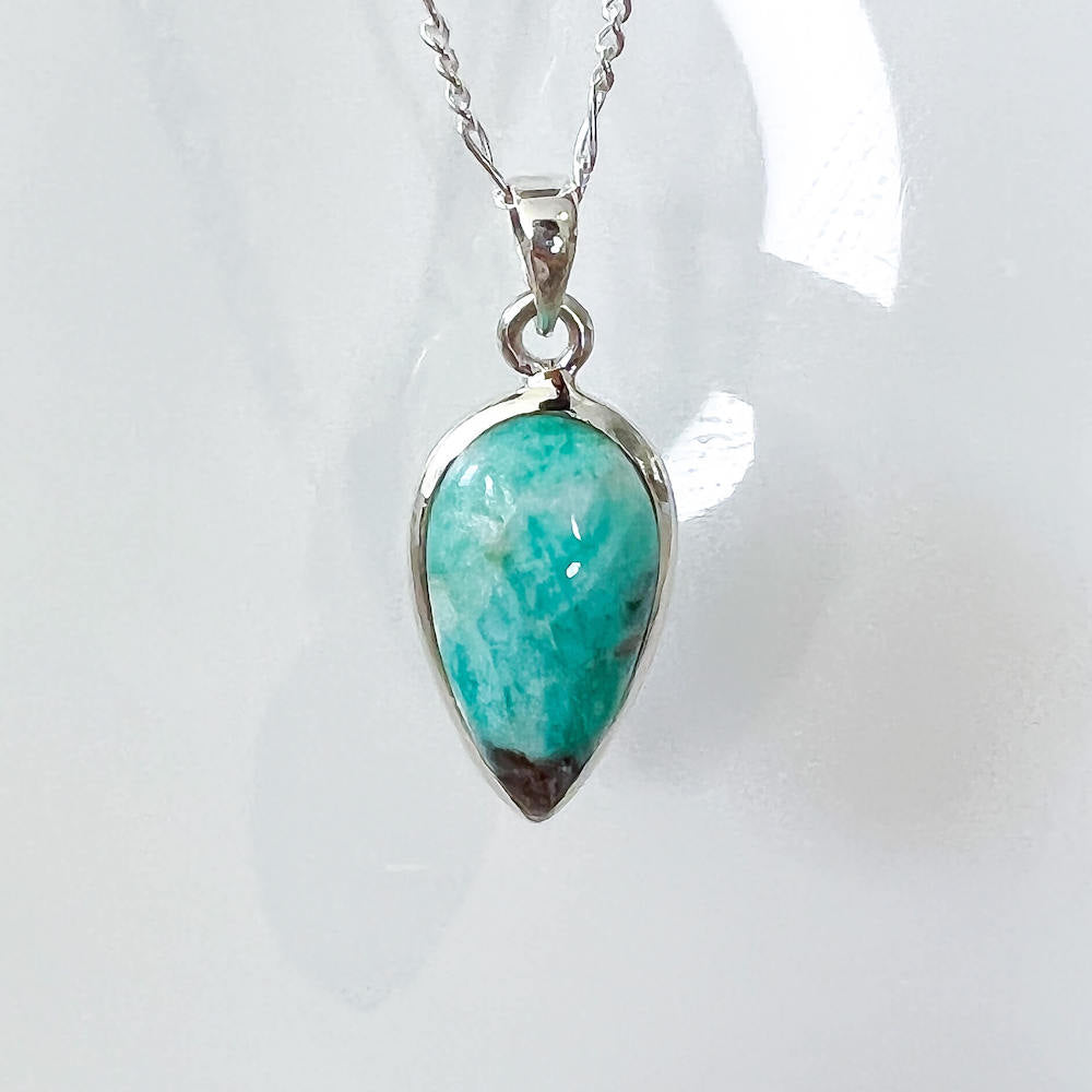 Collar con colgante de plata de ley con gota de piedra de amazonita azul genuina - E