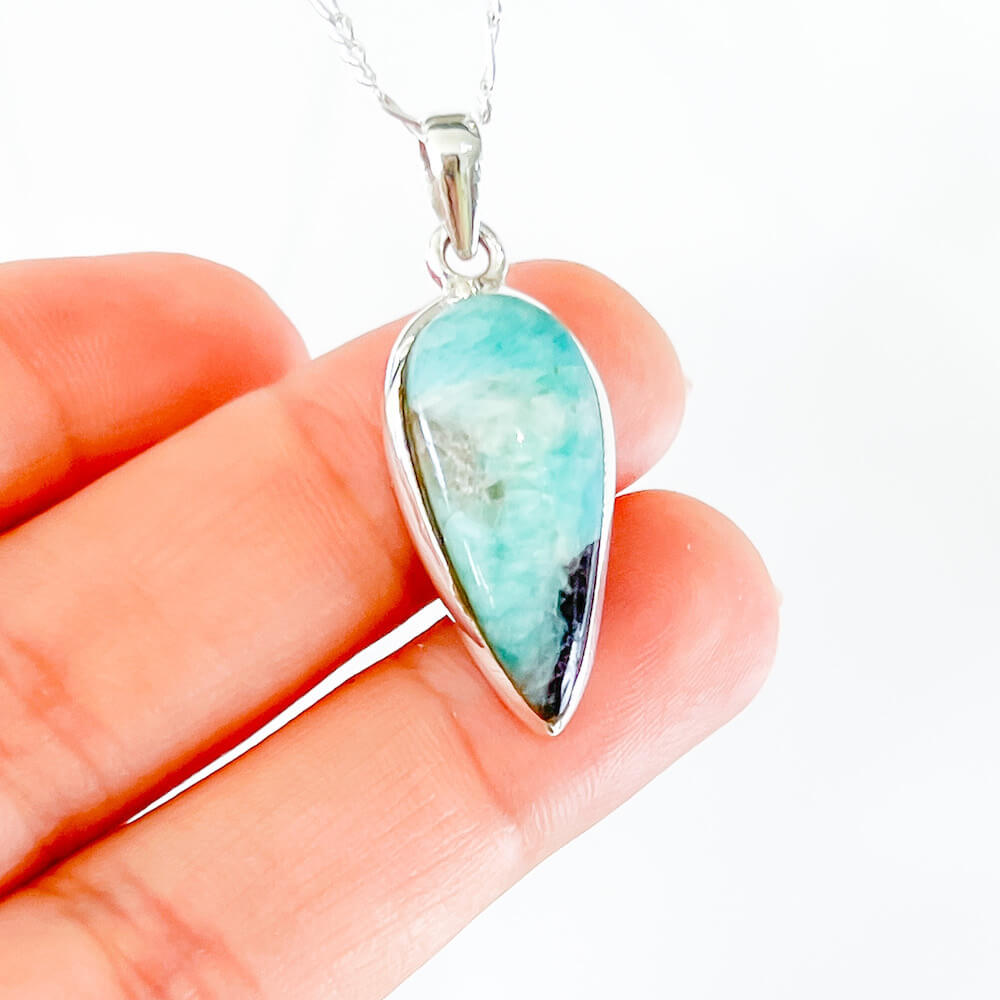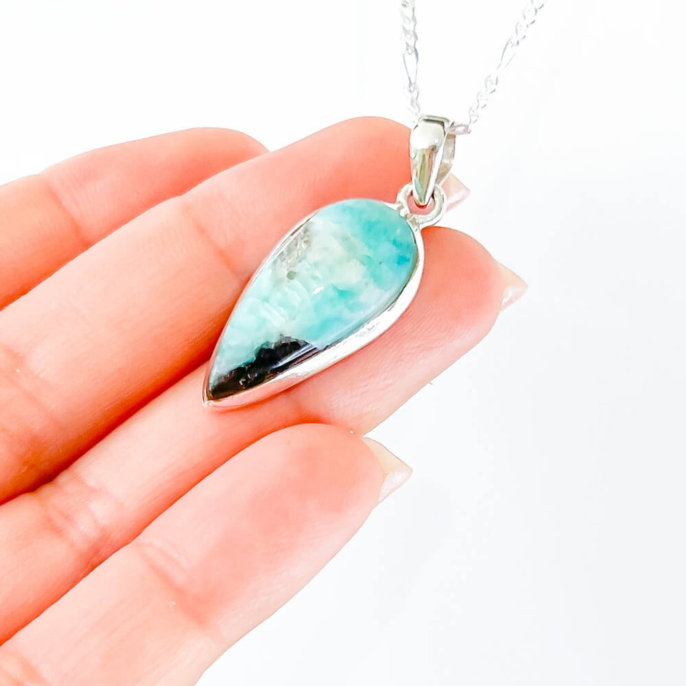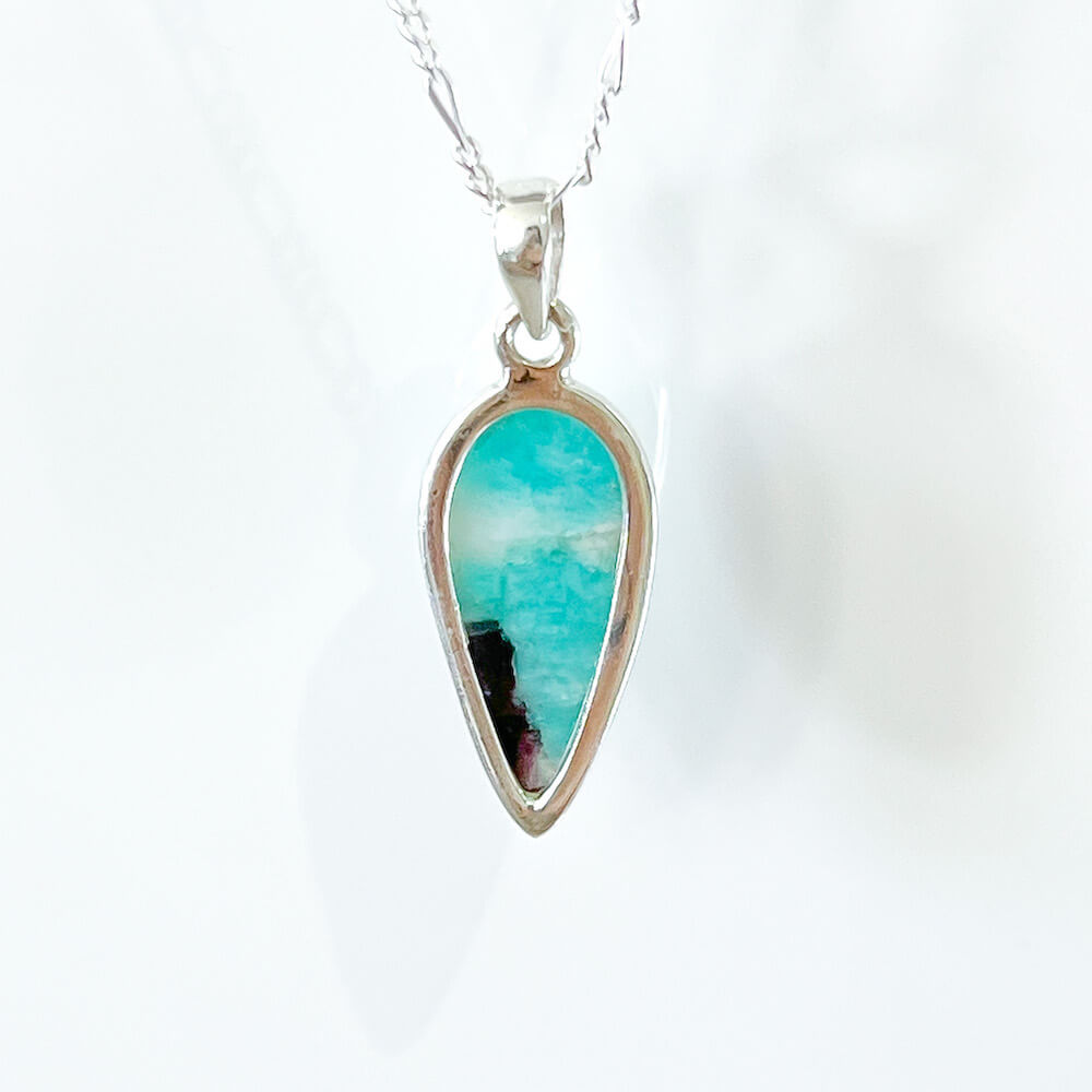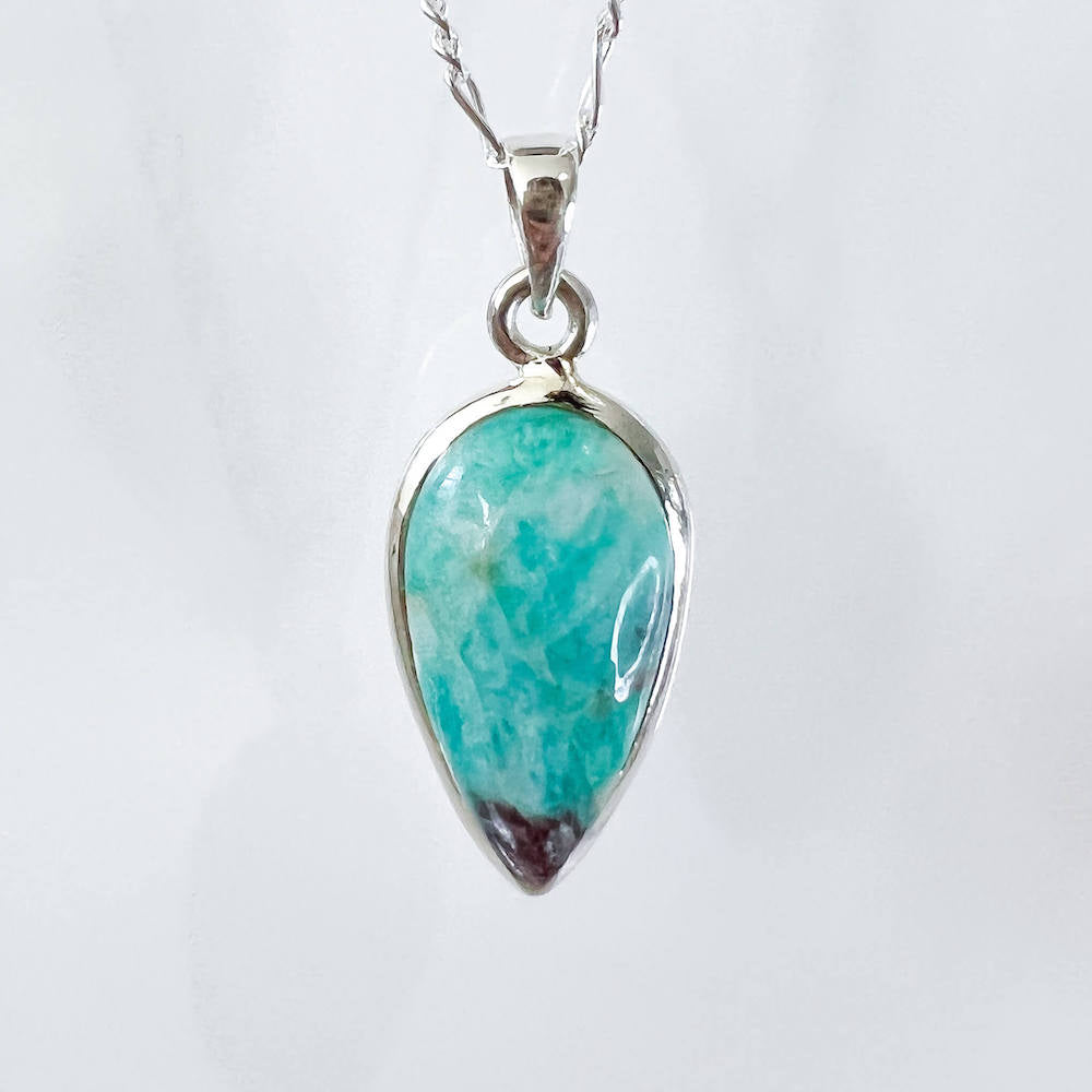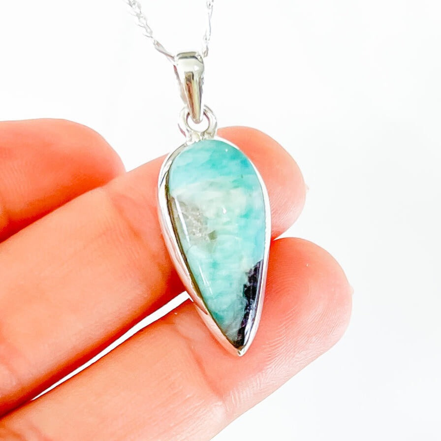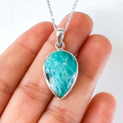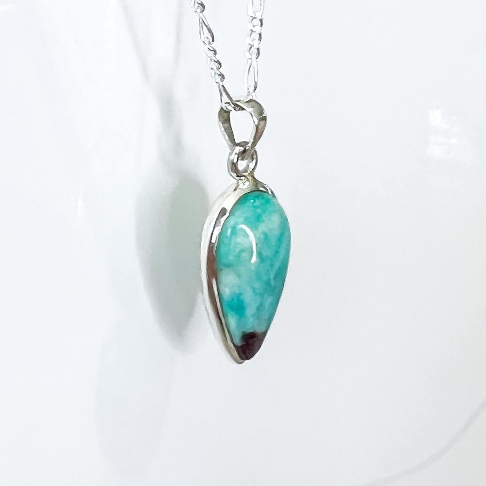 Collar con colgante de plata de ley con gota de piedra de amazonita azul genuina - E