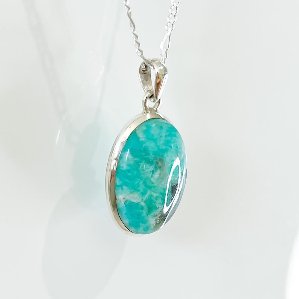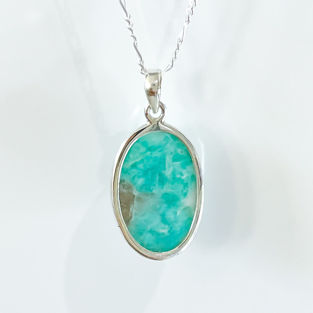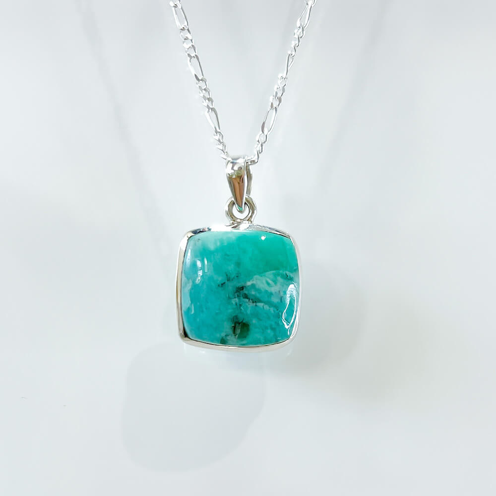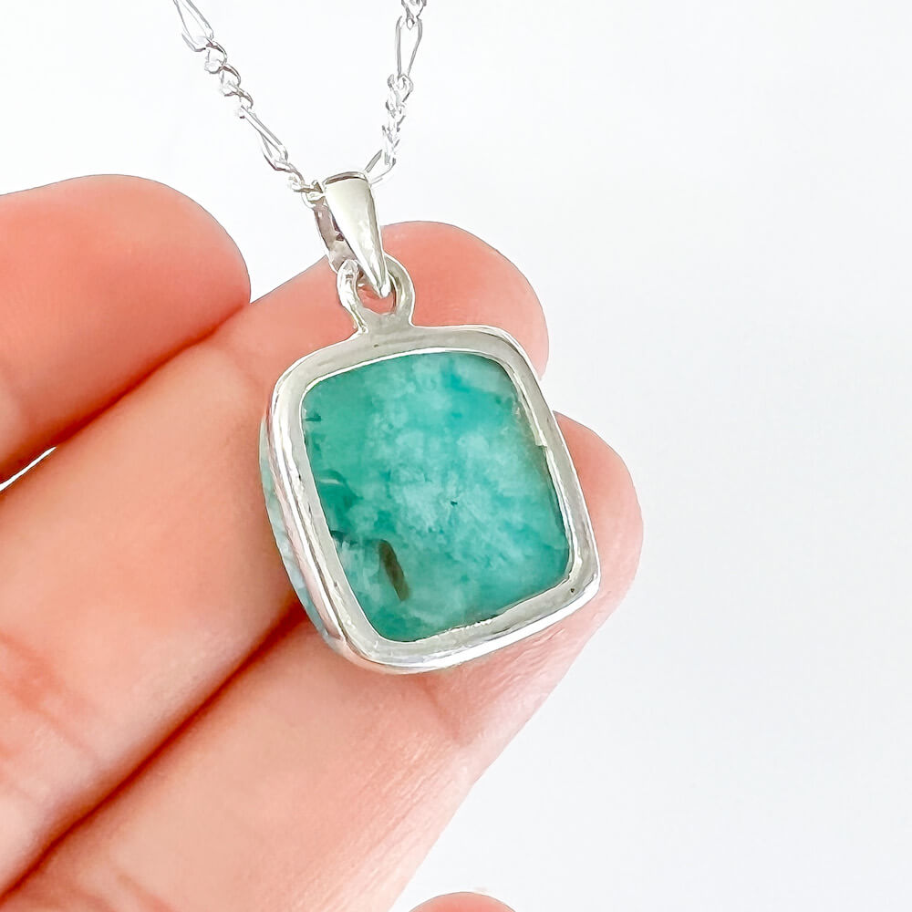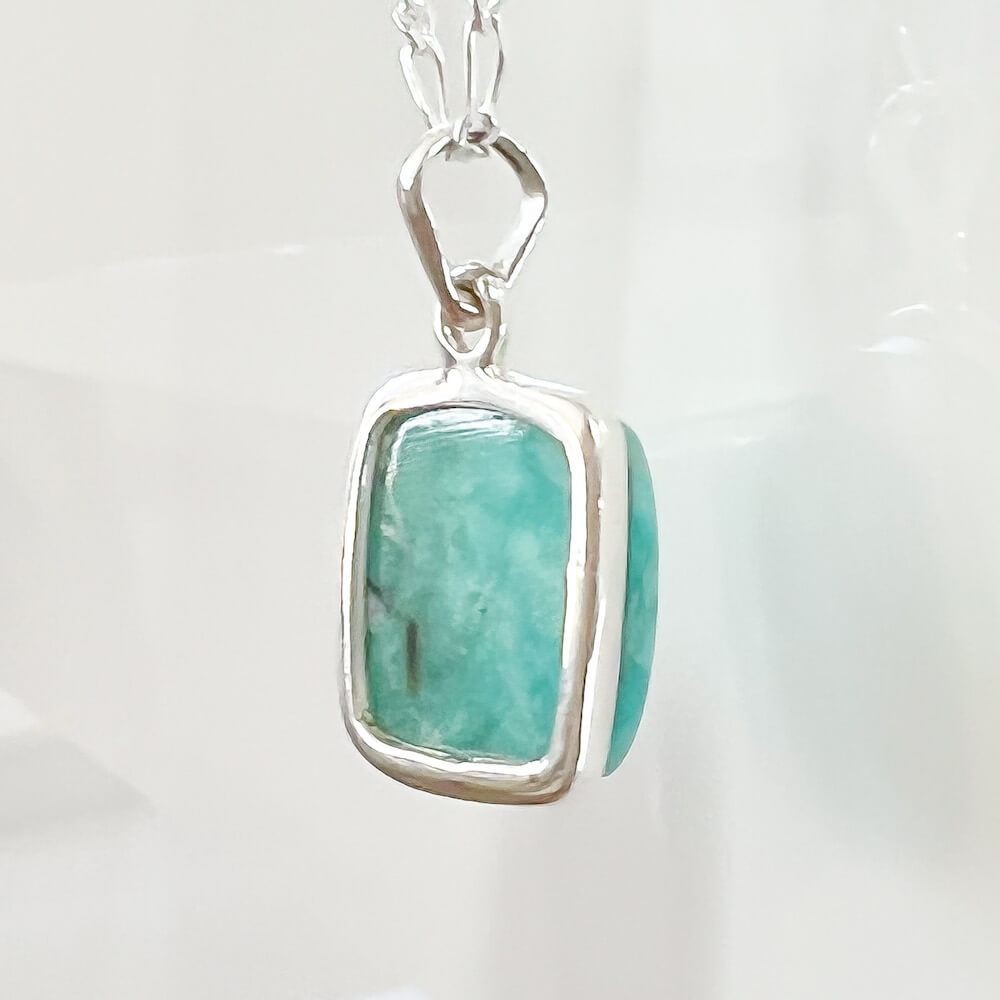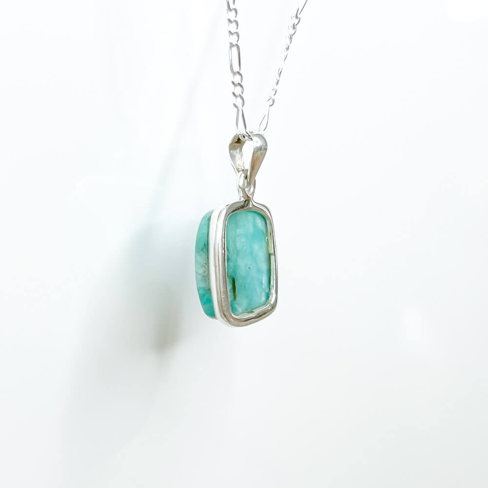 Magnífico bisel de piedra amazonita de primera calidad engarzado en plata de ley y colgado de una cadena de plata de ley.