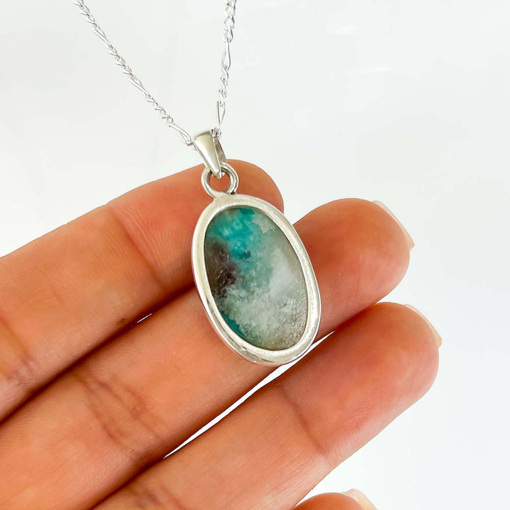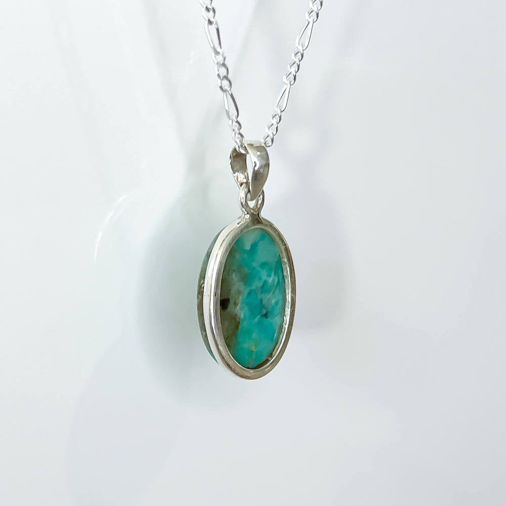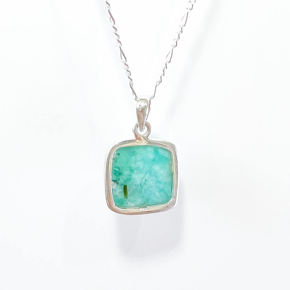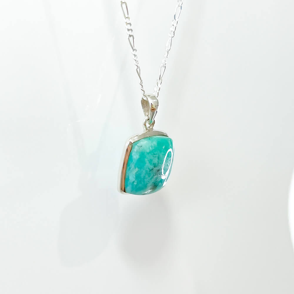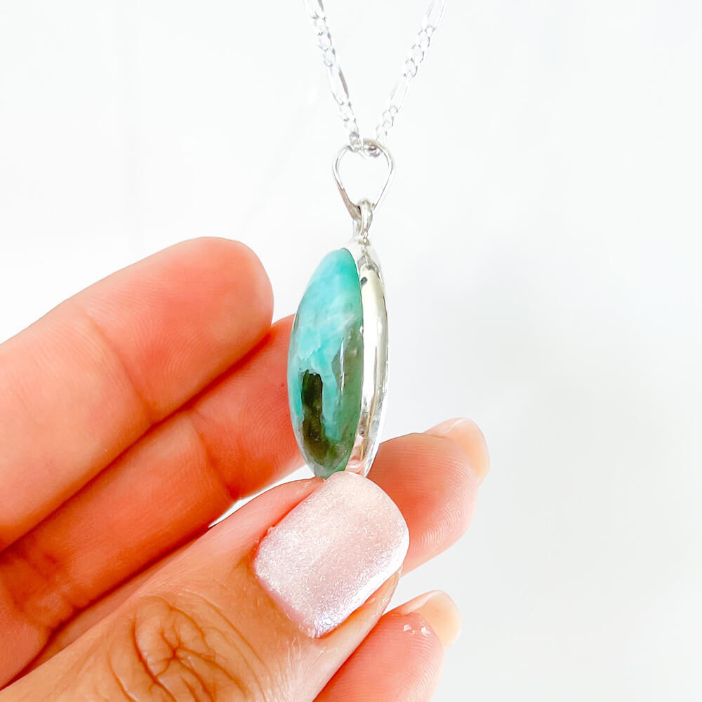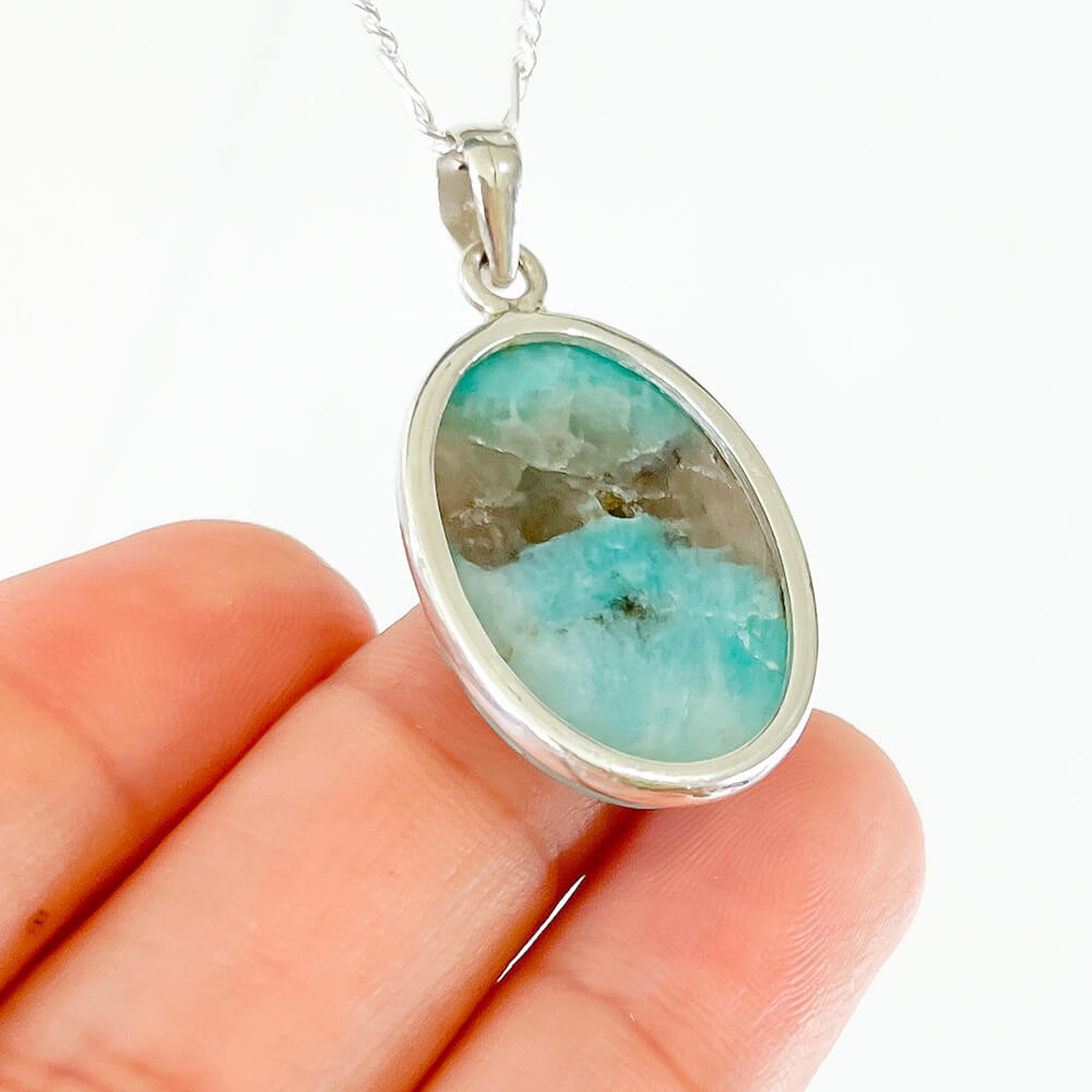 Magnífico bisel de piedra amazonita de primera calidad engarzado en plata de ley y colgado de una cadena de plata de ley.