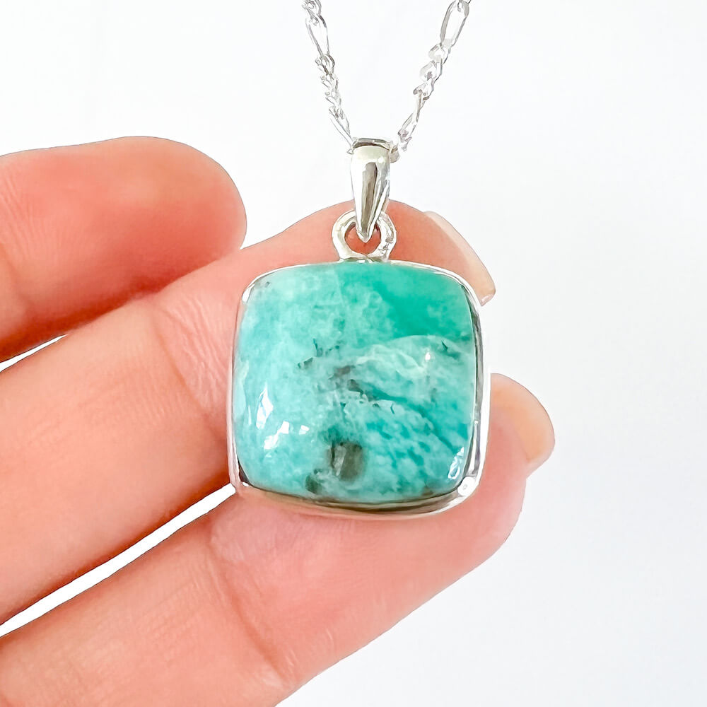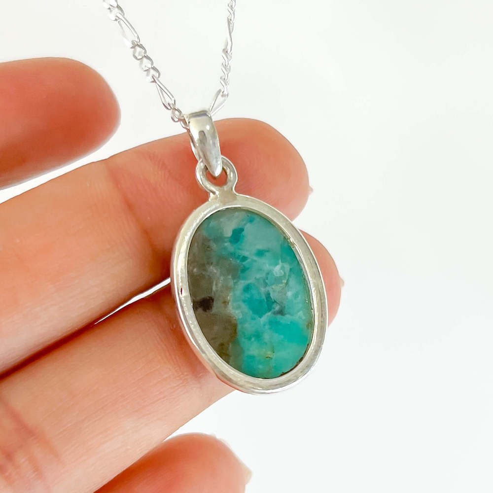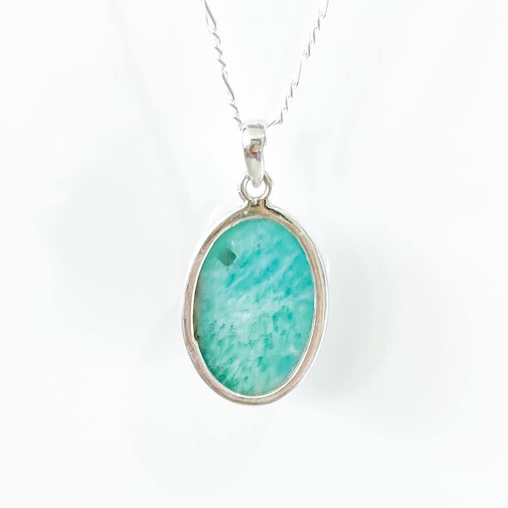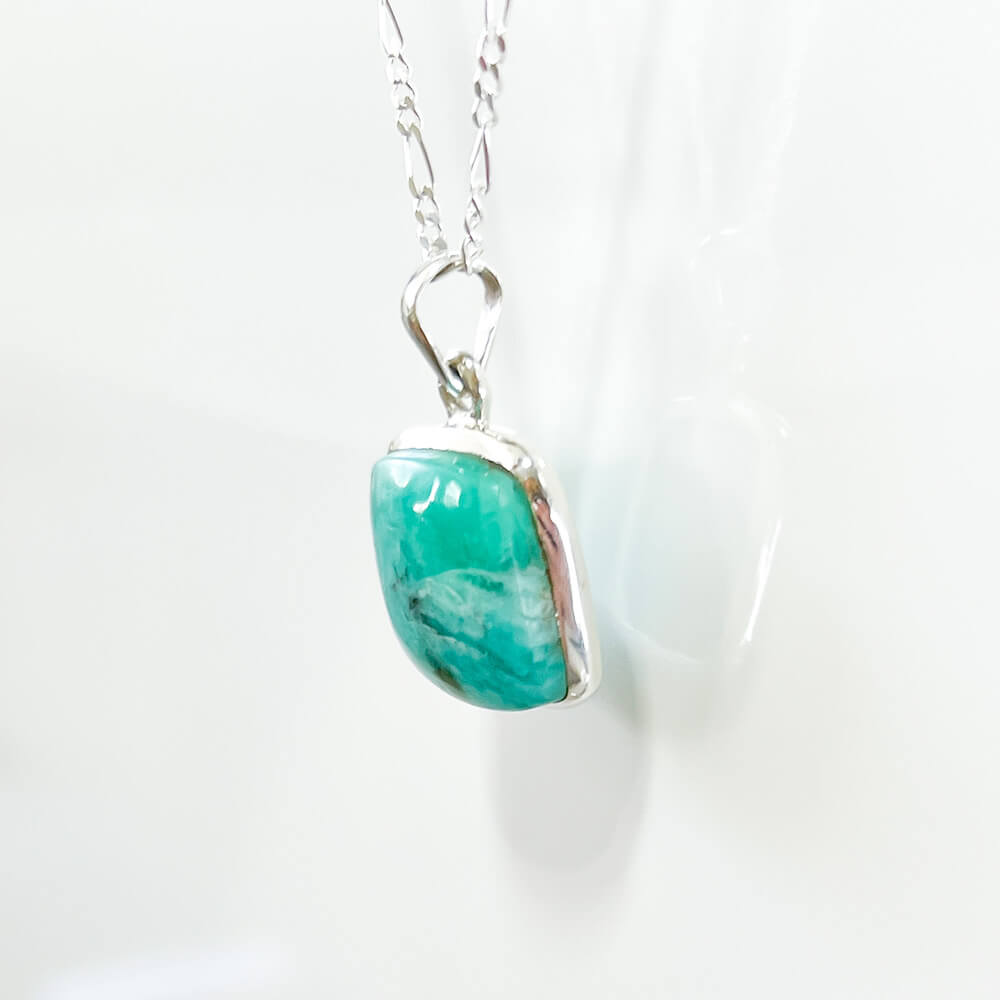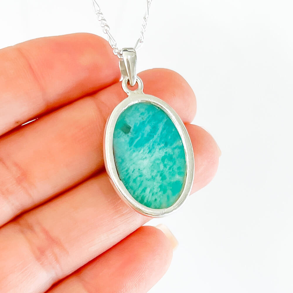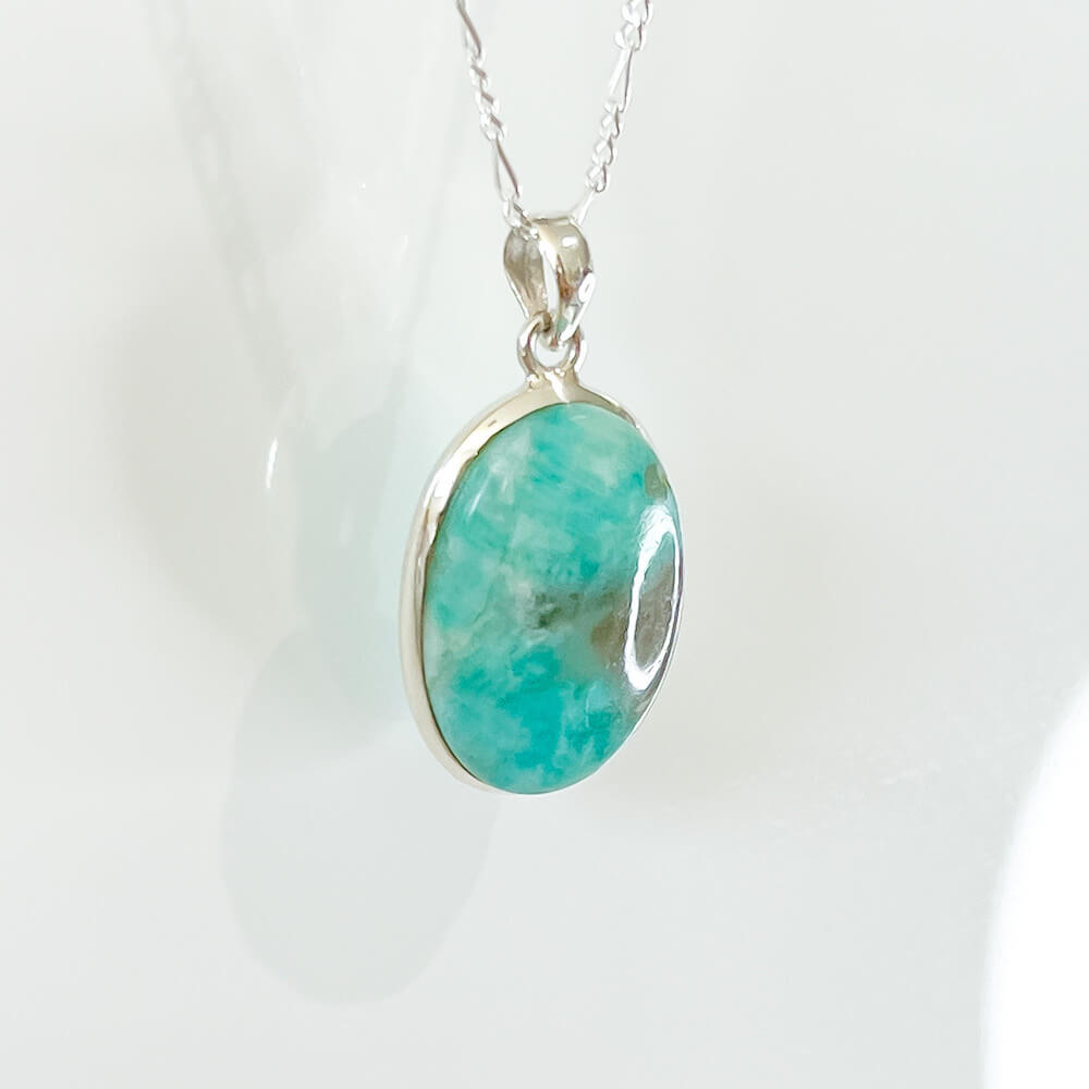Magnífico bisel de piedra amazonita de primera calidad engarzado en plata de ley y colgado de una cadena de plata de ley.