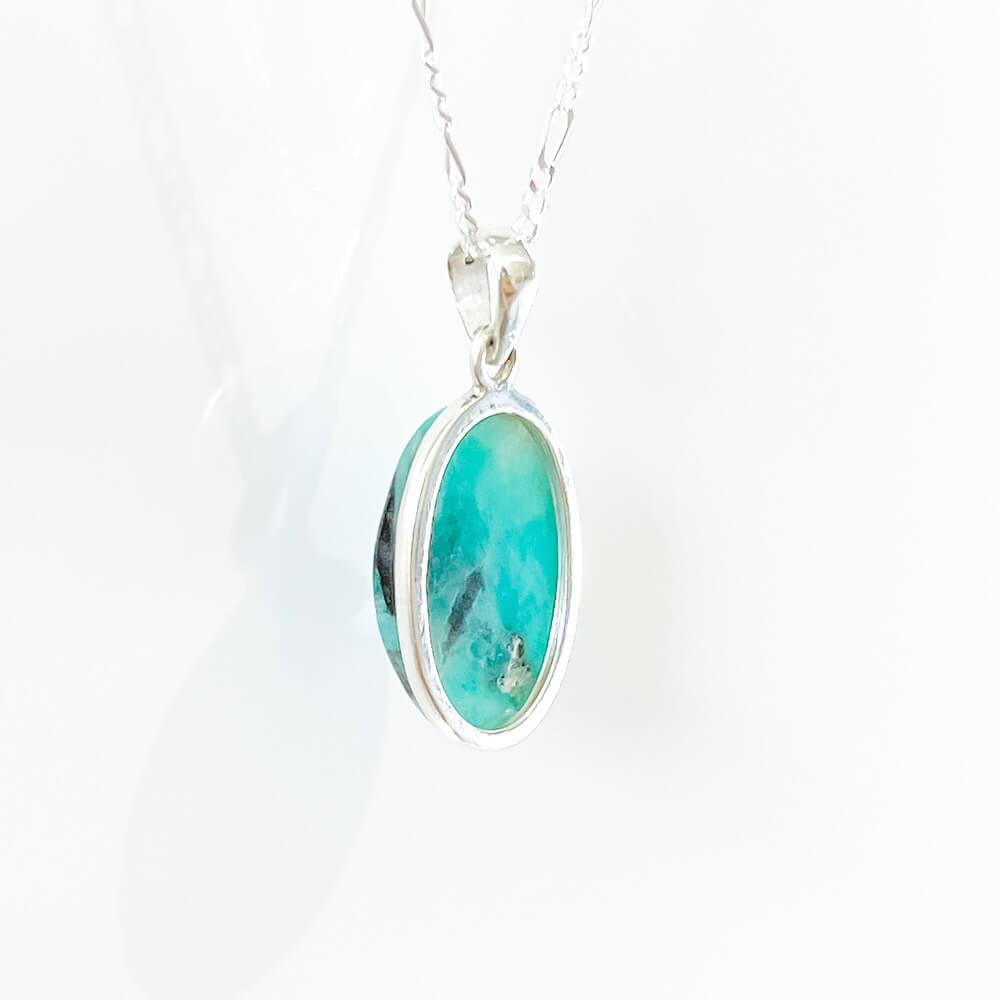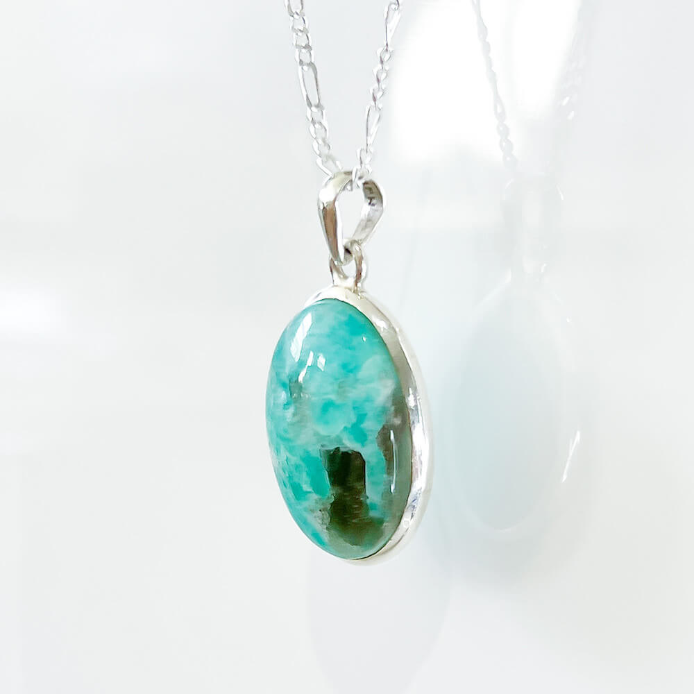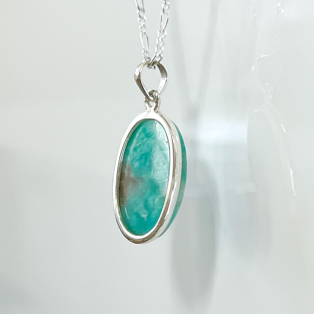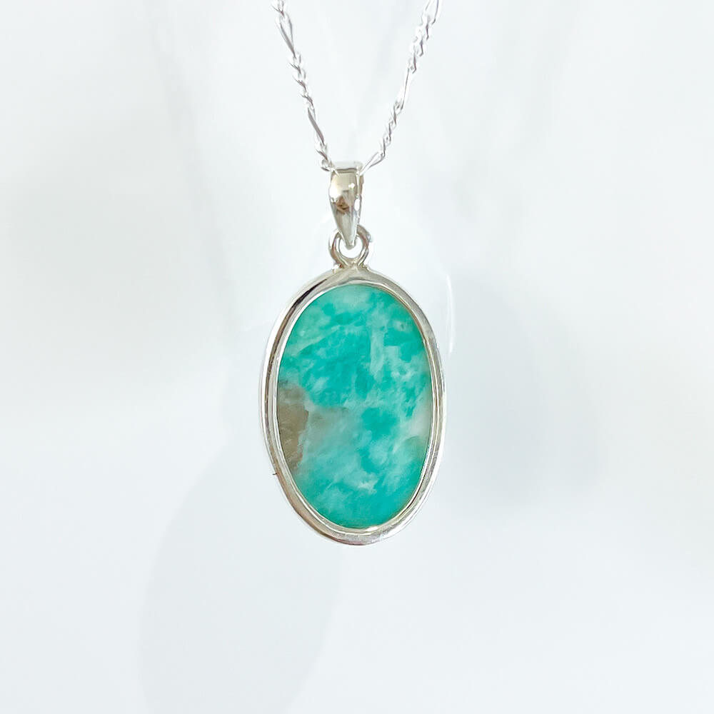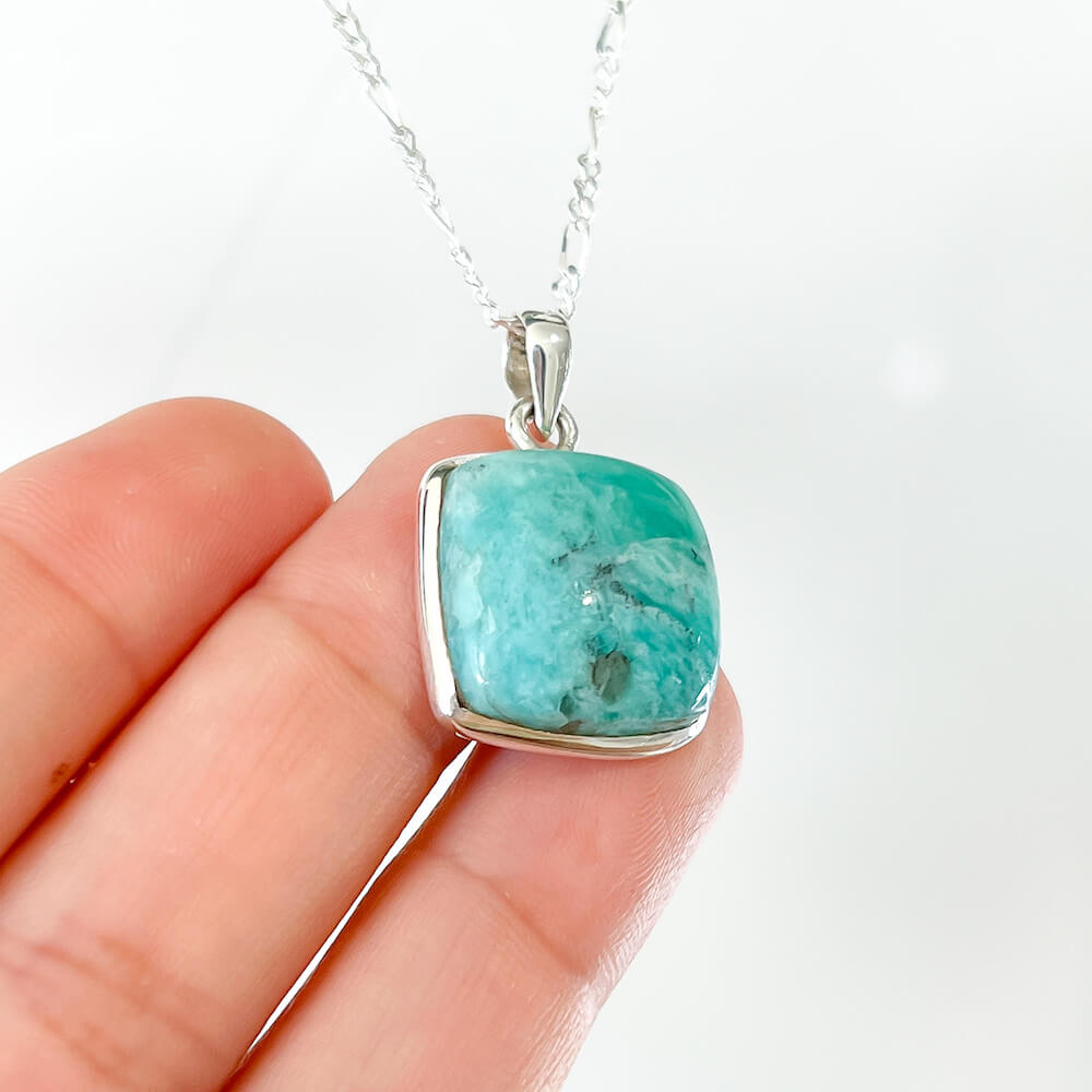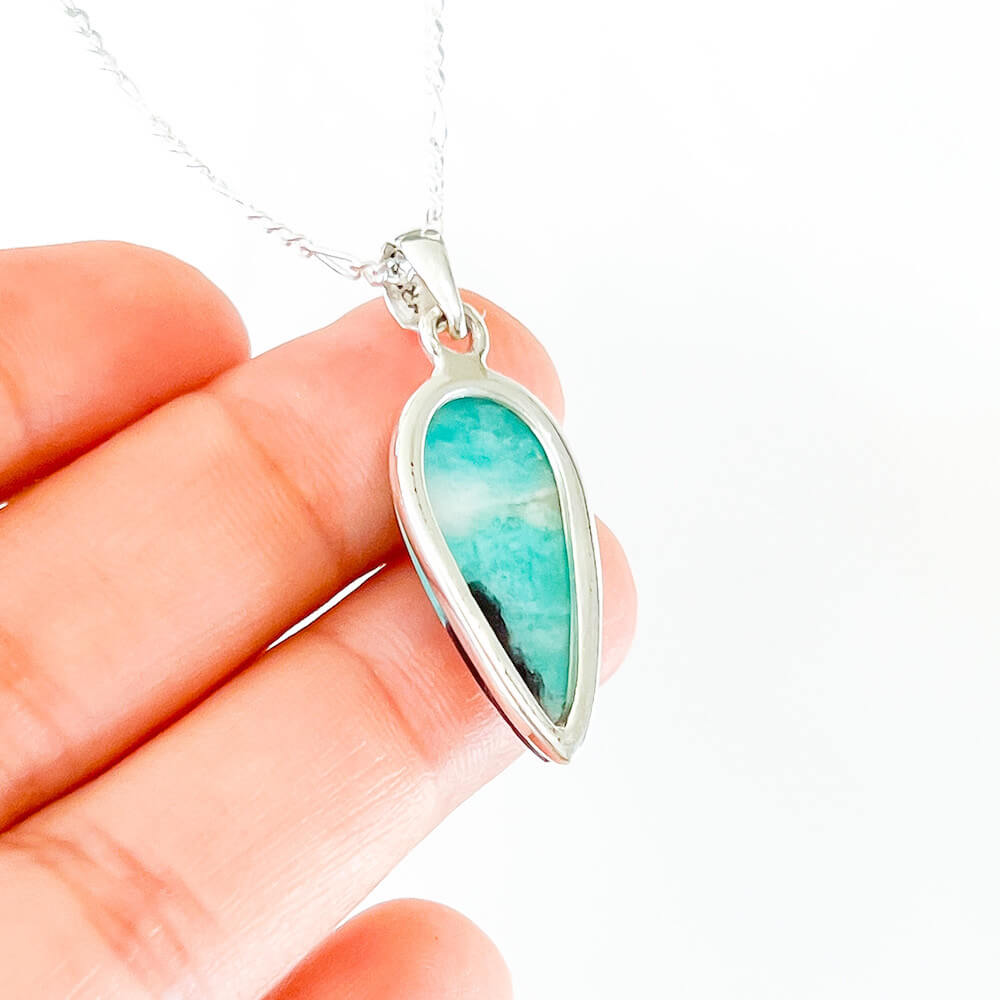 Magnífico bisel de piedra amazonita de primera calidad engarzado en plata de ley y colgado de una cadena de plata de ley.