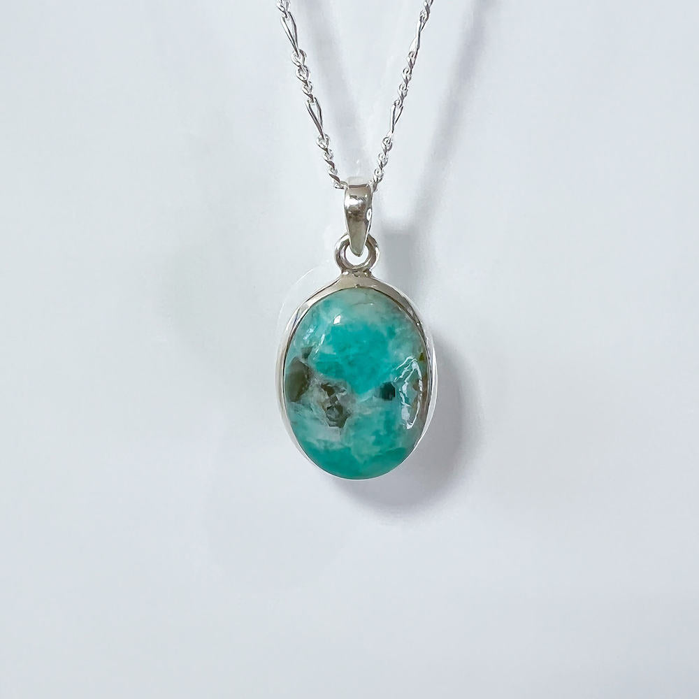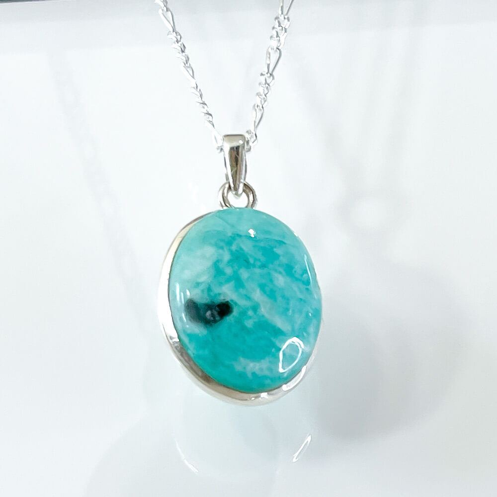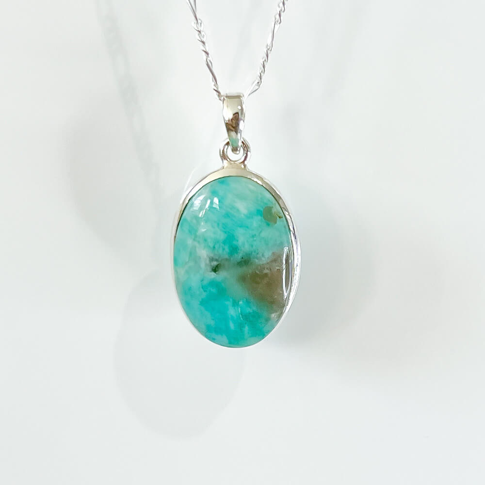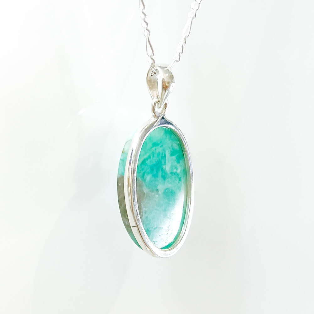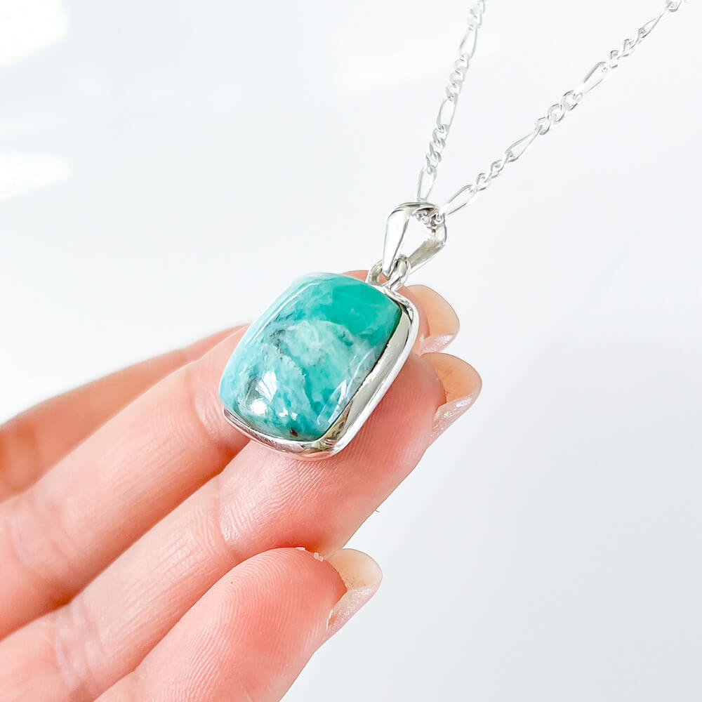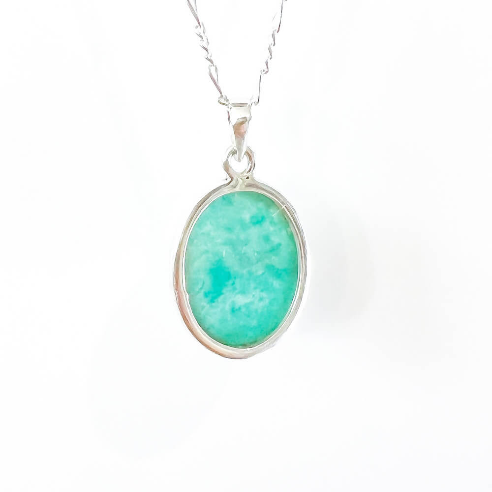 Magnífico bisel de piedra amazonita de primera calidad engarzado en plata de ley y colgado de una cadena de plata de ley.