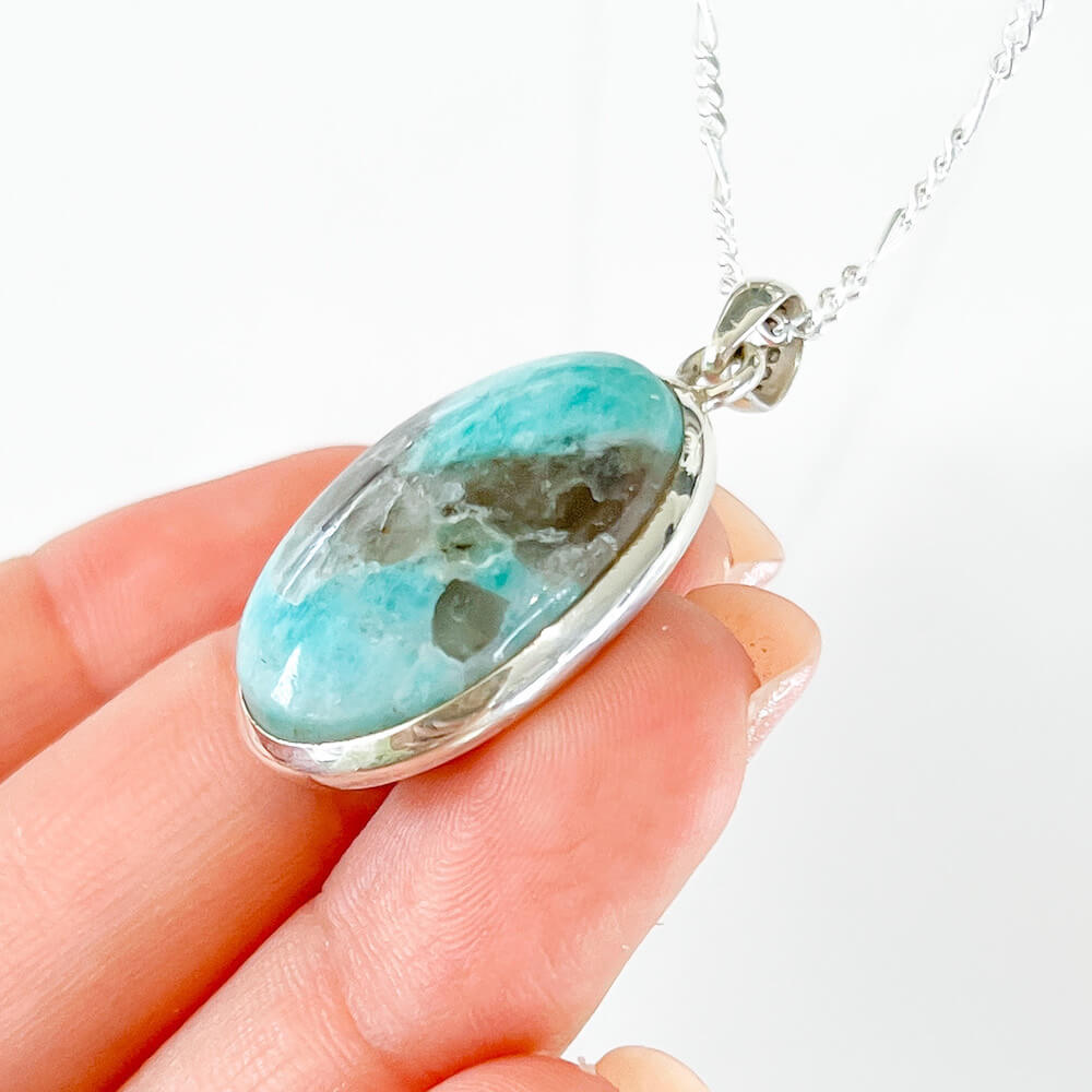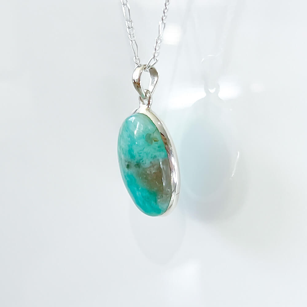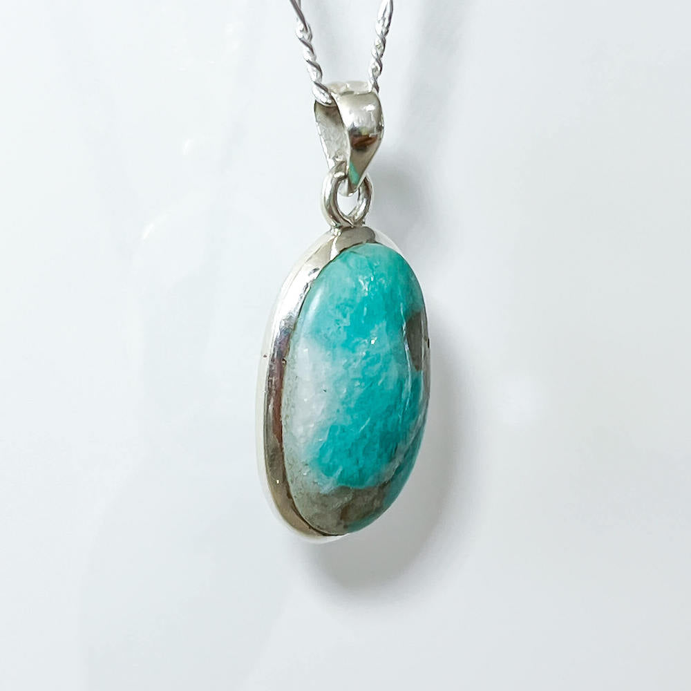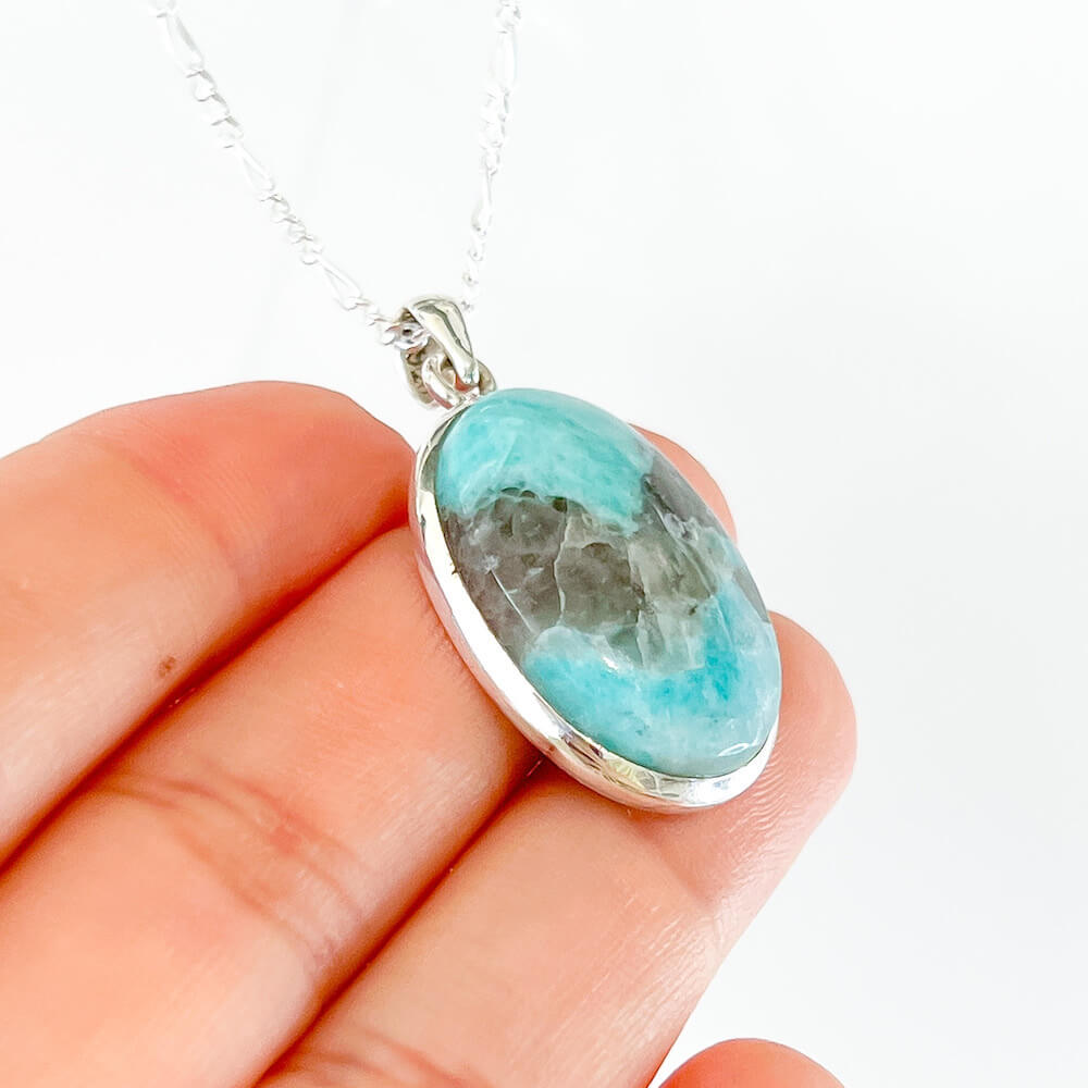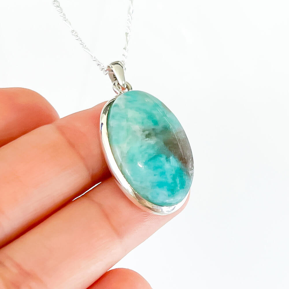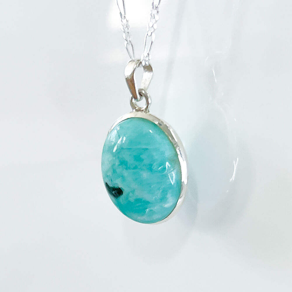 Magnífico bisel de piedra amazonita de primera calidad engarzado en plata de ley y colgado de una cadena de plata de ley.