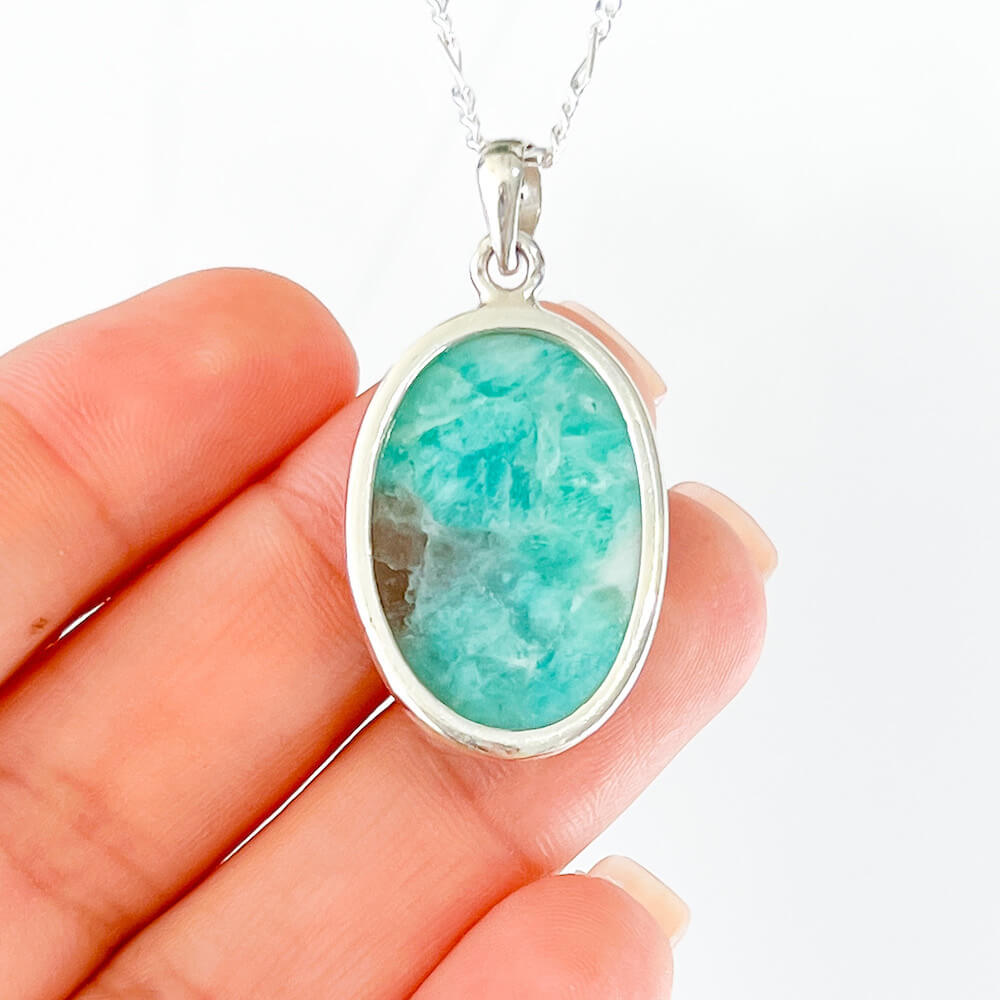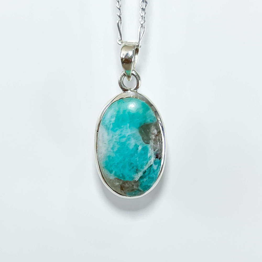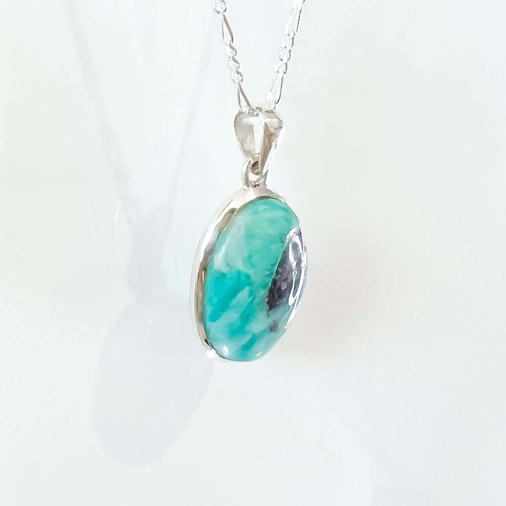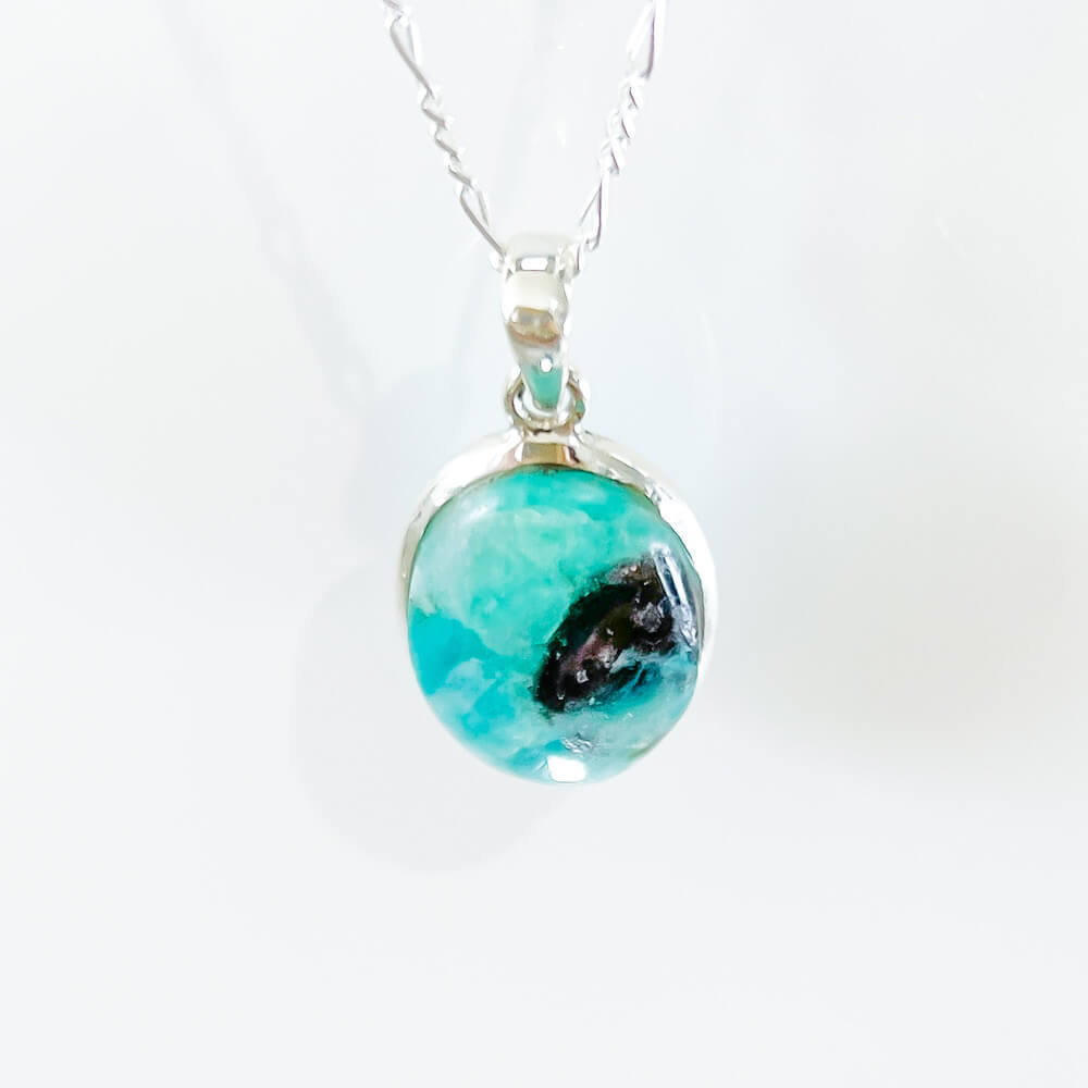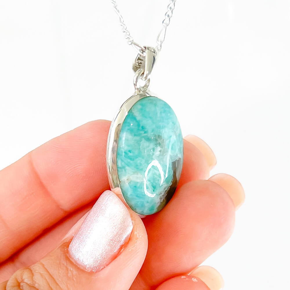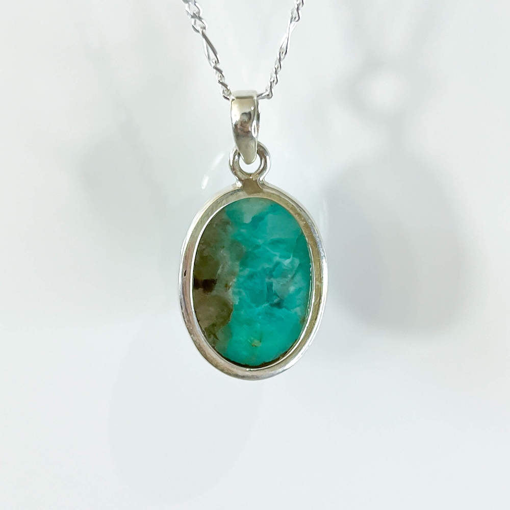 Magnífico bisel de piedra amazonita de primera calidad engarzado en plata de ley y colgado de una cadena de plata de ley.