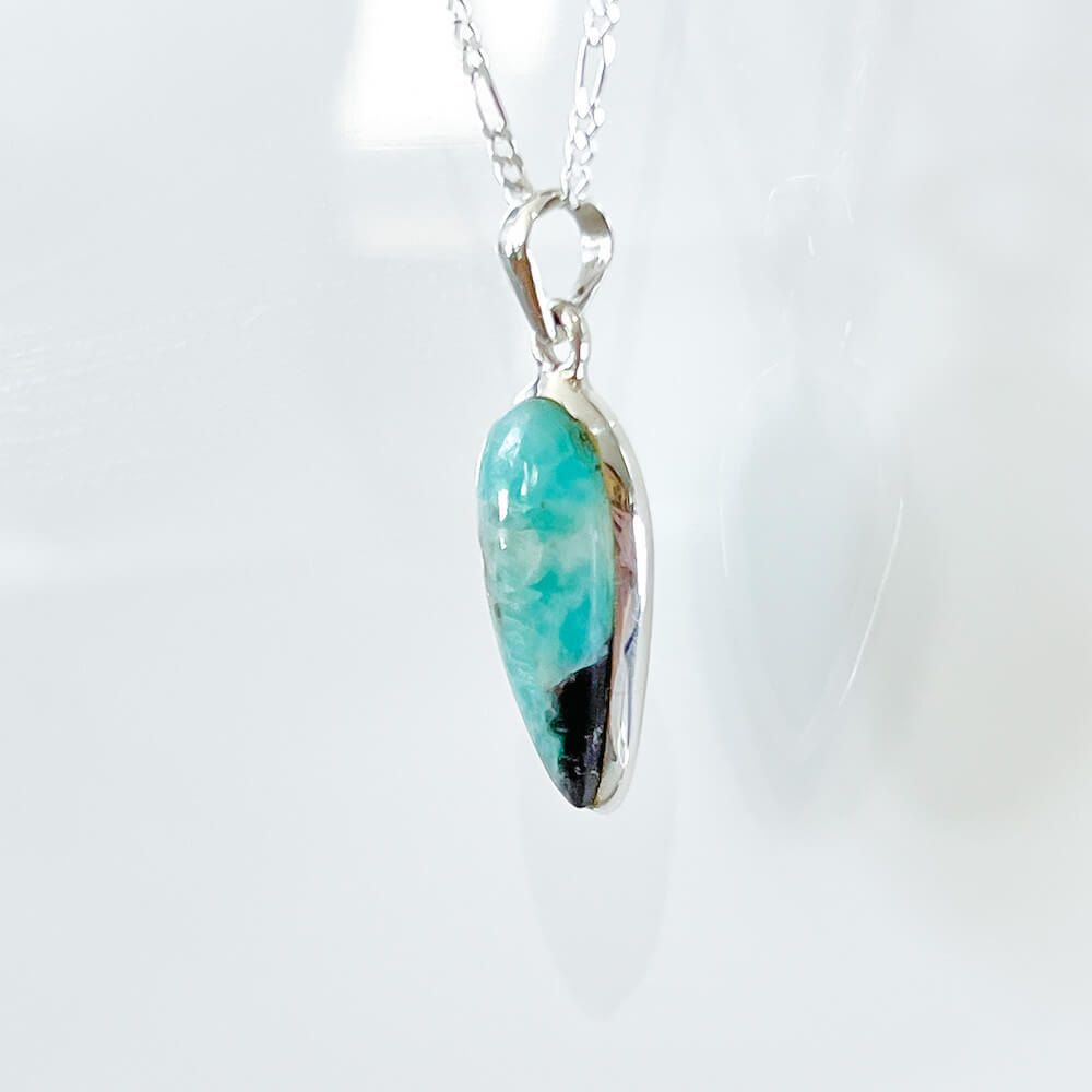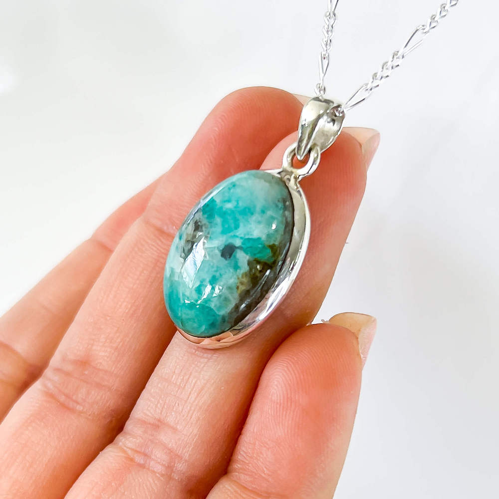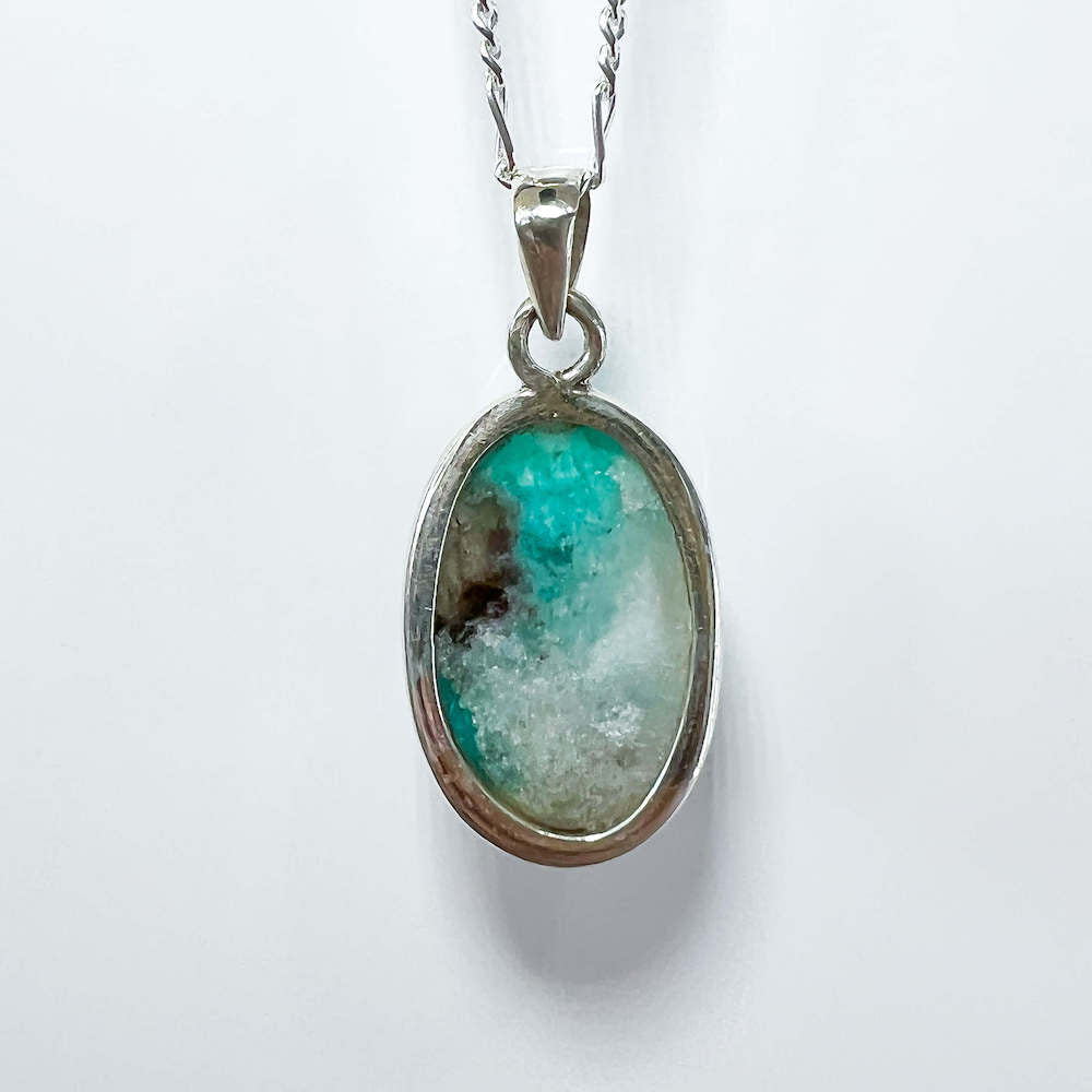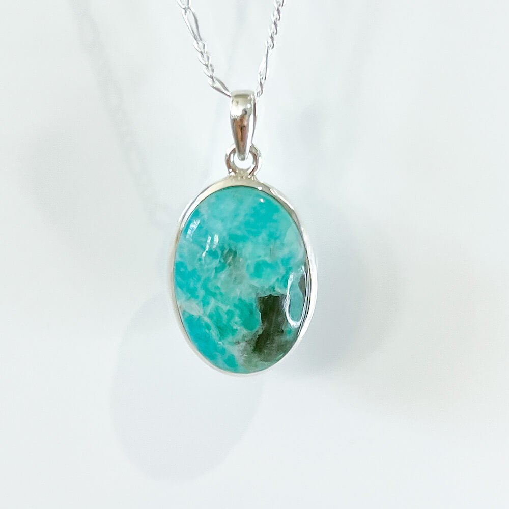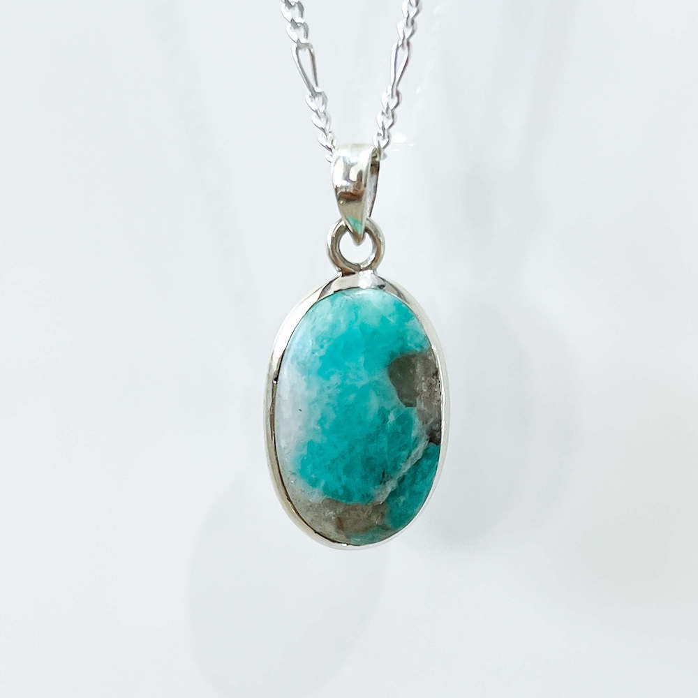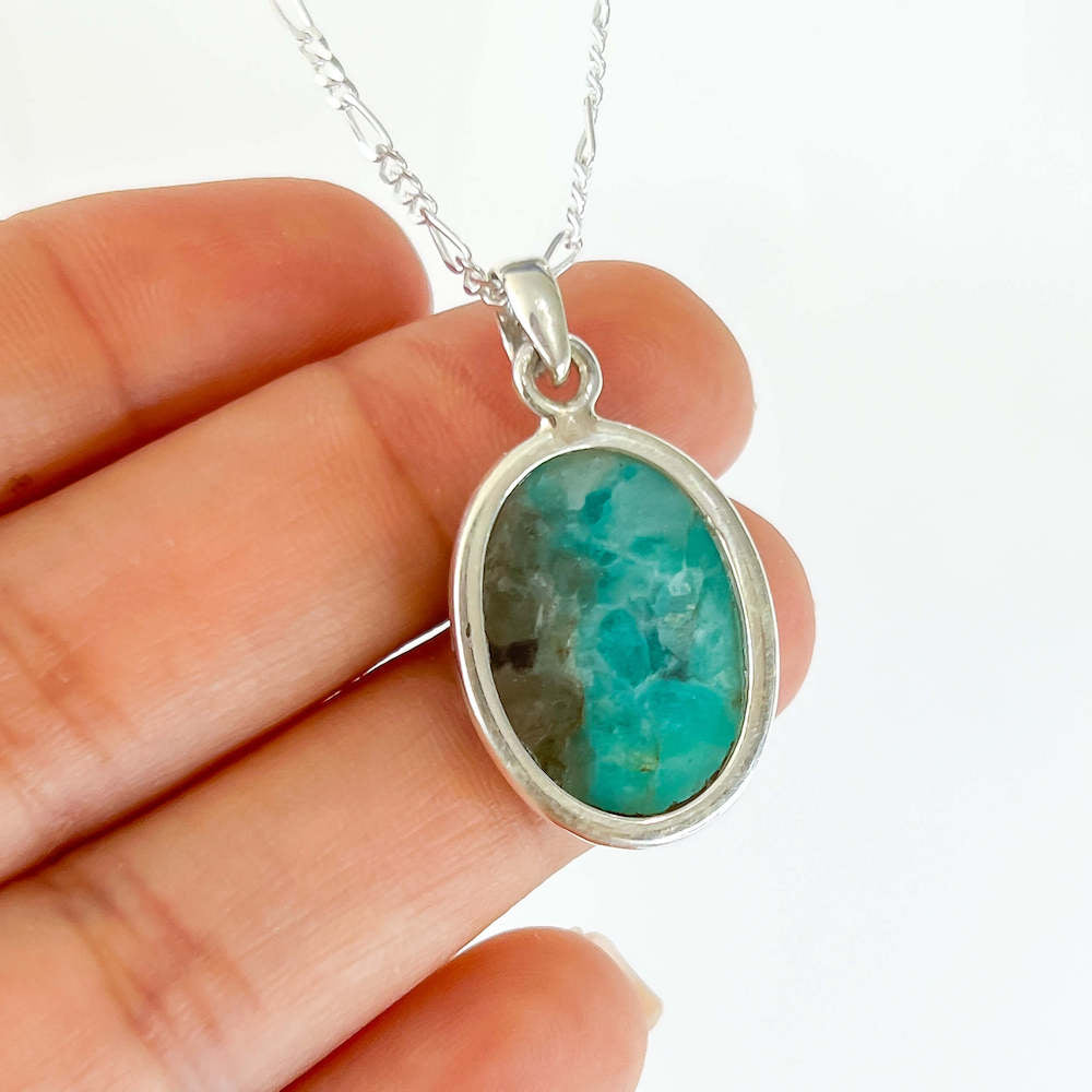 Magnífico bisel de piedra amazonita de primera calidad engarzado en plata de ley y colgado de una cadena de plata de ley.